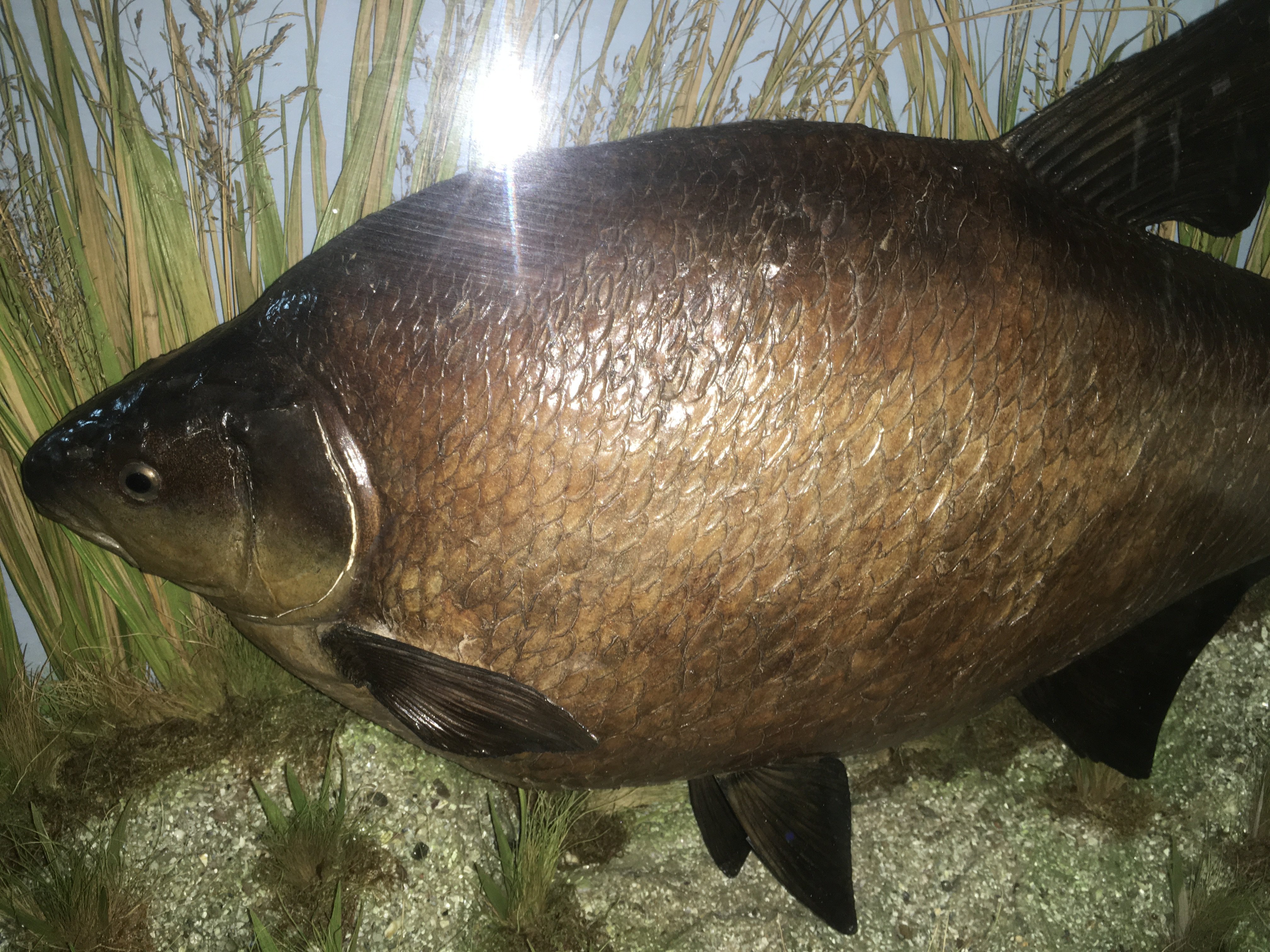 A cased taxidermy Bream, label reads Common Bream found by G.Stoddart in East Midlands Lake Nottingham , April 1997. Case dimensions 86cm wide 22cm deep 48cm tall. Cased by A.J Hall Naturalist 12 Helmsdale Road Romford Essex. This lot cannot be posted