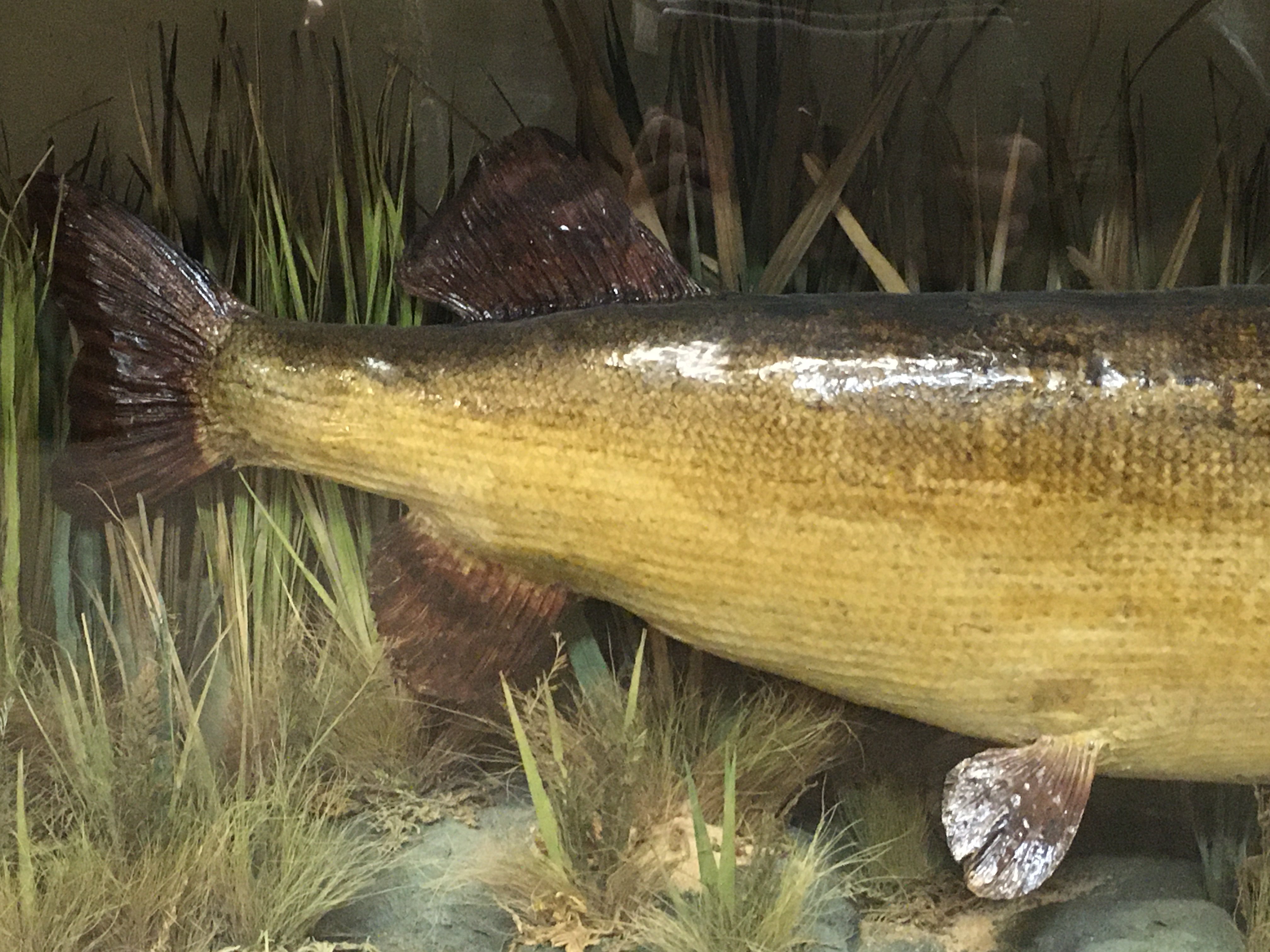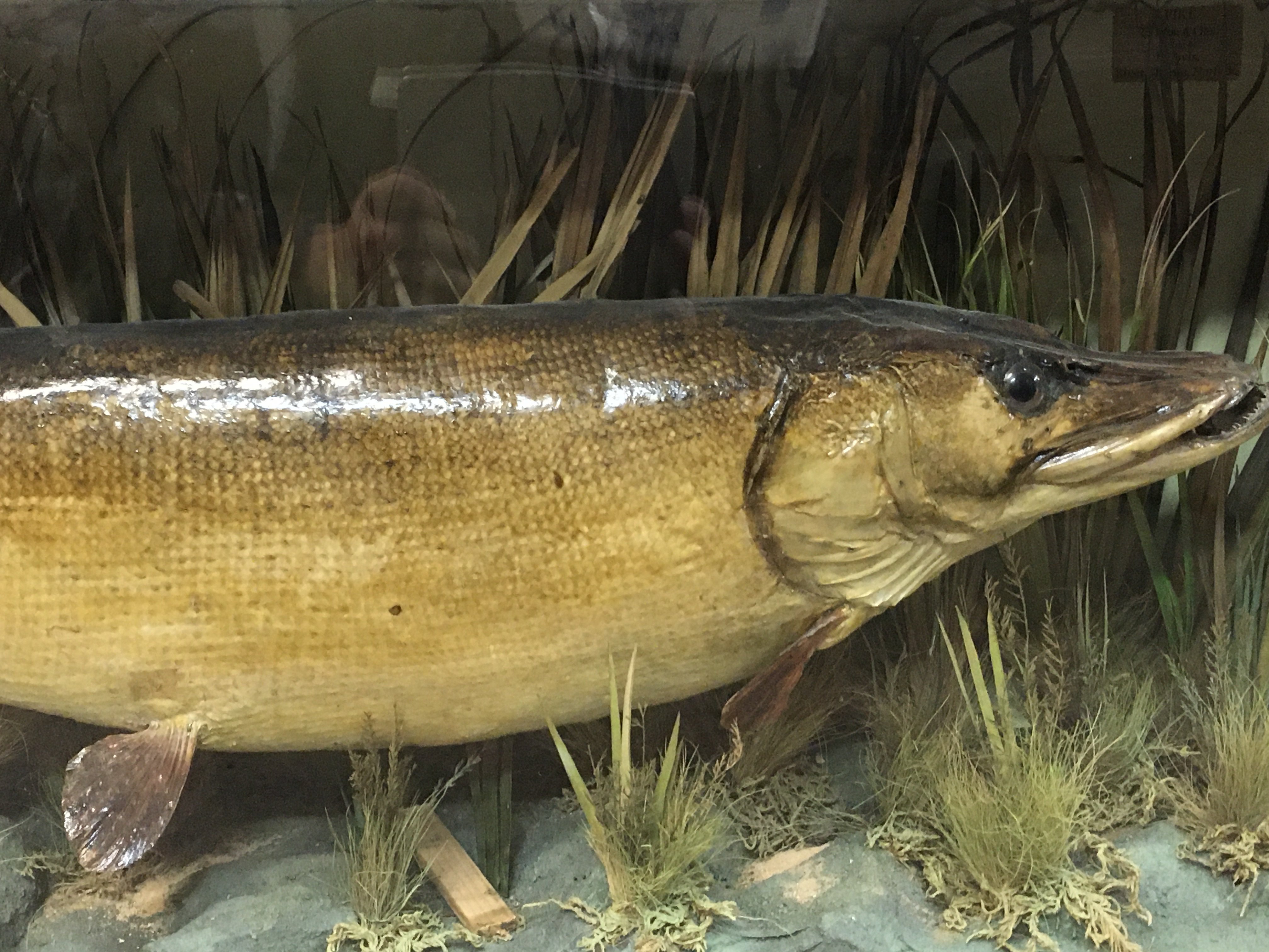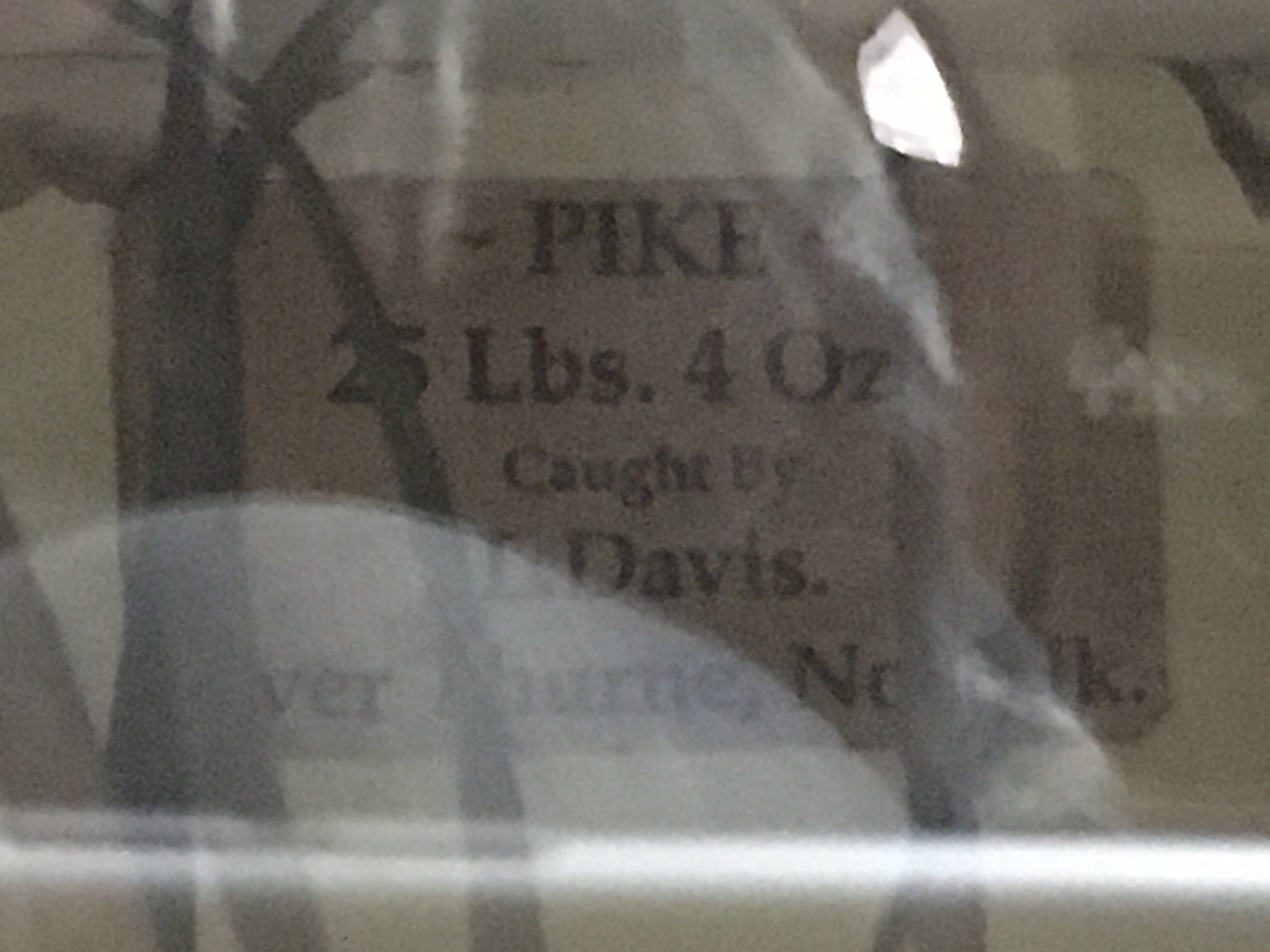 A large cased taxidermy Pike in a bow glass case. Label reads Pike 25 Lbs 4 Ozs caught by L.Davis River Thurne Norfolk. Preserved by A.J Bond. 117cm wide 50cm tall 28cm deep. This lot cannot be posted