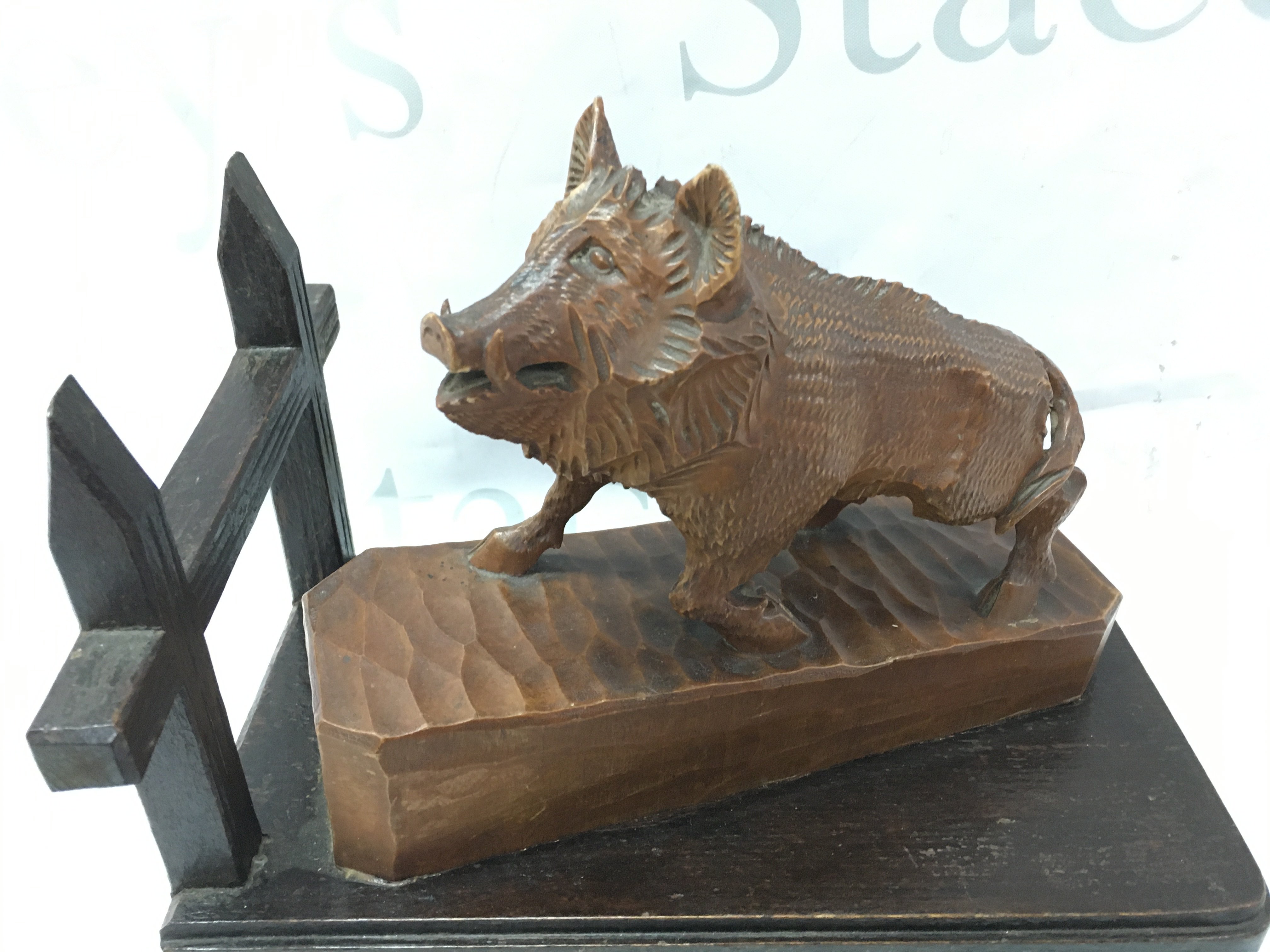 A pair of black forest carved book ends in the form of wild boars ,19.5cm tall 24cm wide . Postage cat C