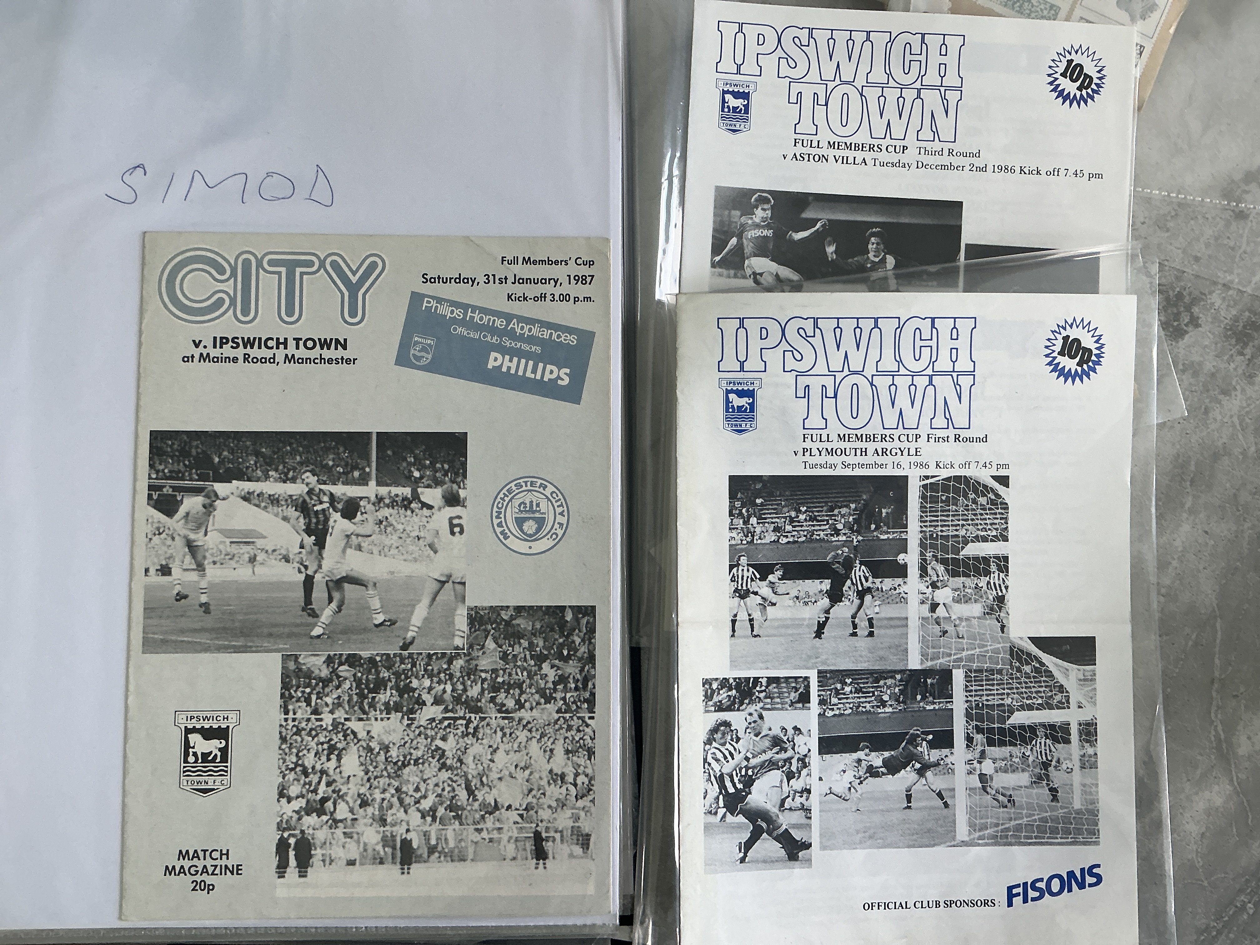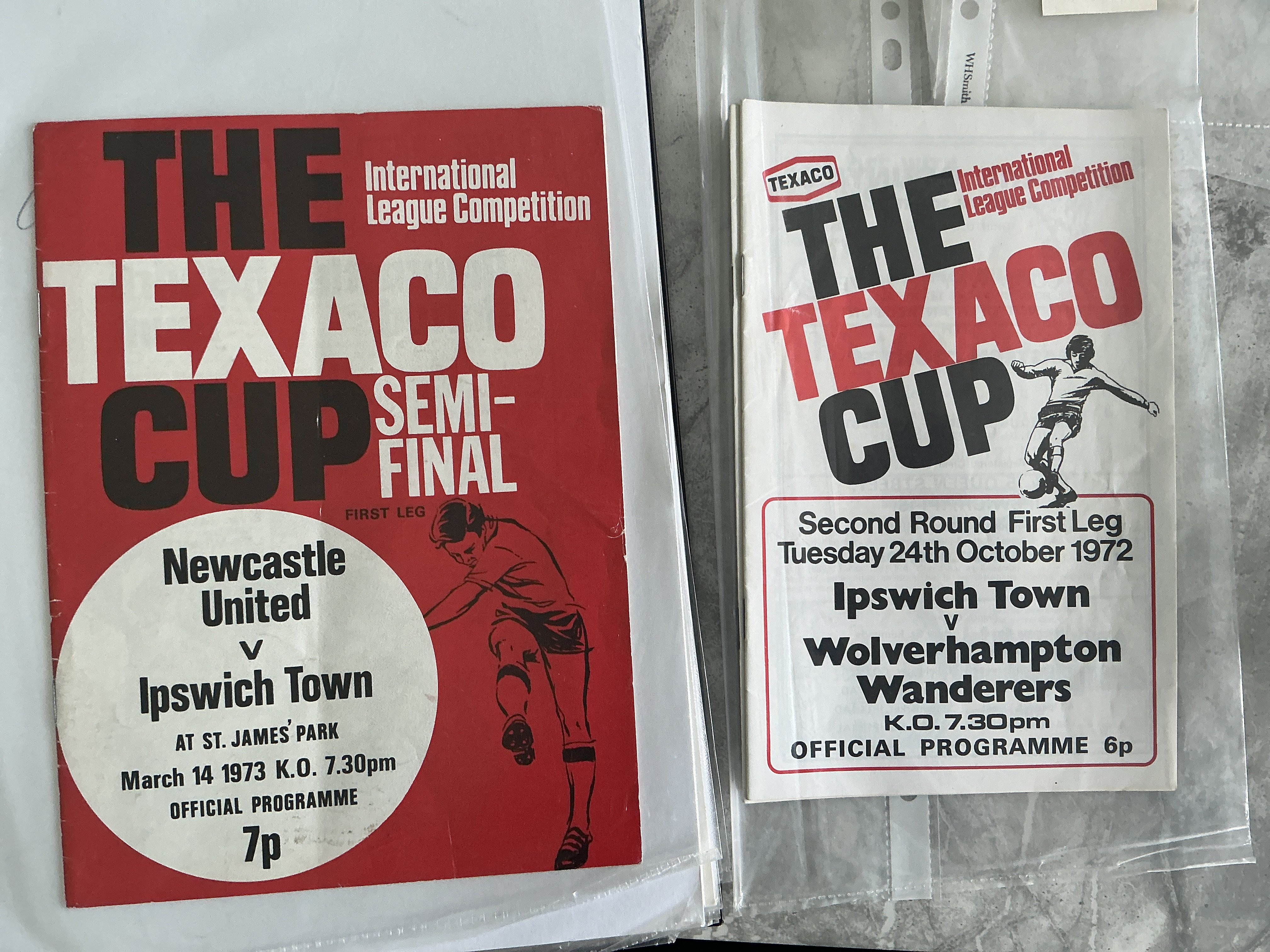 Ipswich Town Minor Cup Football Programmes: Folder containing Texaco Cup, Willhire Cup, Full Members Cup, Simod Cup, Zenith Data Cup and Anglo Italian Cup. Home and away in excellent condition. (28)