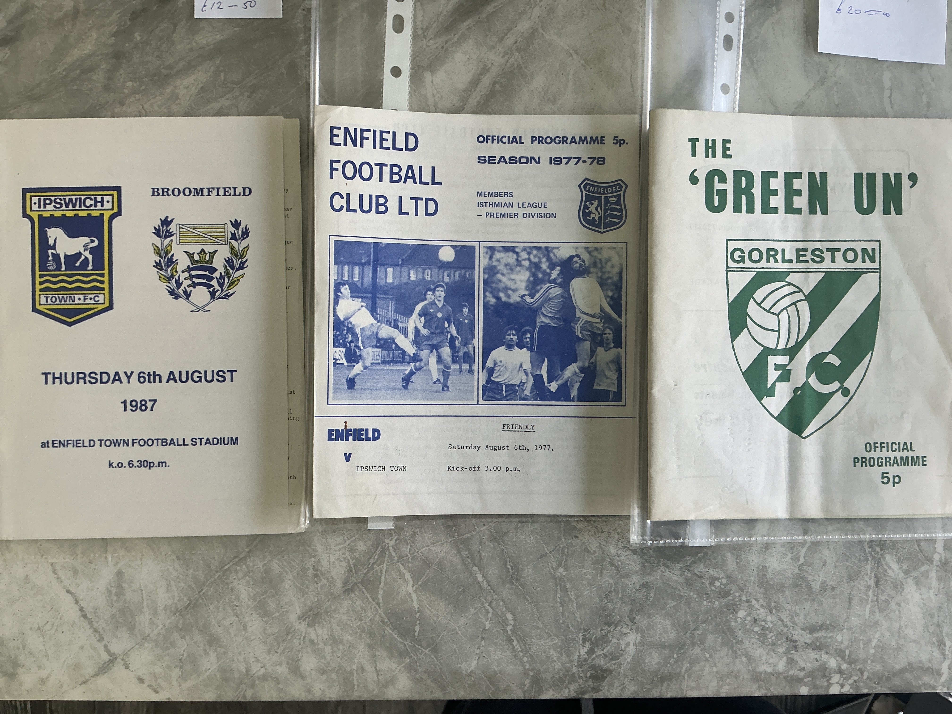 Ipswich Town Reserve Away Friendly Football Programmes: Collectors folder containing an unusual collection from 69/70 to date. Some harder to obtain issues include 69/70 Bedford single sheet 70/71 Chelmsford, 71/72 Margate, 72/73 + 74/75 Romford, 75/76 Gorleston. Whilst it does not always state reserves it is collectors opinion a reserve team was fielded. Very good. (70)