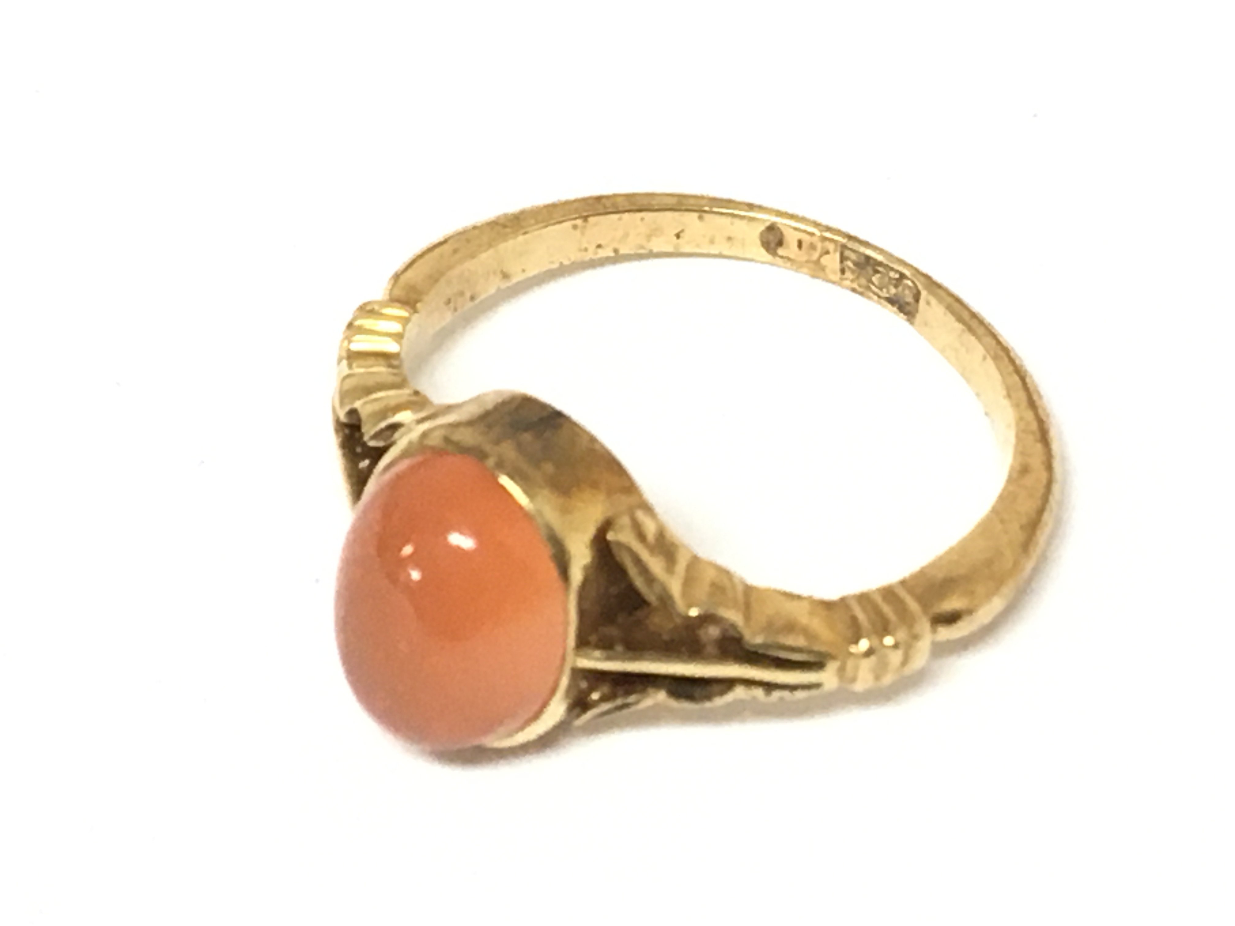 A gold ring set with orange opal. Size J 1/2 and 3g