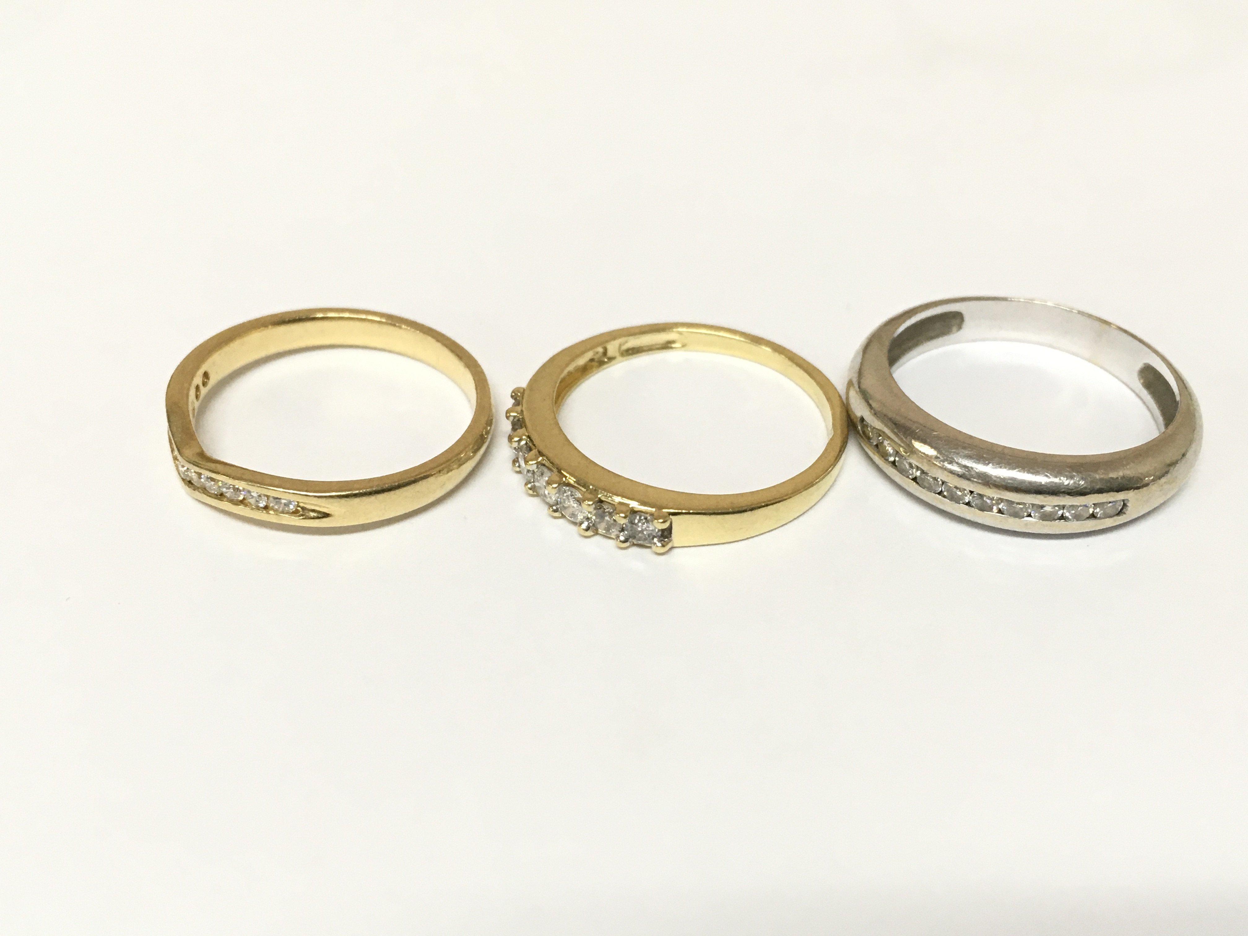 Three diamond half hoop diamond rings. Approximately 9.9g and Sizes M N and O