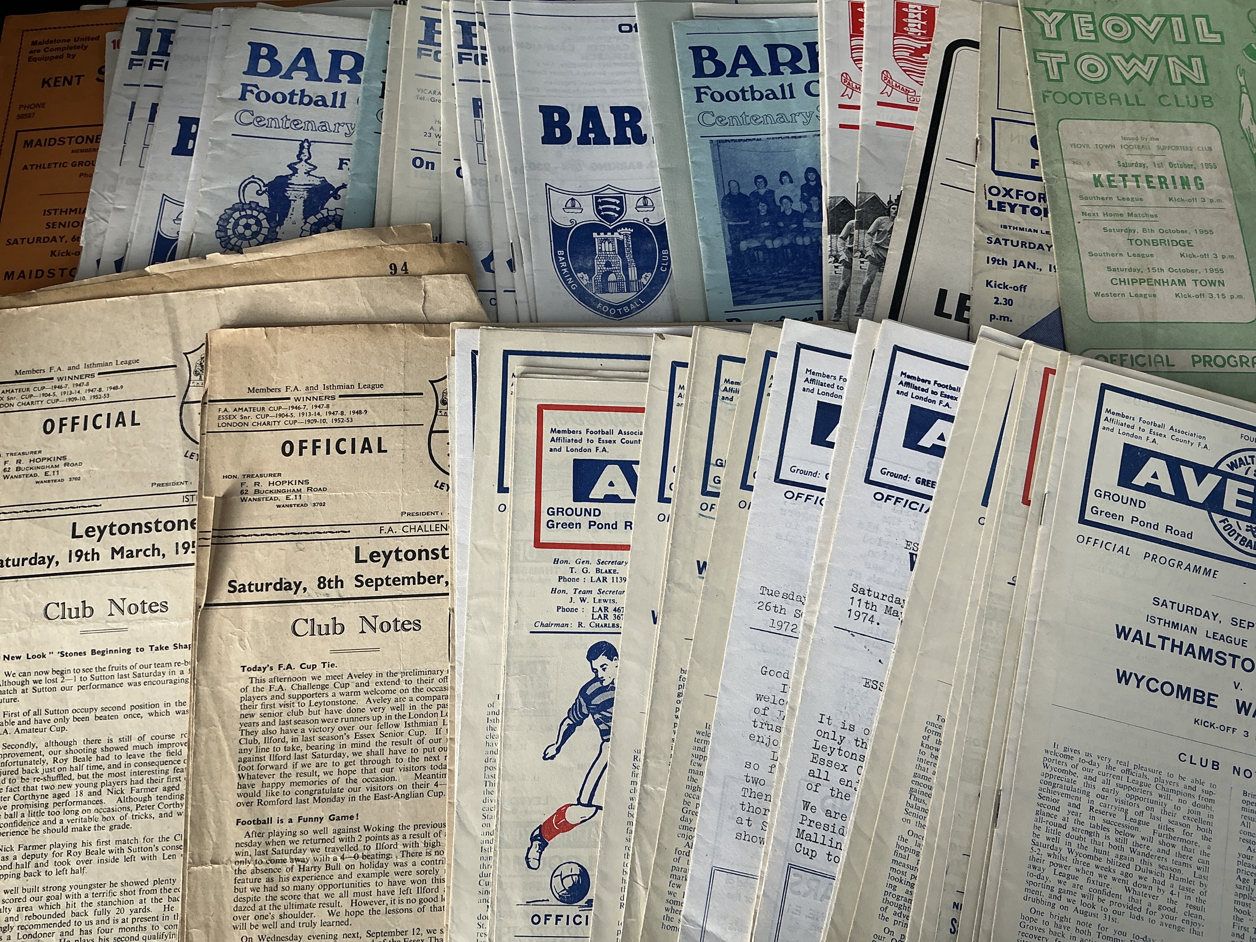 Non League Football Programmes: Nearly all 1050s to 1970s with full list of breakdown with online picture. Includes 50s homes from Kettering Tooting a Wycombe Tilbury Walthamstow Yeovil Barking Clapton and Leytonstone. Good. (220+)