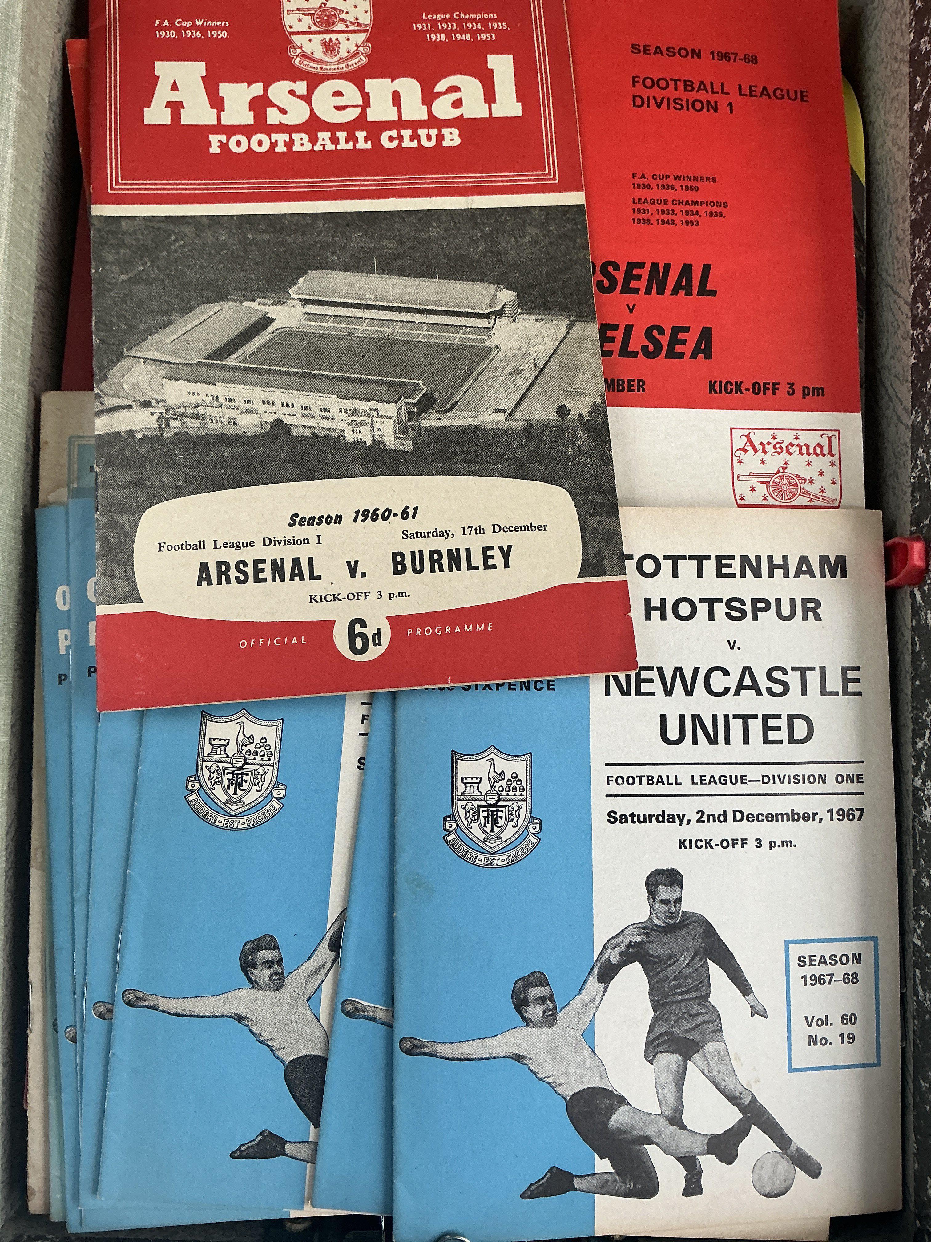Football Programme Boxes: 31 Chelsea homes from the late 60s, over 40 West Ham homes from the 60s and 70s to include 1966 League Cup final and 62/63 Plymouth LC plus over 80 Tottenham from the same period. There are plenty more including big match from the 50s to the 90s. (2 boxes)