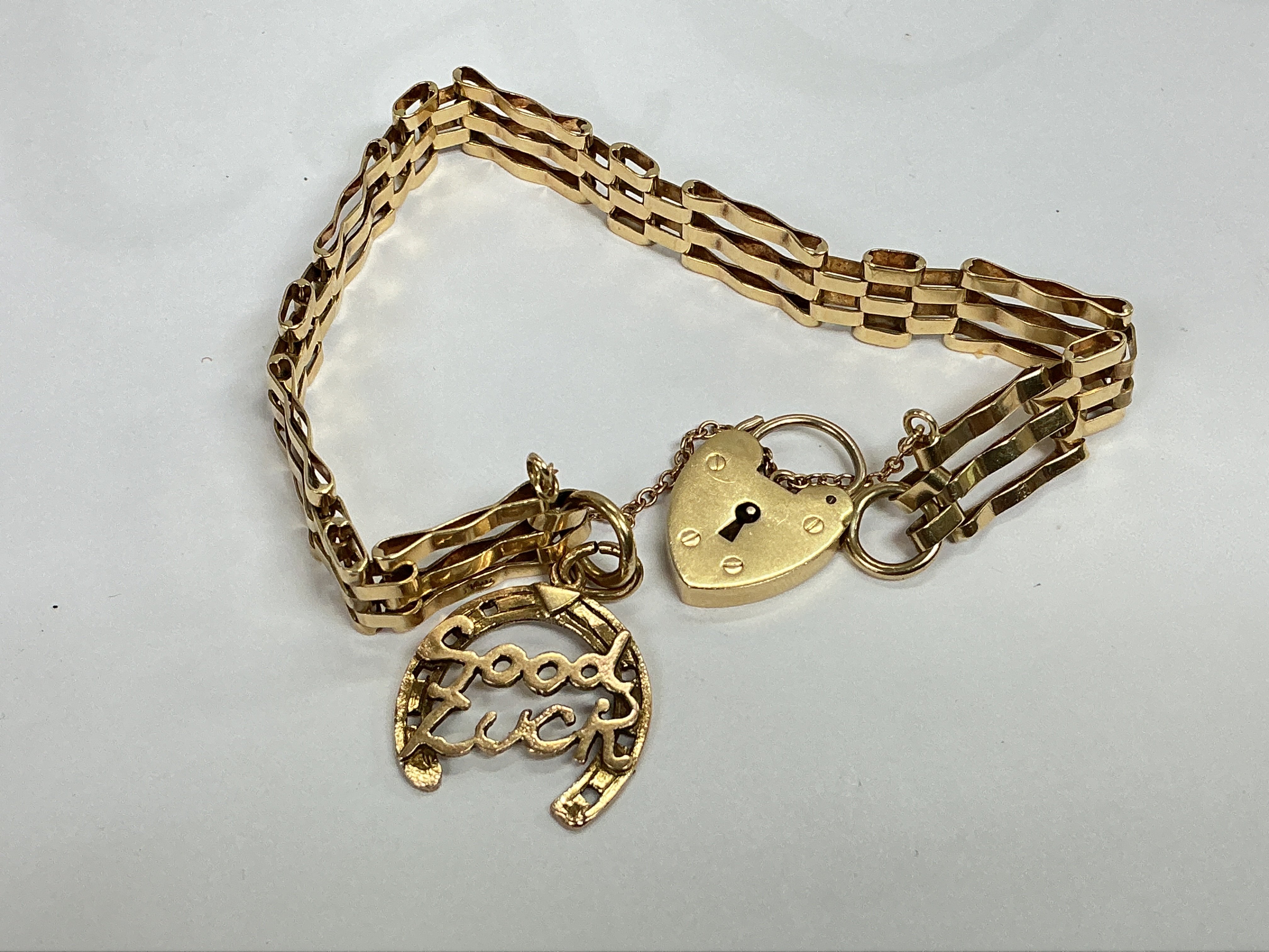 a 9ct gold gate bracelet with a good luck horse shoe charm attached. Approx weight 12.60. Length 7inches.