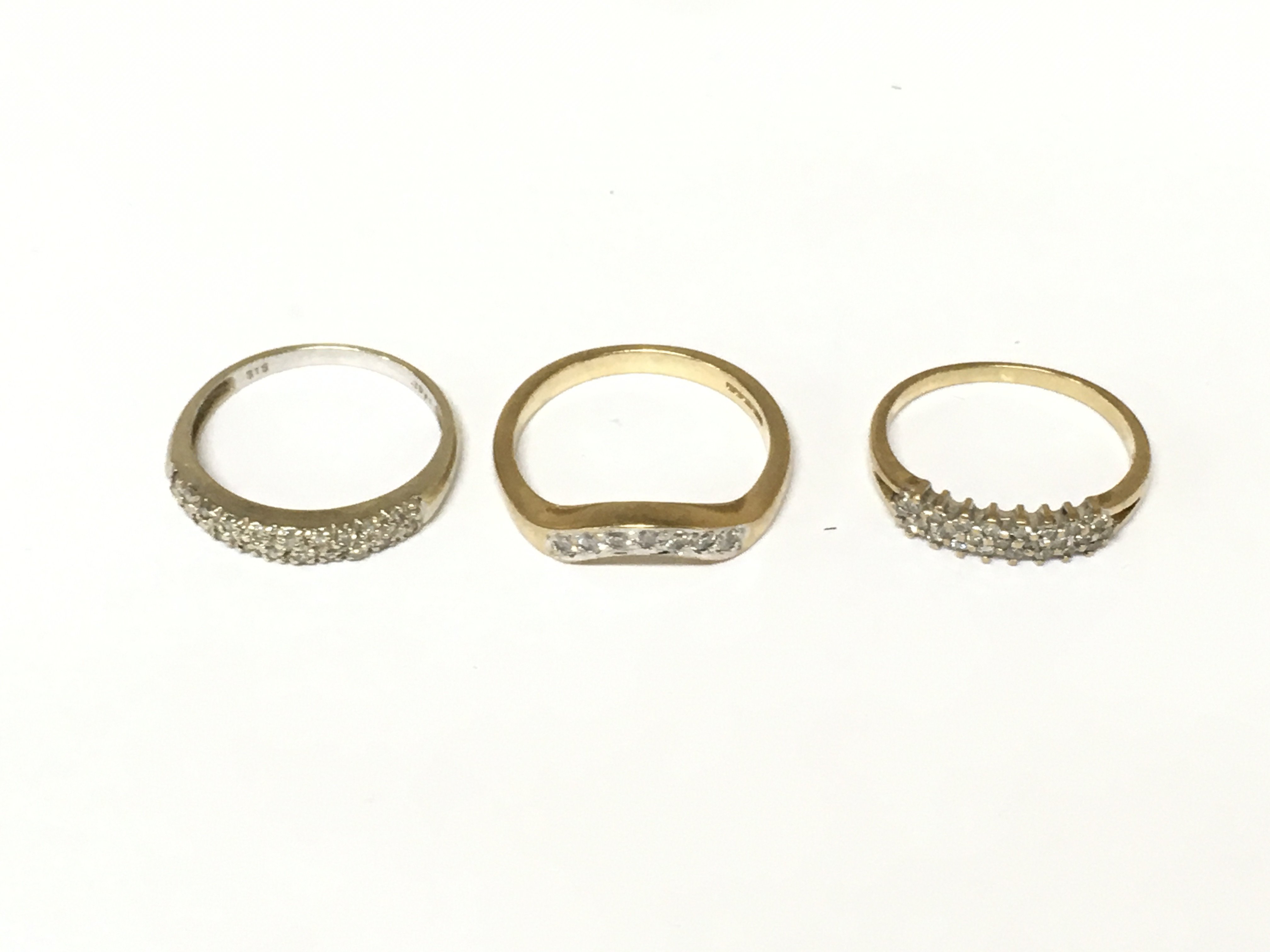Two 9ct gold diamond band rings and a 9ct white stone ring. Approximately 6.6g sizes M and O