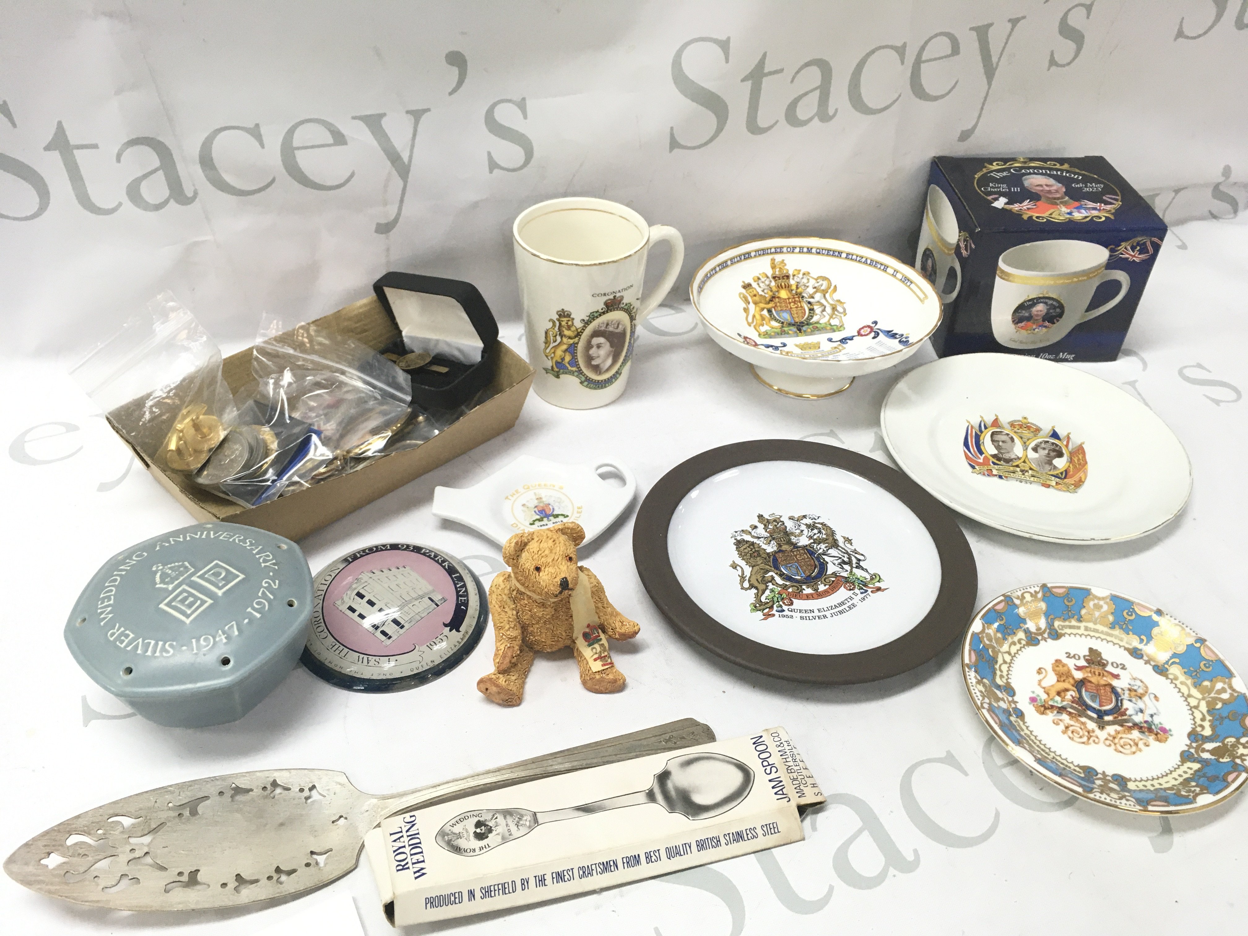 A Collection of commemorative ware items including Ceramic plates, cups, jewellery and coins etc.