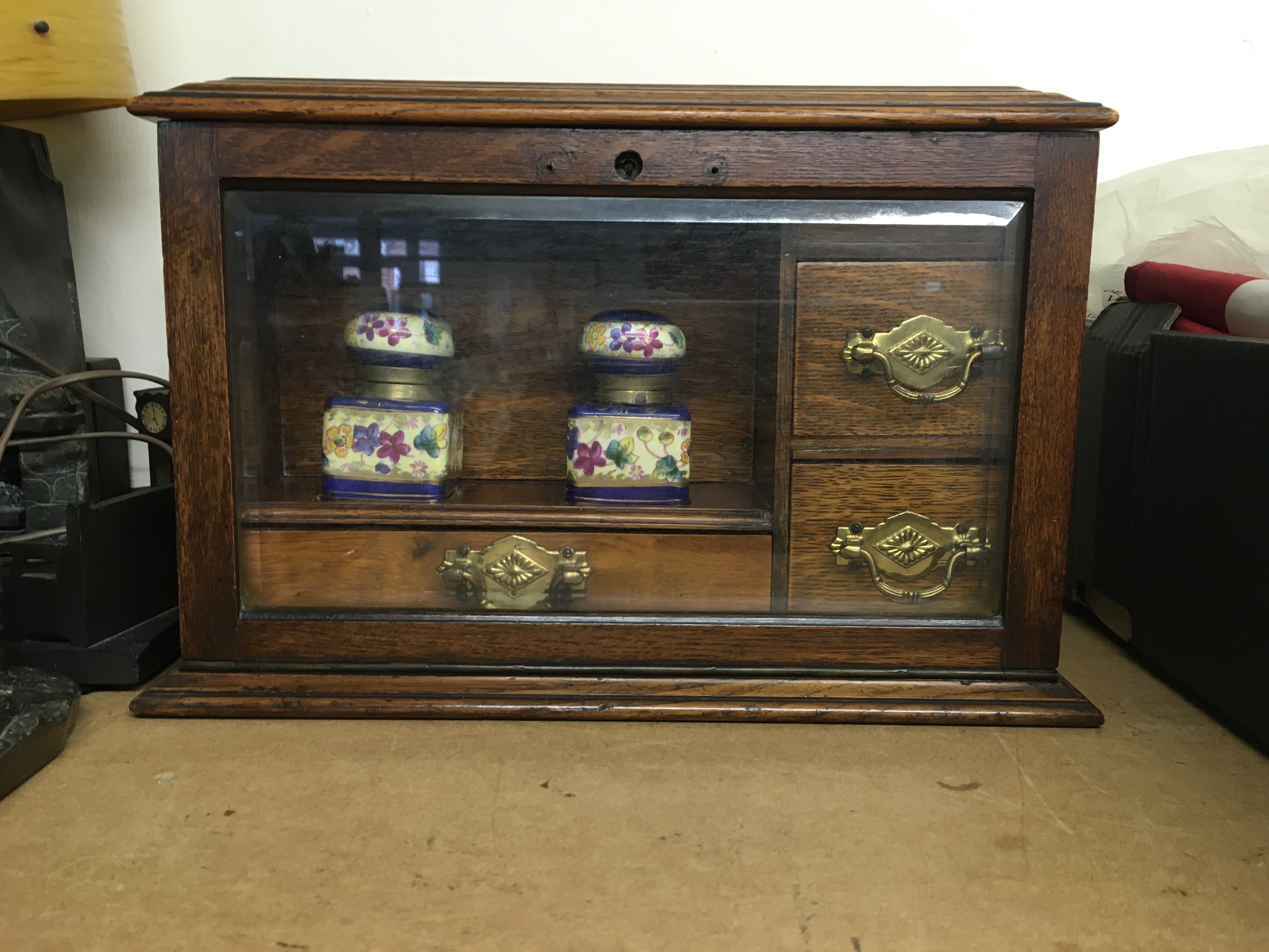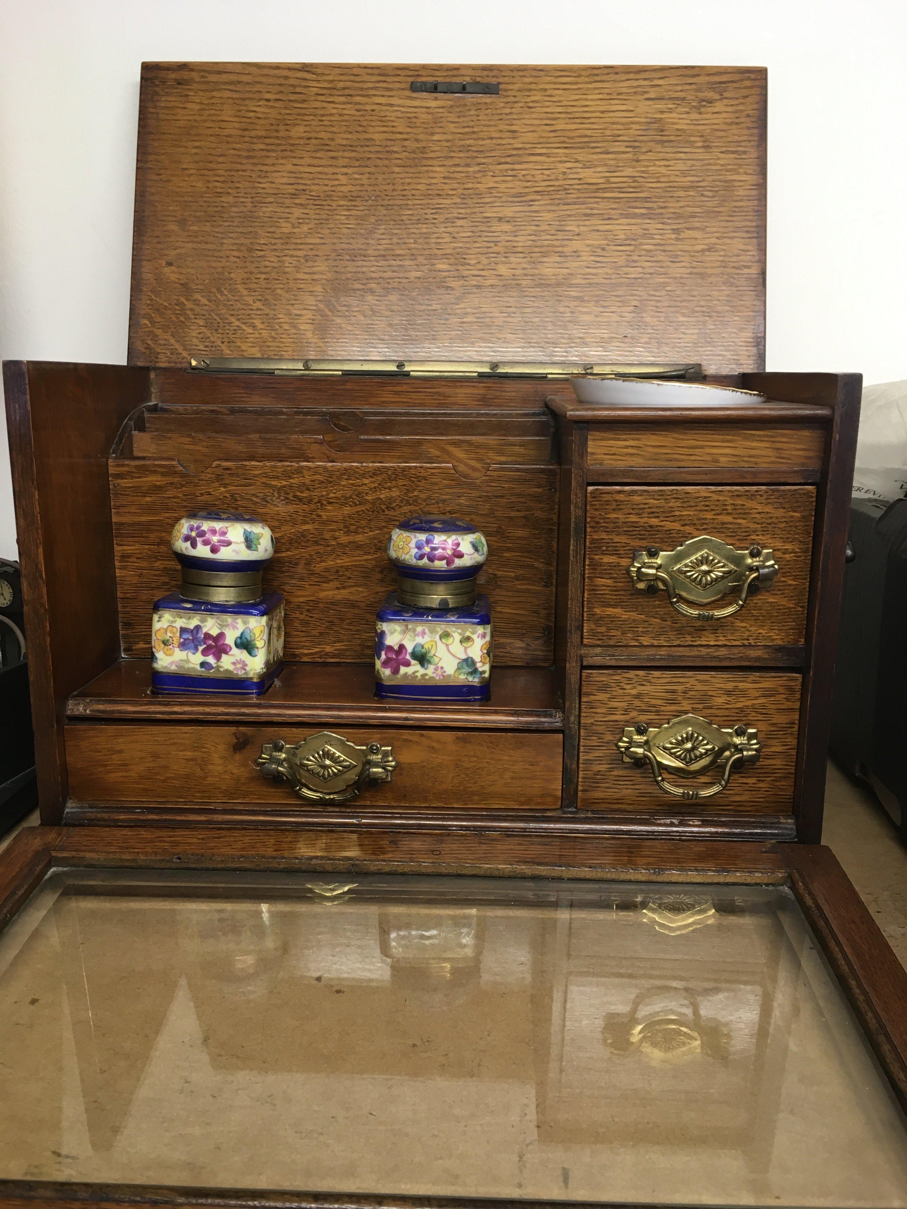 A oak stationary box inset with two inkwells fitted with three drawers.
