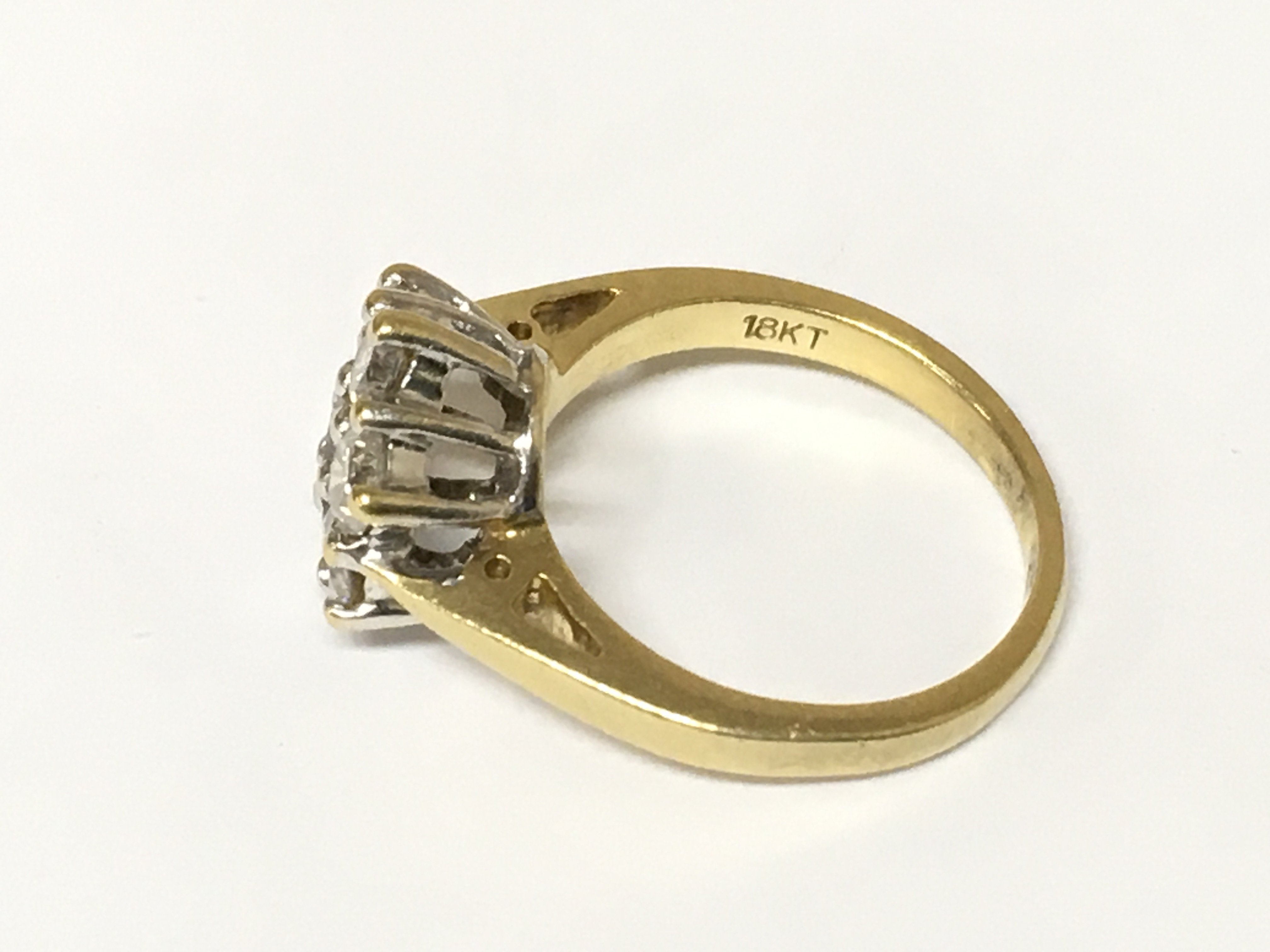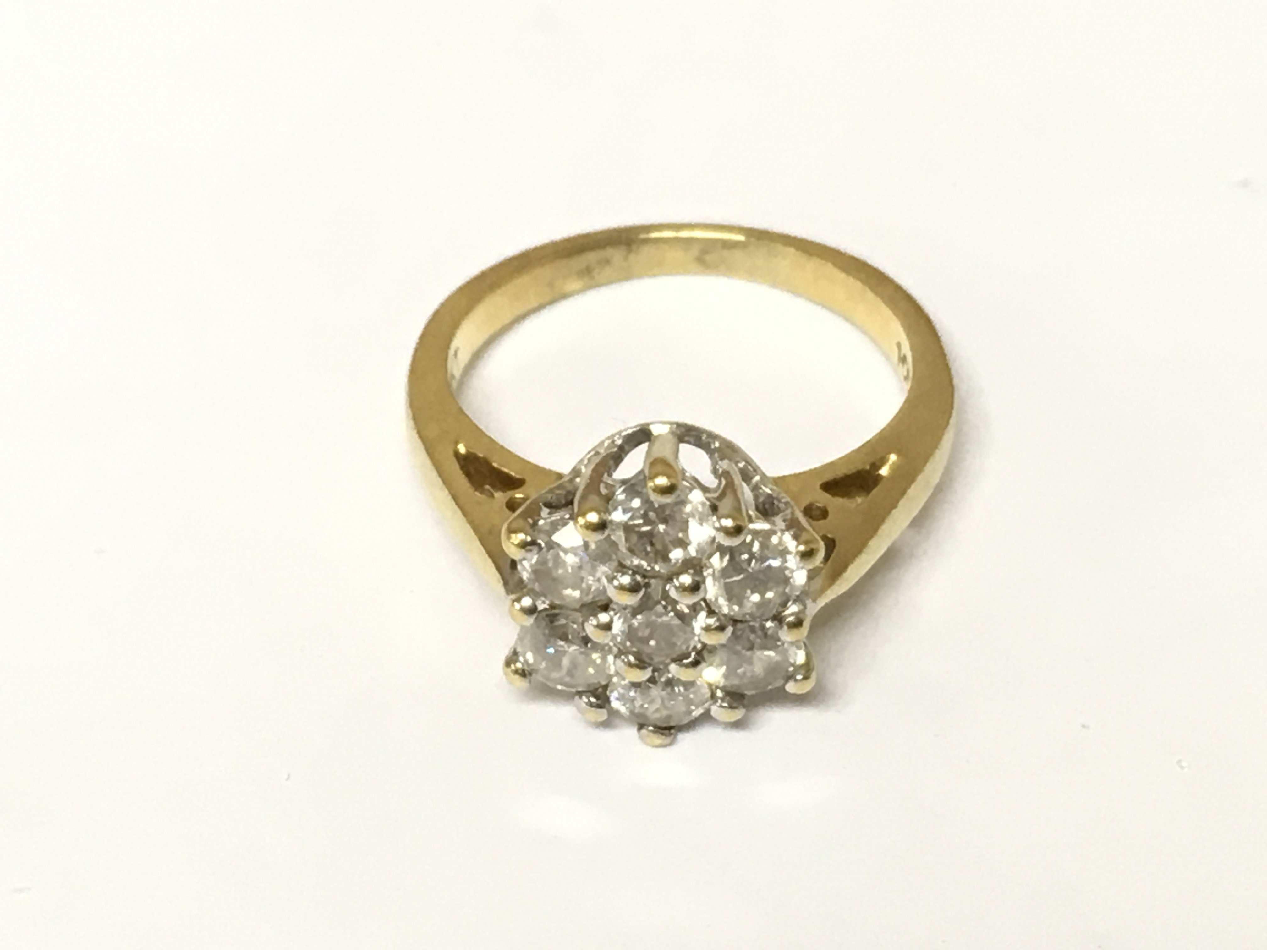 An 18ct gold diamond cluster ring 1ct diamonds. Approximately 3.9g and size I