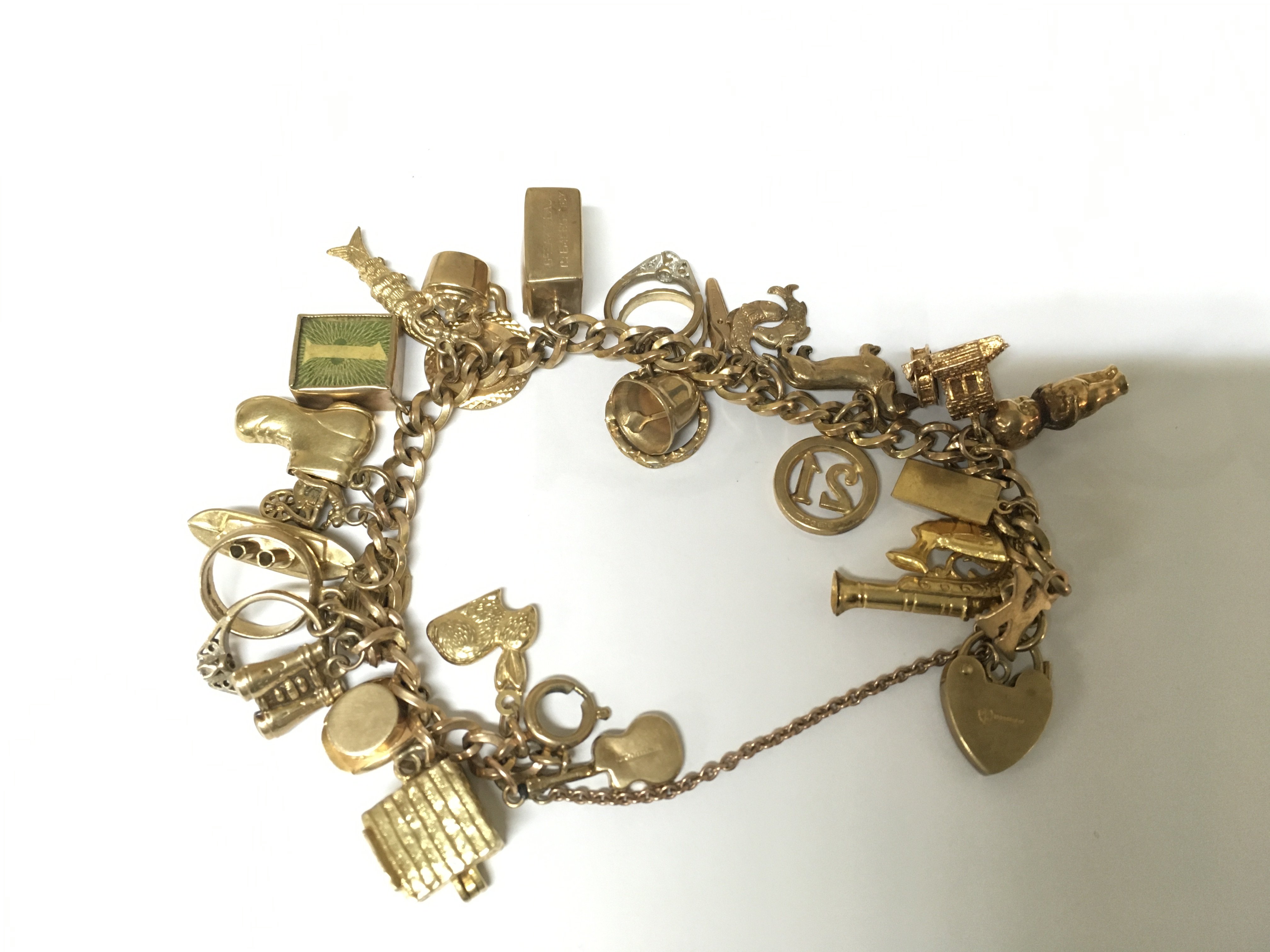 A 9ct gold charm bracelet set with assorted charms. 51g
