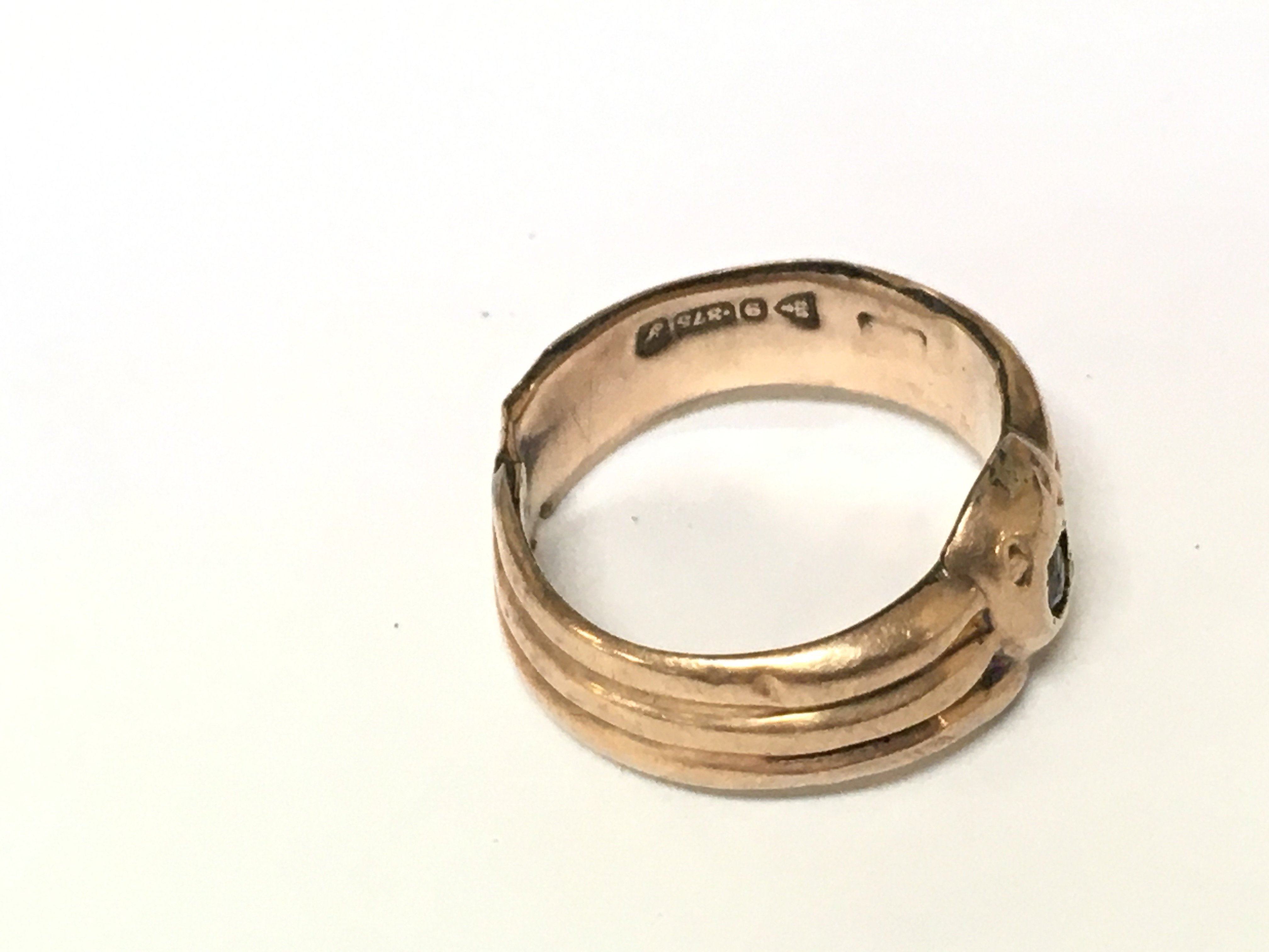 A 9ct gold ring of snake design set with a red stone. 2.75g size S
