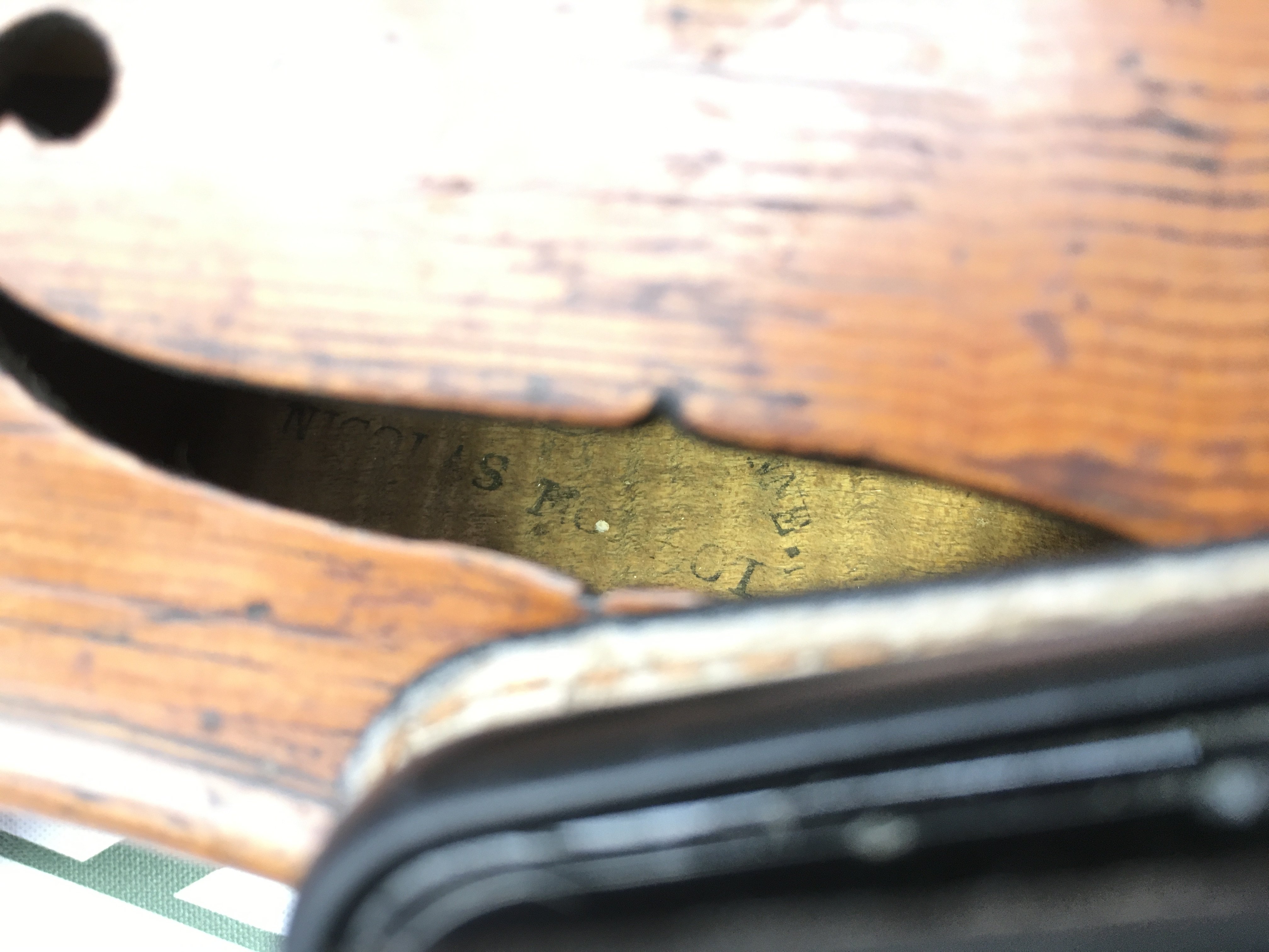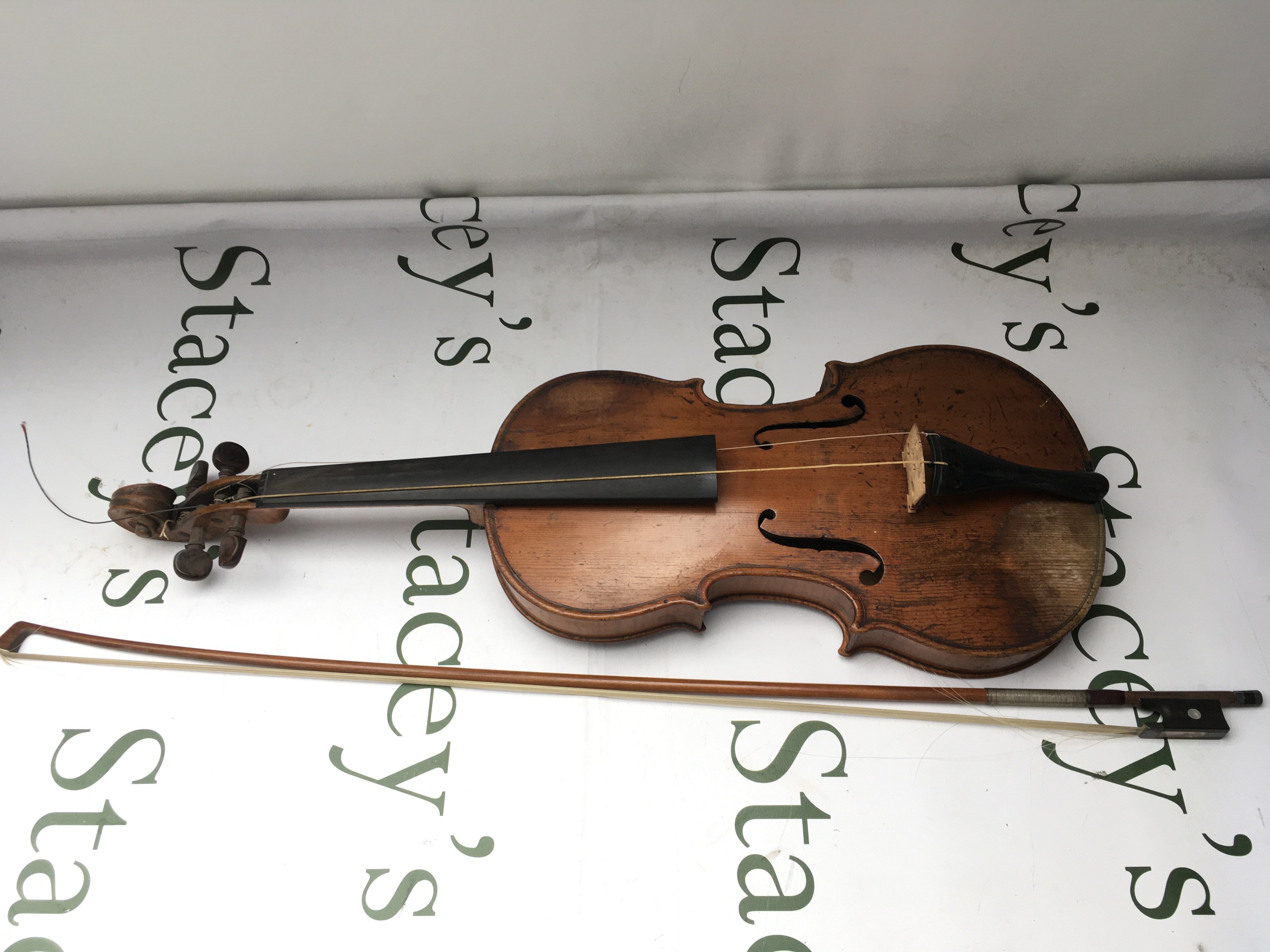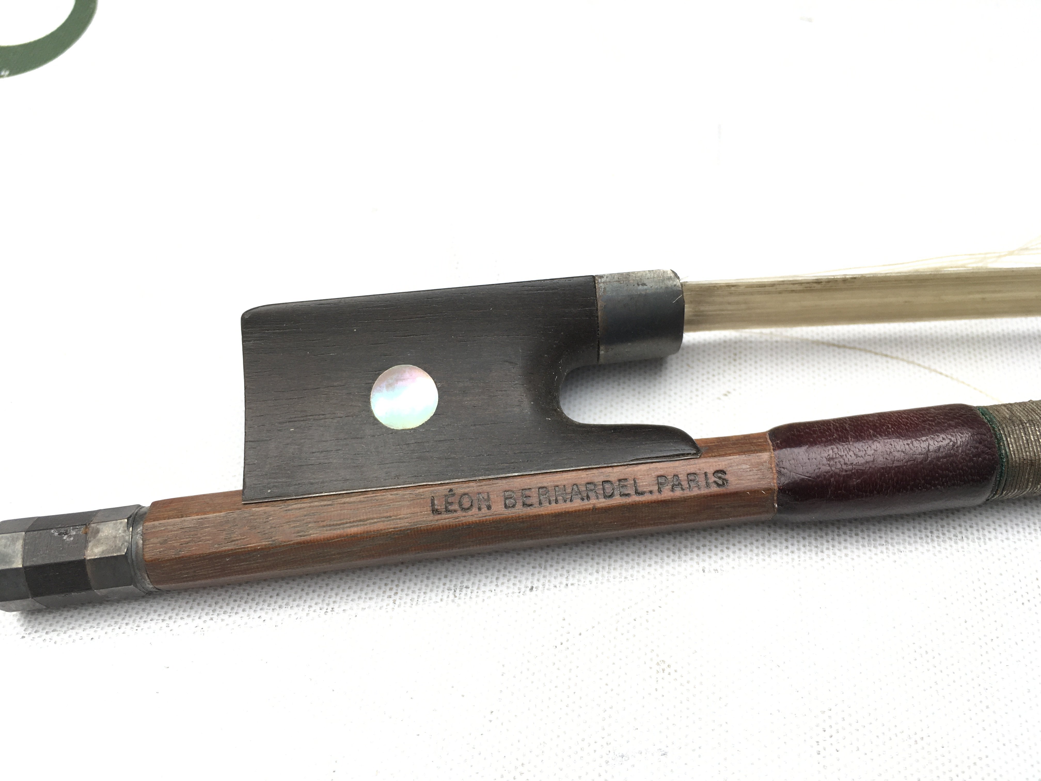 A violin and bow. Maker's name to inside of sound hole almost illegible, please see images. Make of bow is Leon Bernardel, Paris. No case.