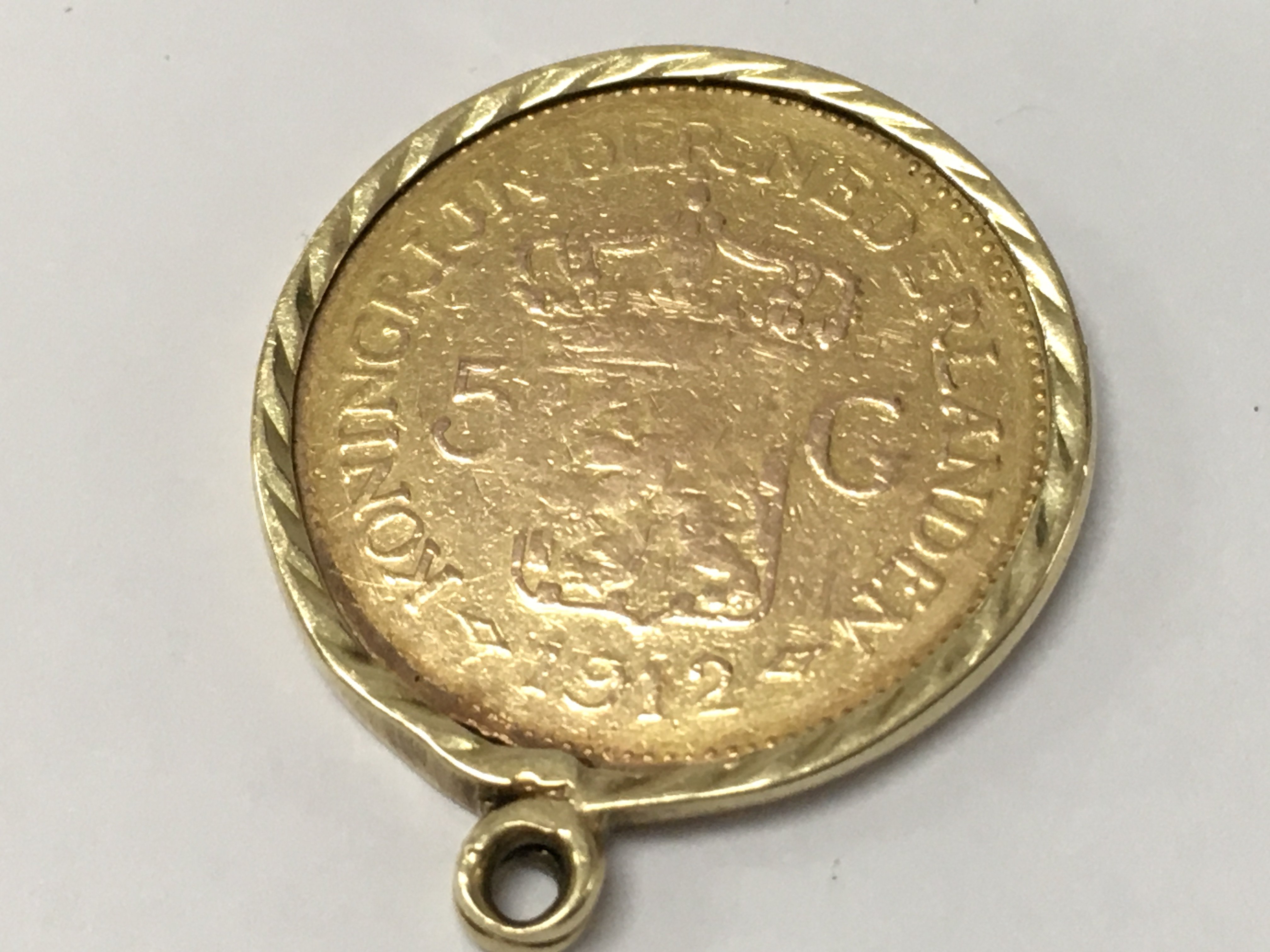 A 1912 Netherlands 5 Gulden Gold Coin in a mount, total weight 3.6g . Postage category A