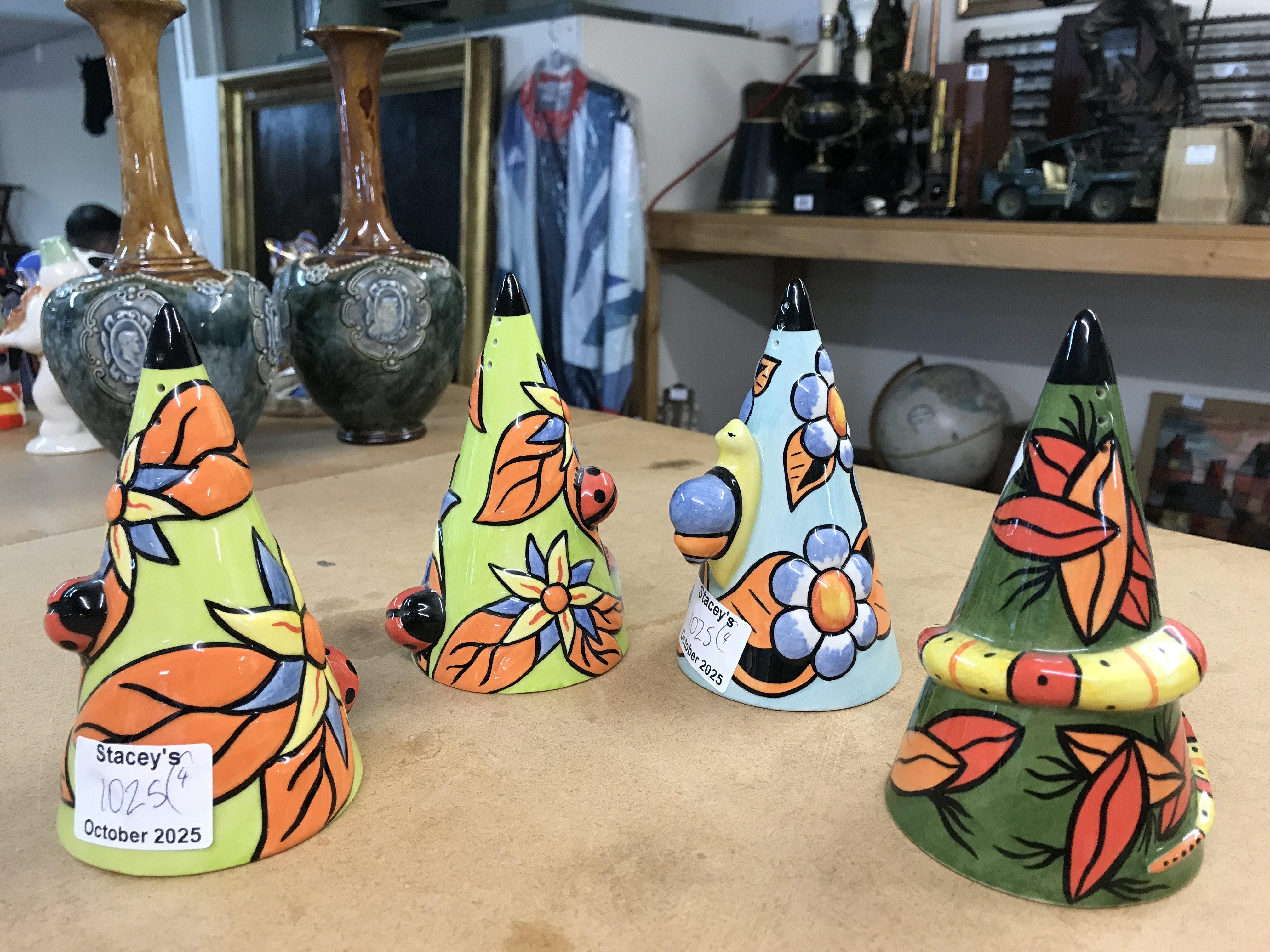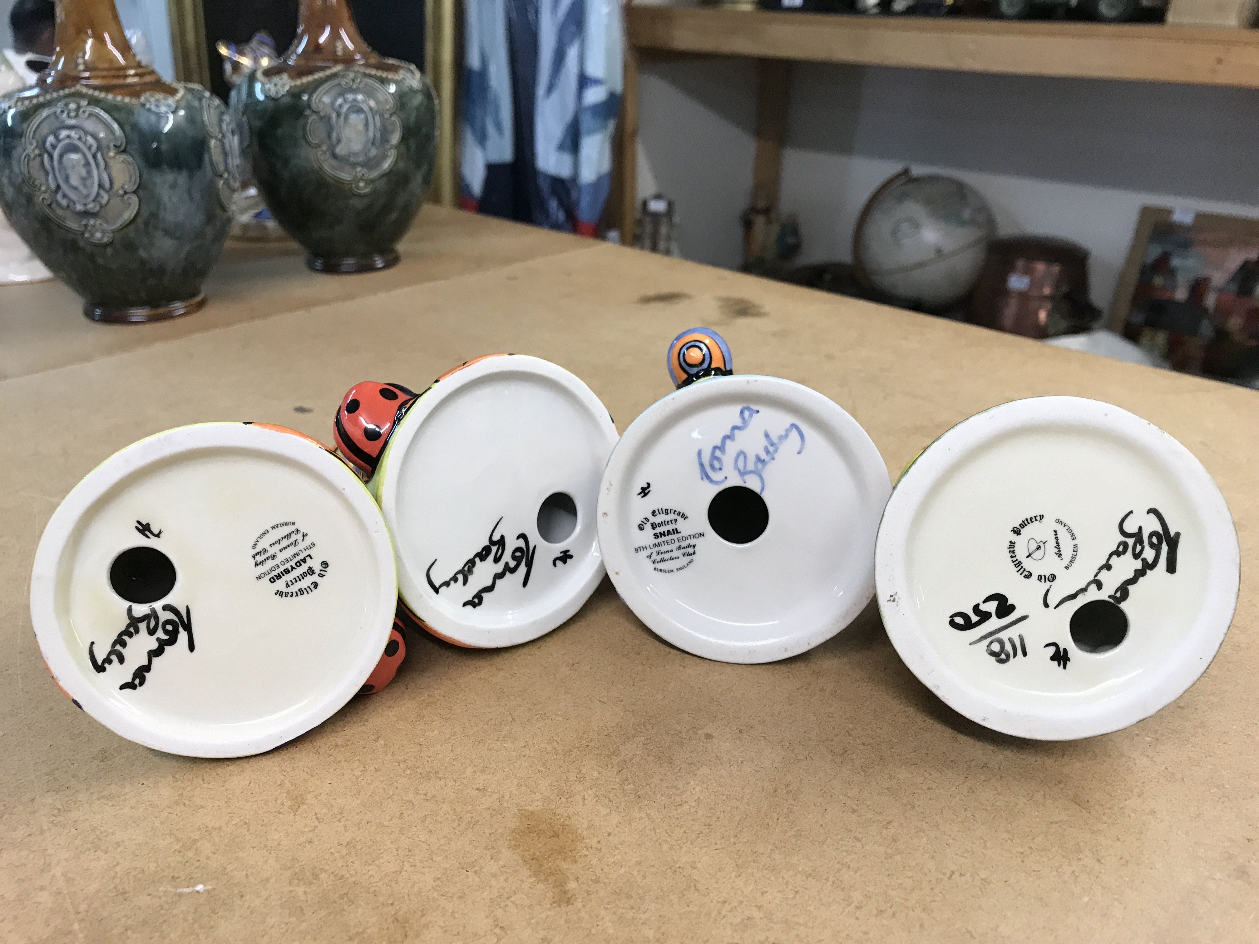 Four Lorna Bailey conical sugar shakers, including Limited Edition 118/250 = snake, 9th limited edition Snail, 6th limited edition Ladybird and one other ladybird shaker