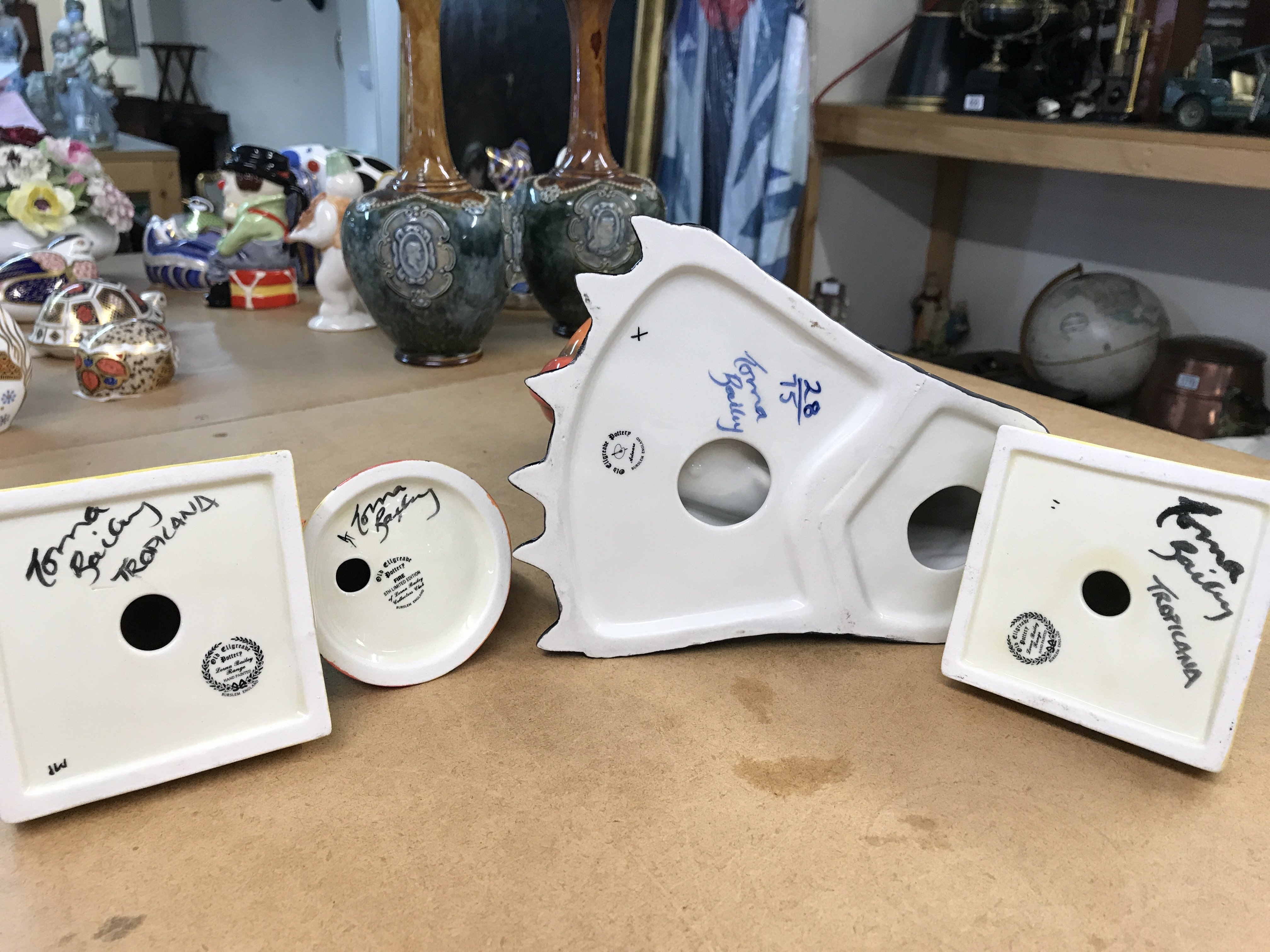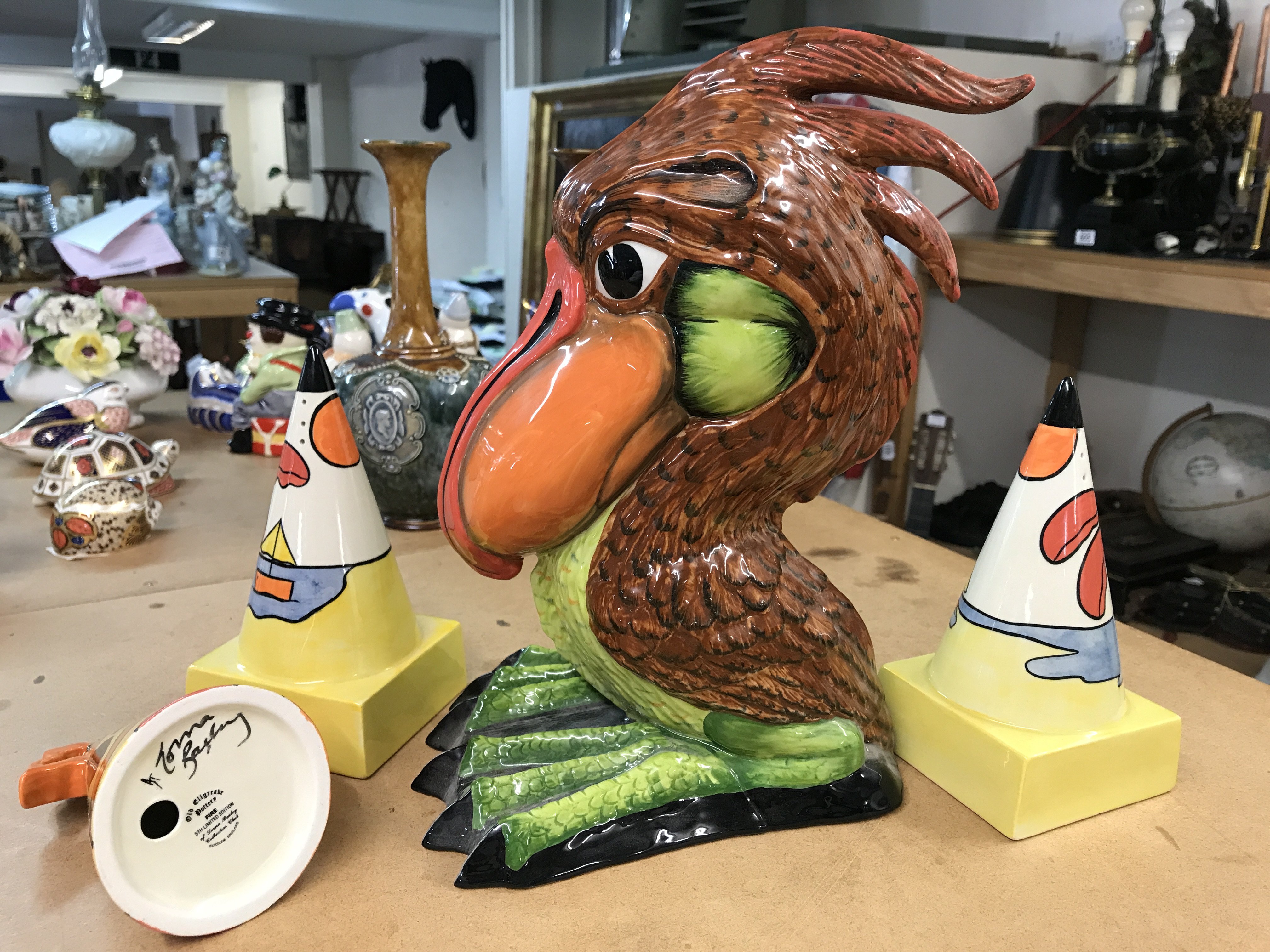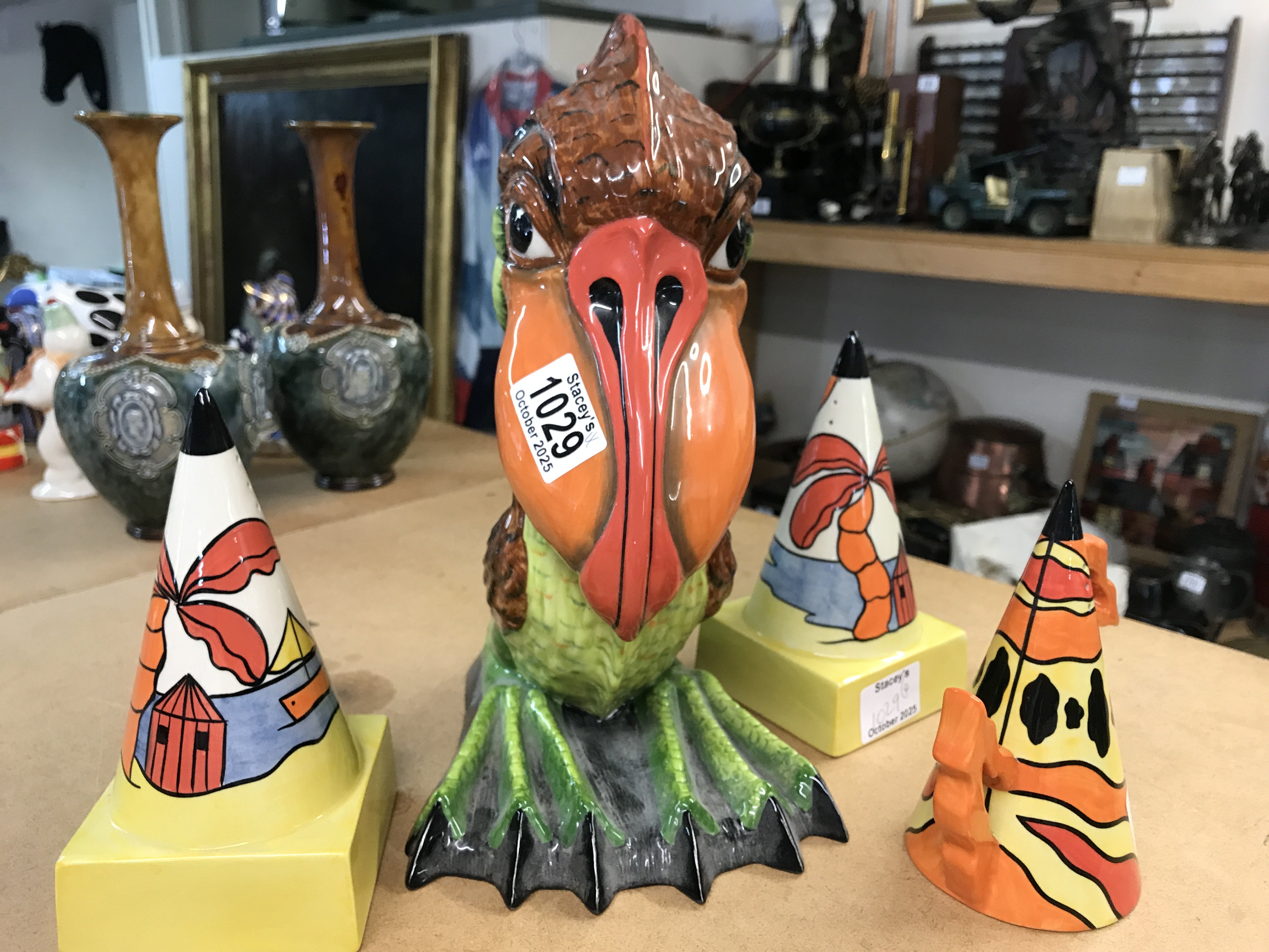 A Large Lorna Bailey Limited Edition bird 28/75; height 29cm, together with three Lorna Bailey sugar shakers to include- two in the Tropicana pattern and 5th Limited Edition Fire
