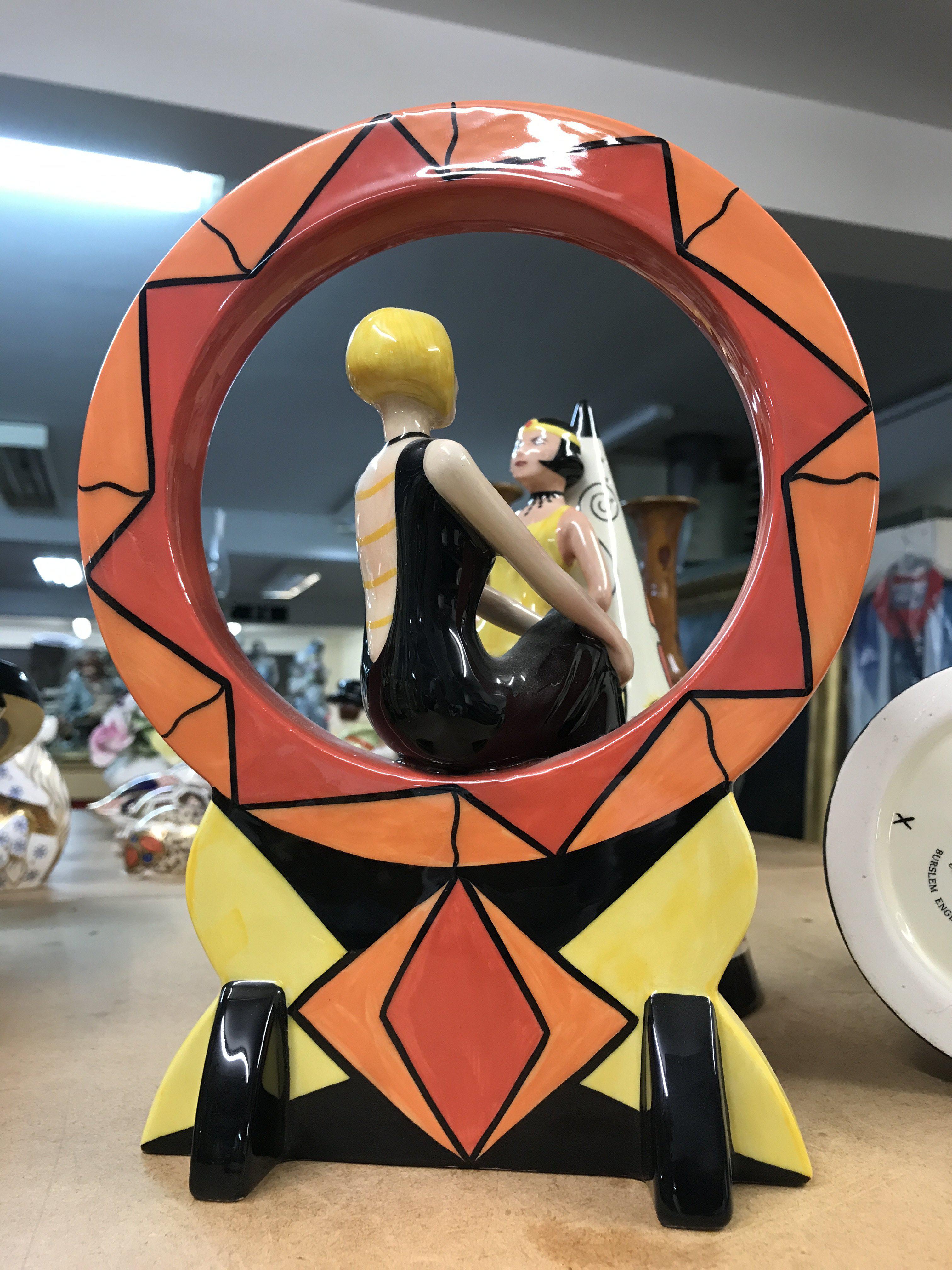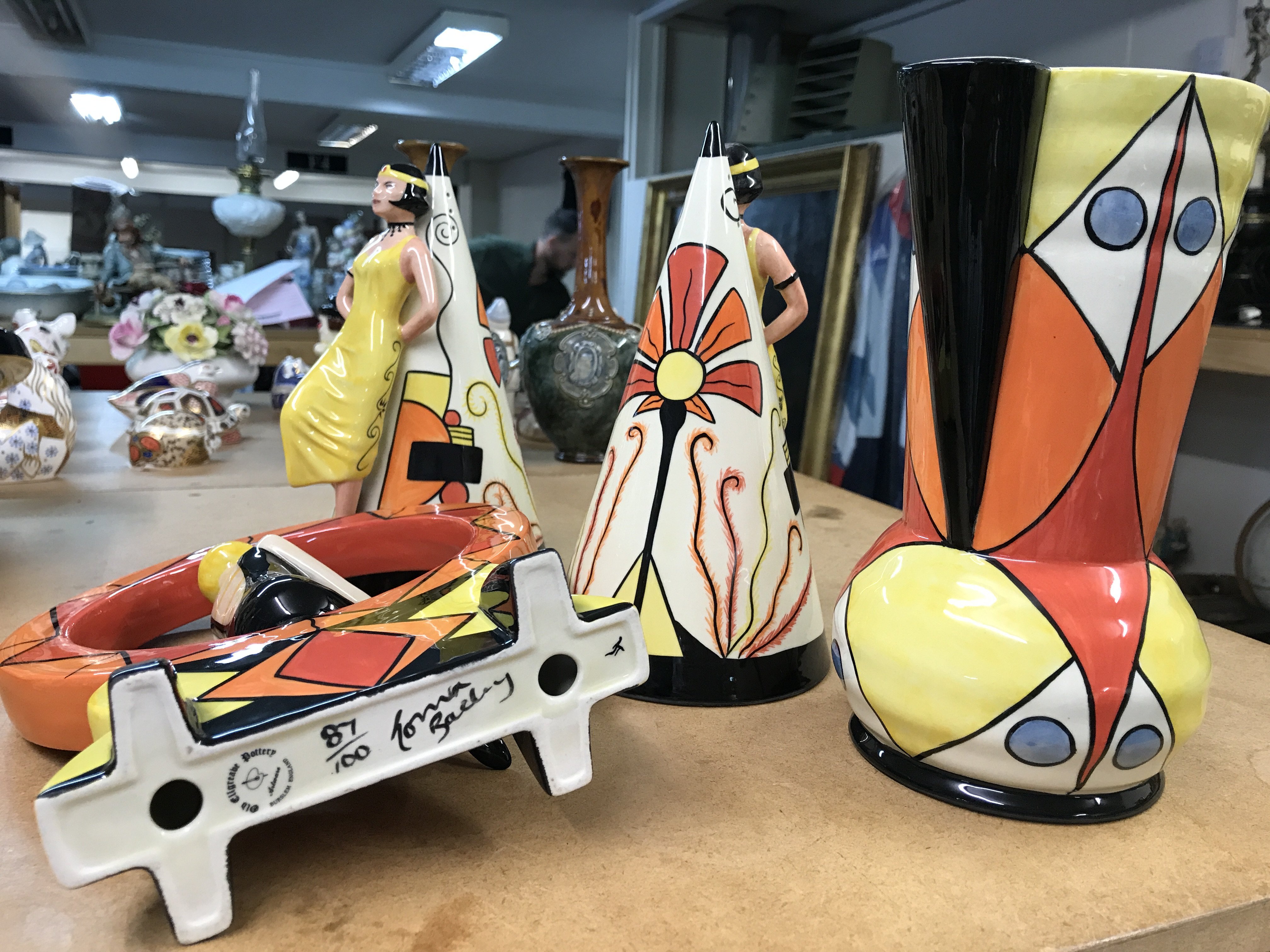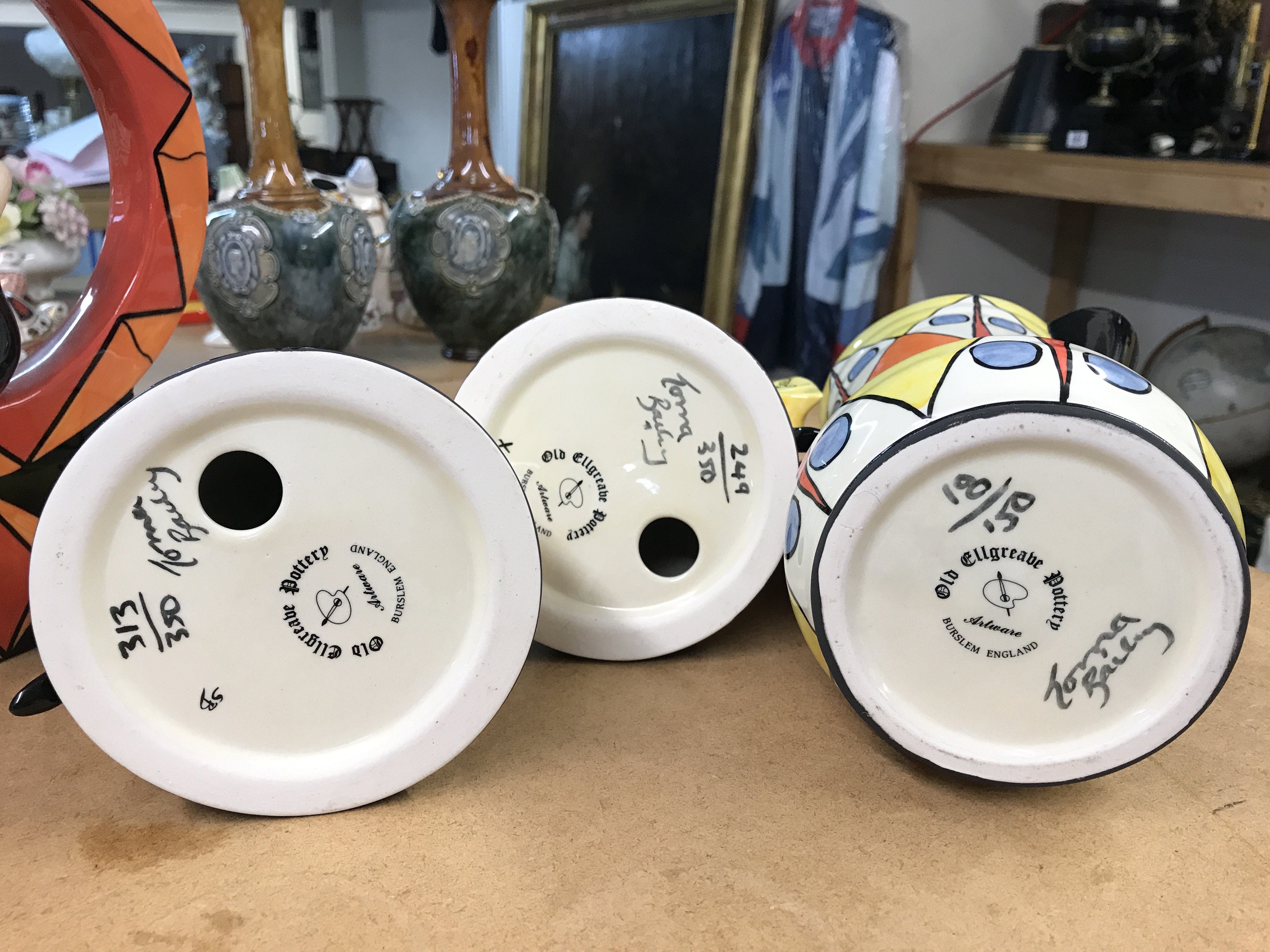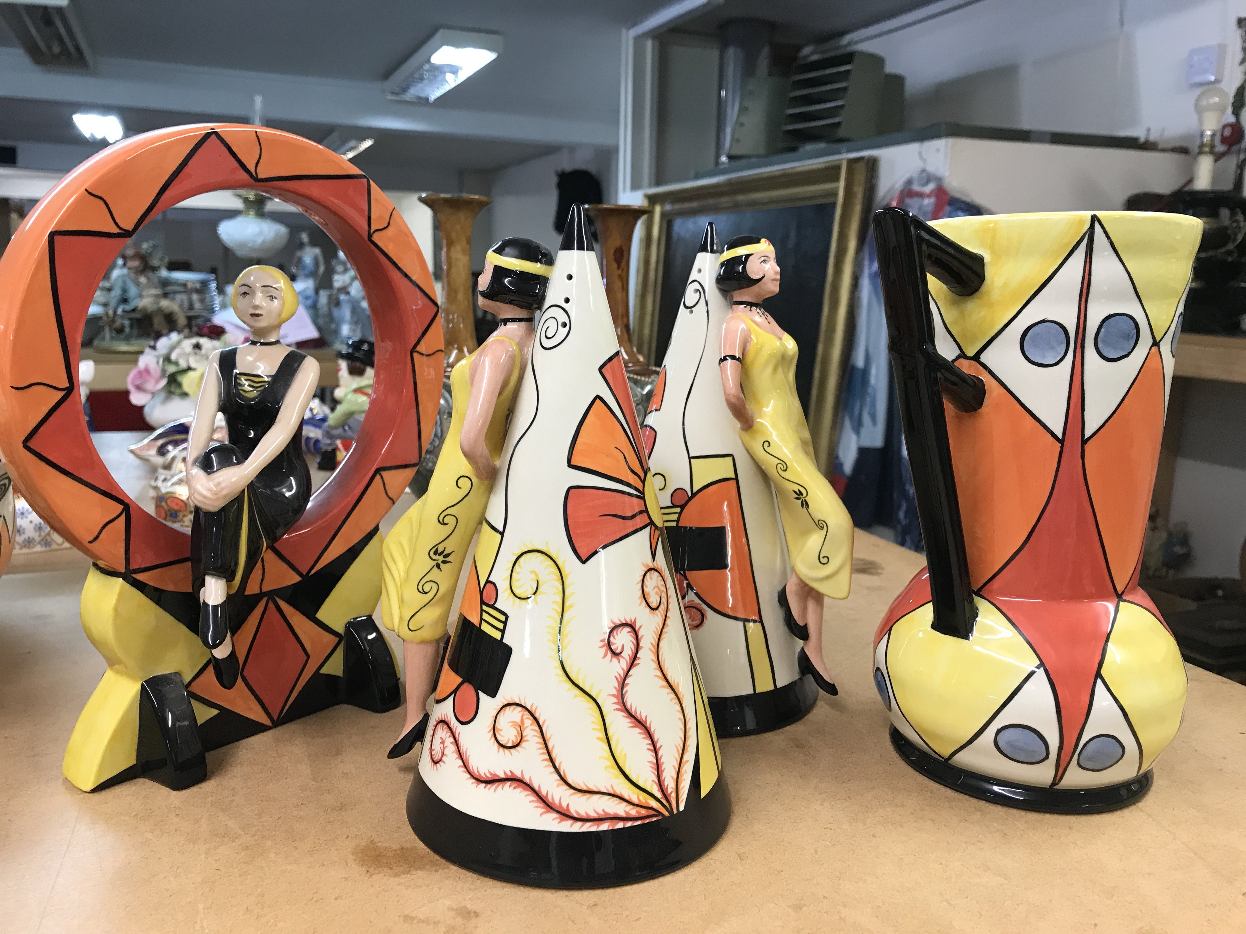 Four Lorna Bailey pottery pieces to include limited edition 1920,s girl seated in a hoop- 87/100, two large Art Deco style sugar shakers with raised figures 249/350 and 313/350 and an Art Deco style jug, decorated with geometric pattern - limited edition 18/150
