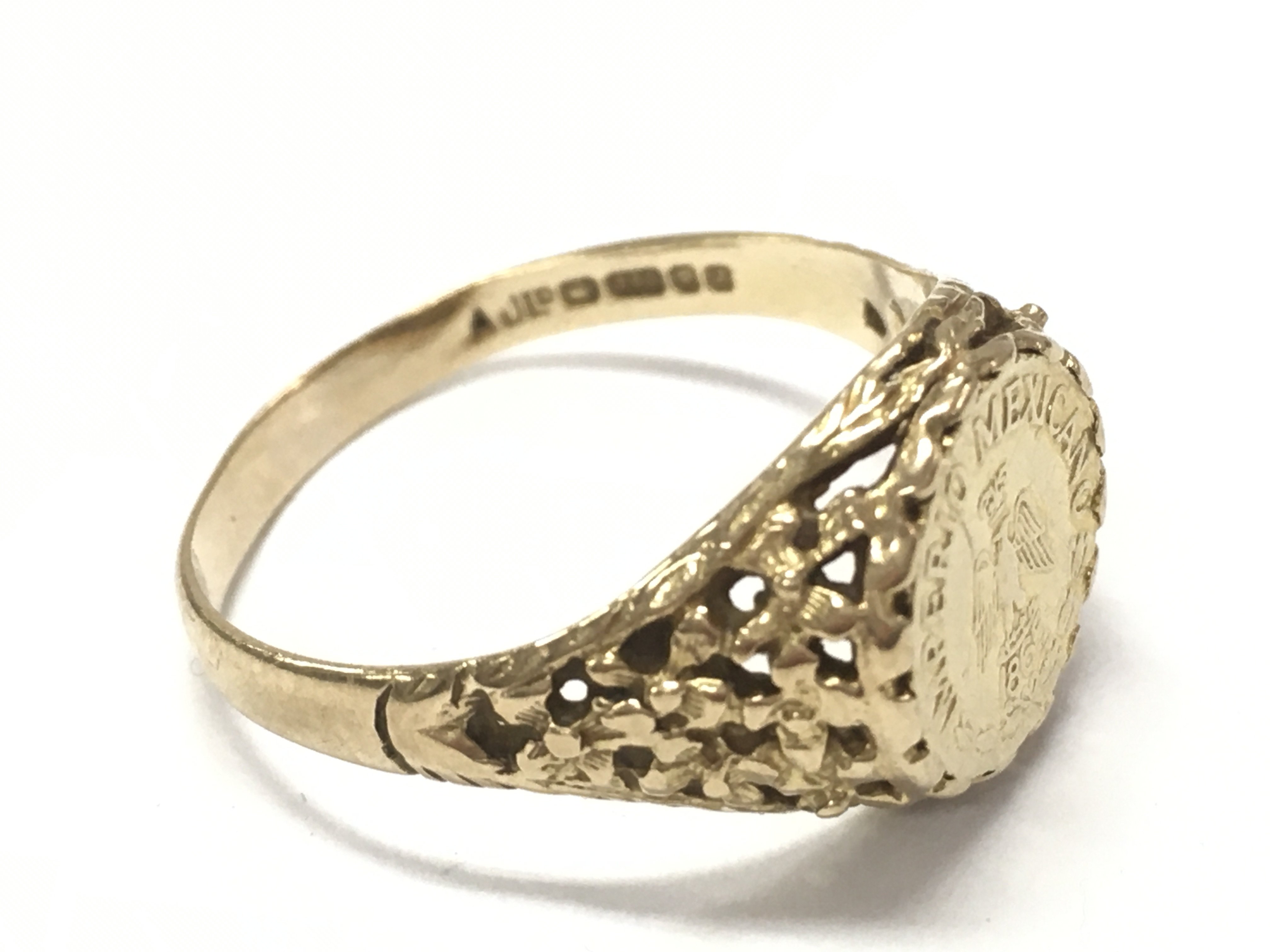 A Imperio Mexicano 1865 coin mounted in a 9 carat gold ring . Size R. Total weight 2.9g Postage cat a