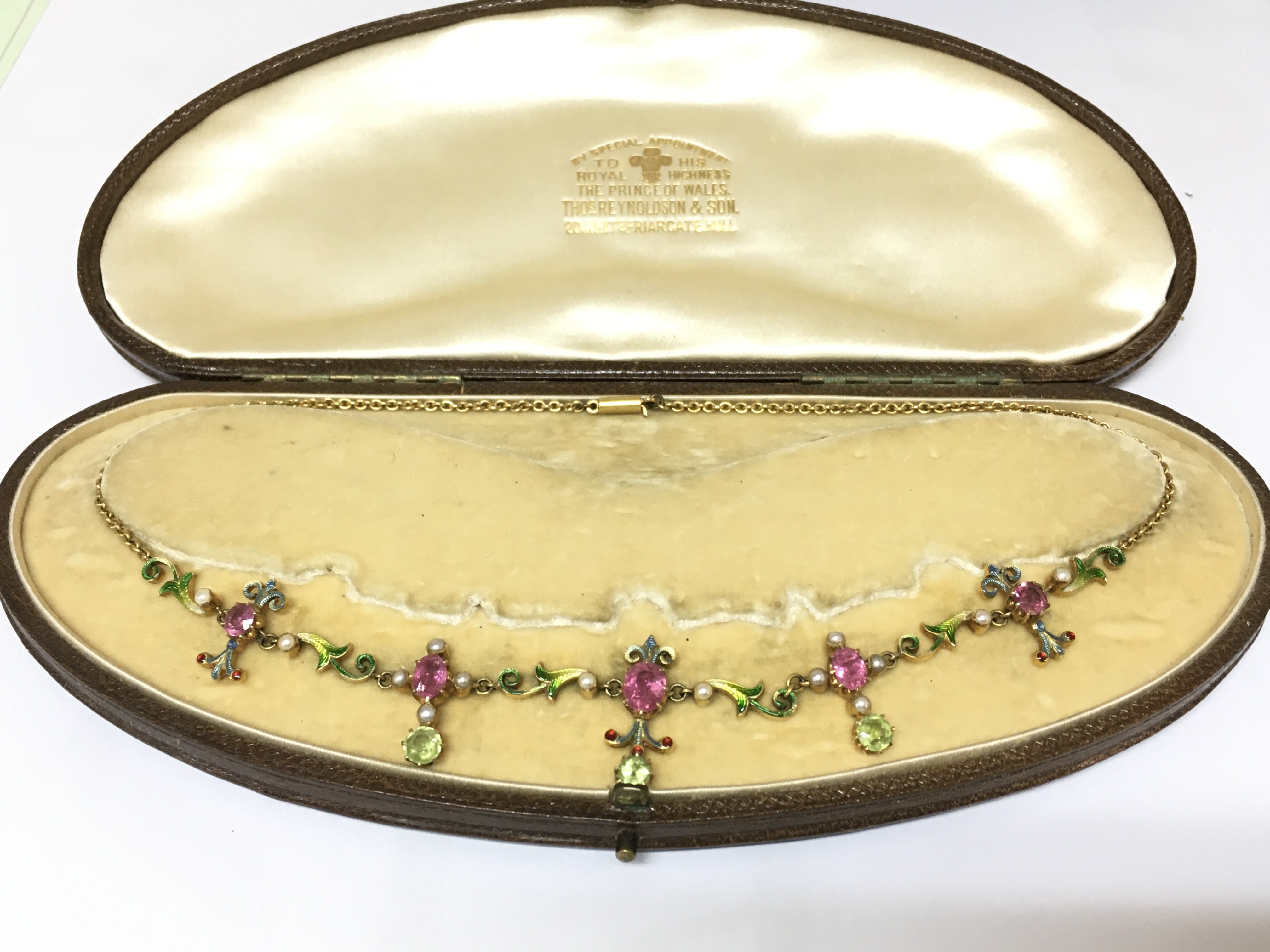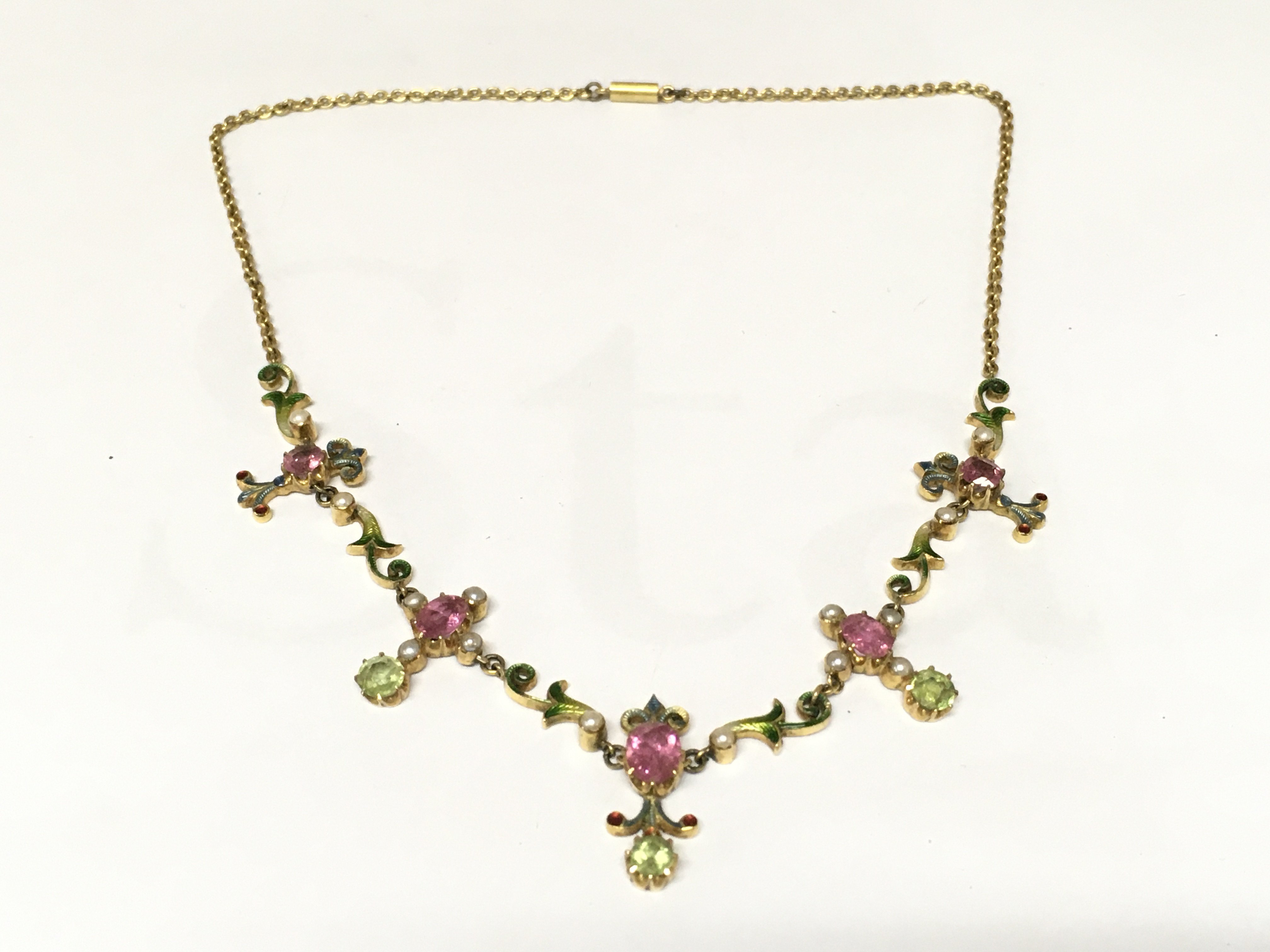 An Edwardian 15ct fiori design seed pearl necklace in a fitted box. Approximately 15.16g