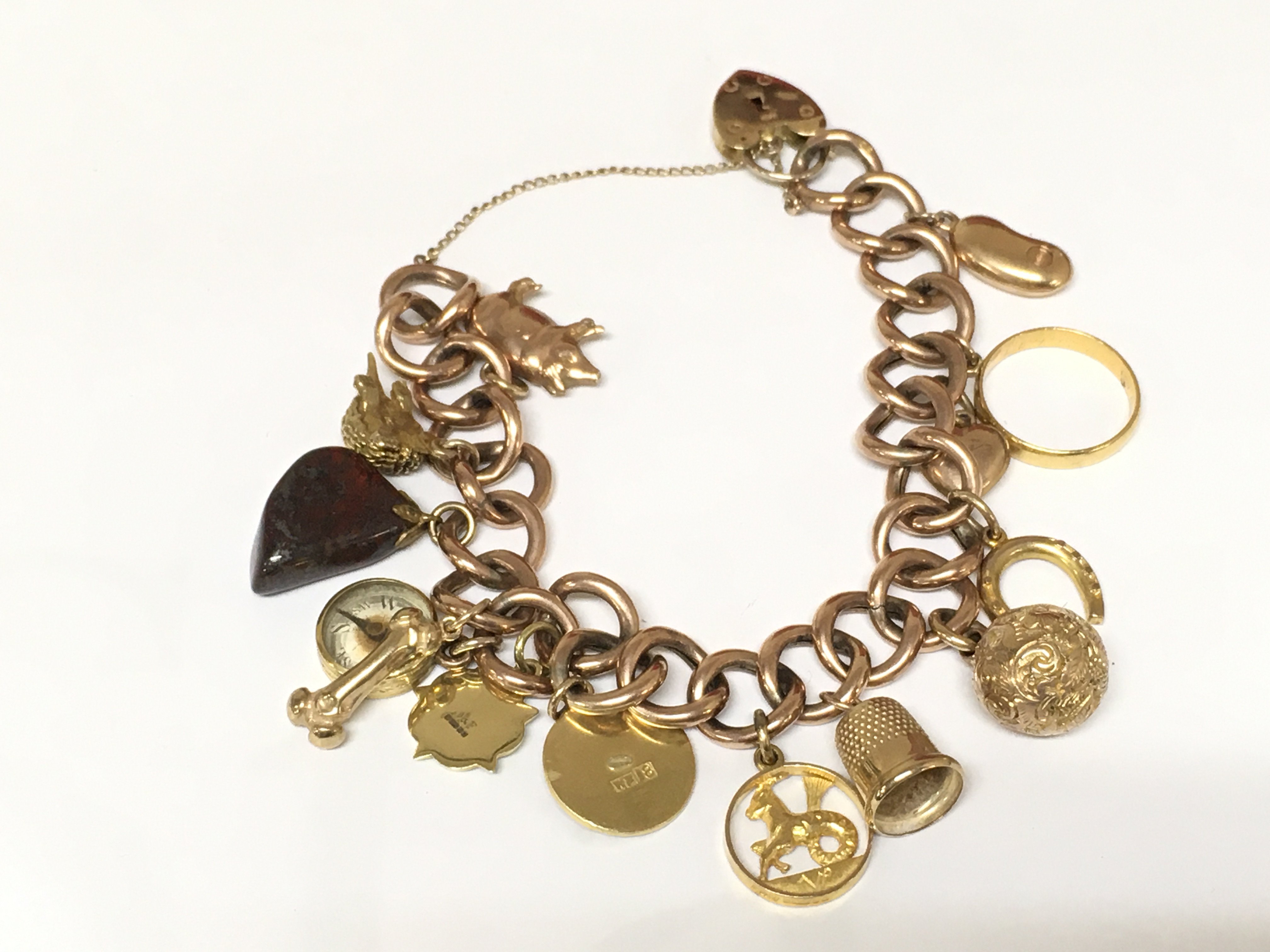 A 9ct gold charm bracelet with multiple charms including a 22ct gold band. Approximately 42g