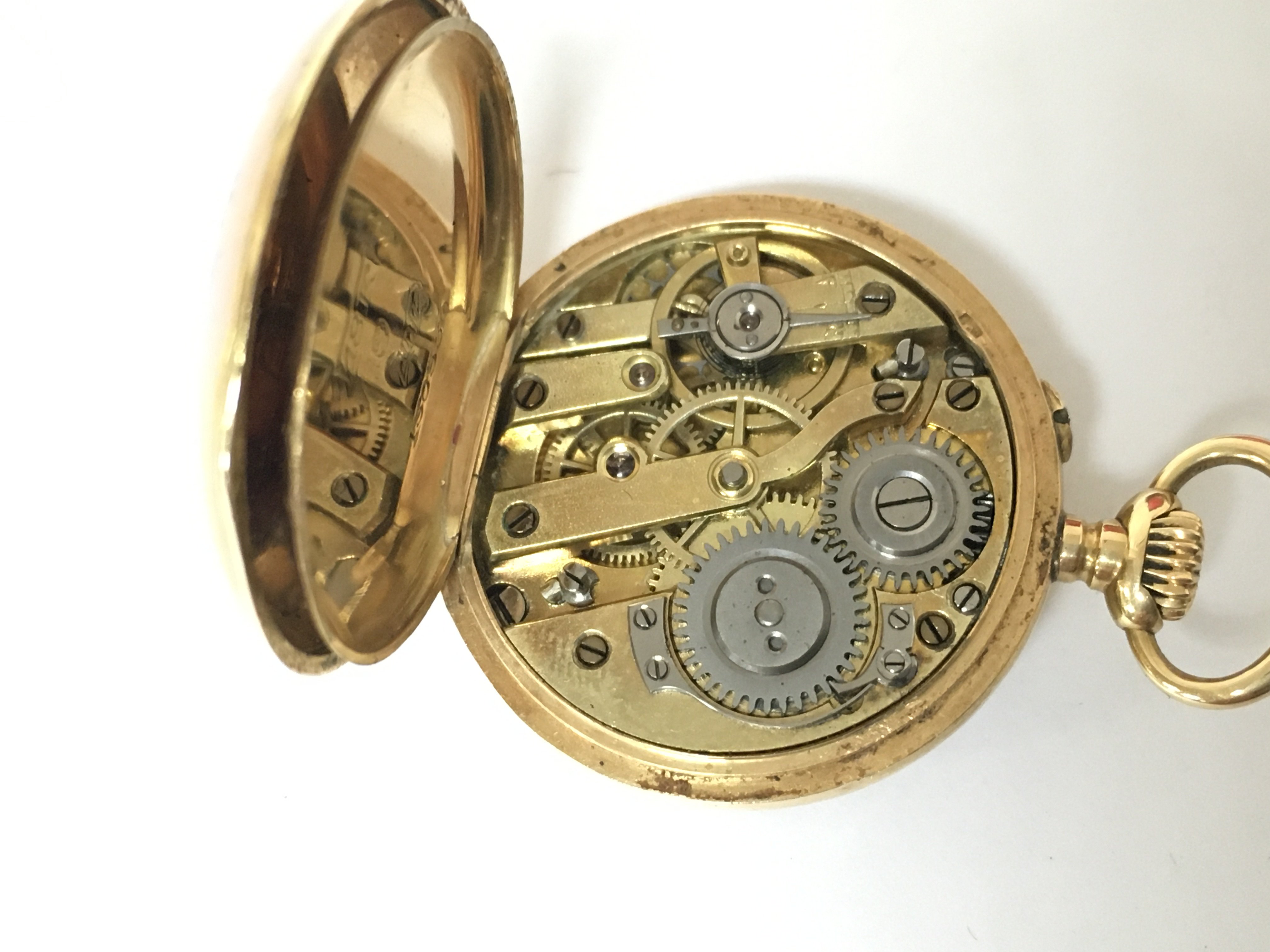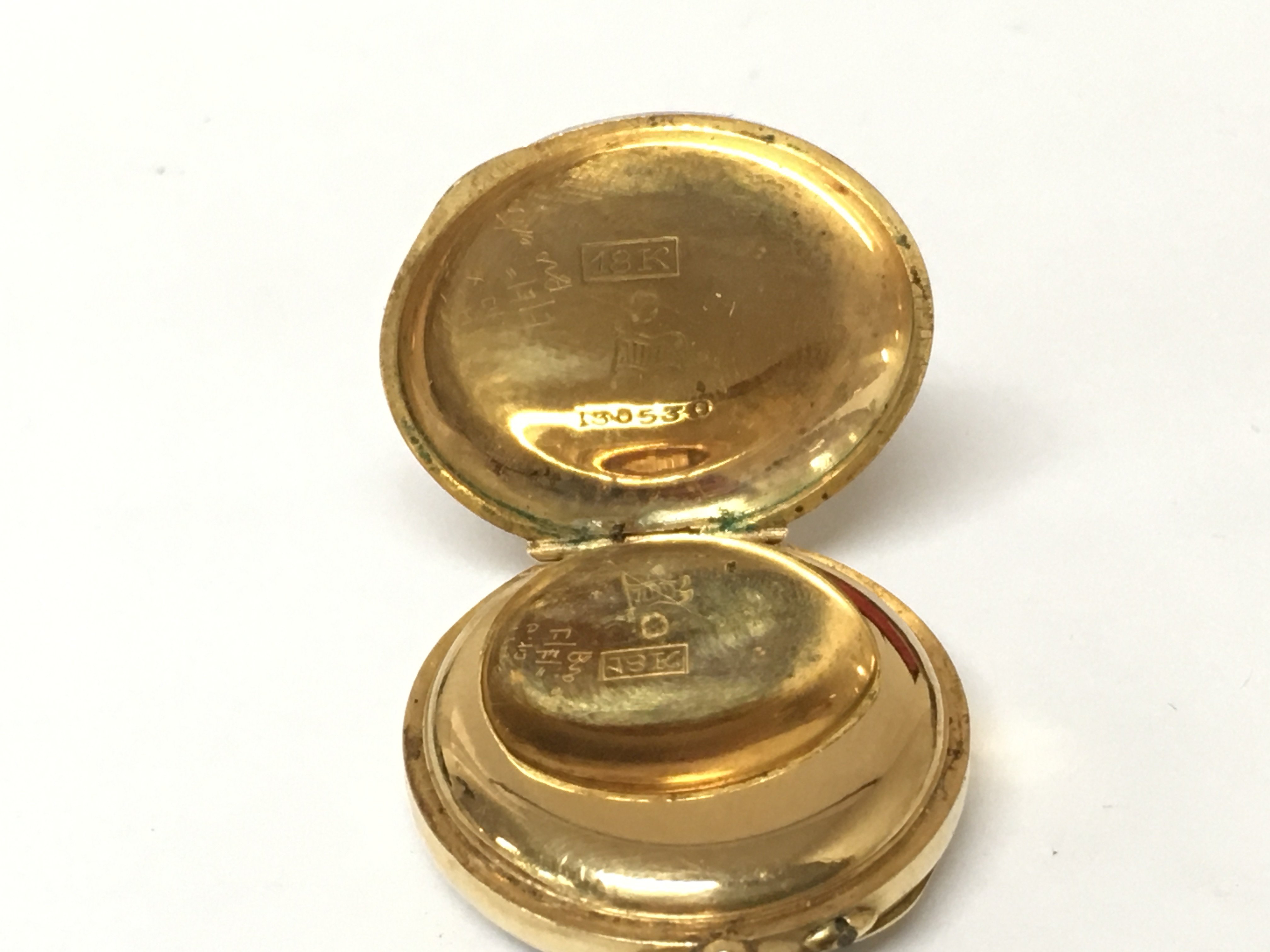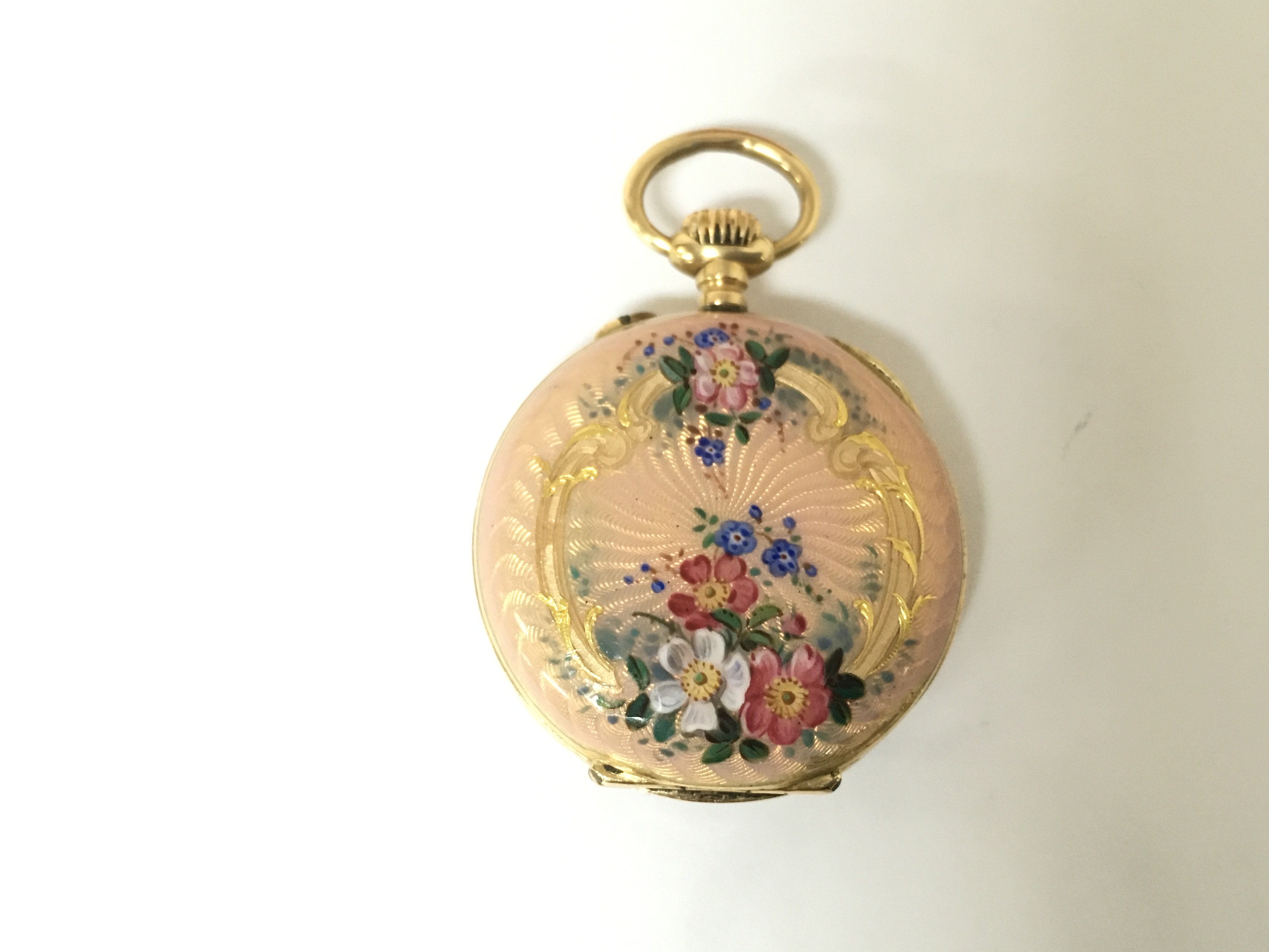 A ladies 18ct gold fob watch with enamel back. Winds and runs but not tested for time keeping. 16.31g