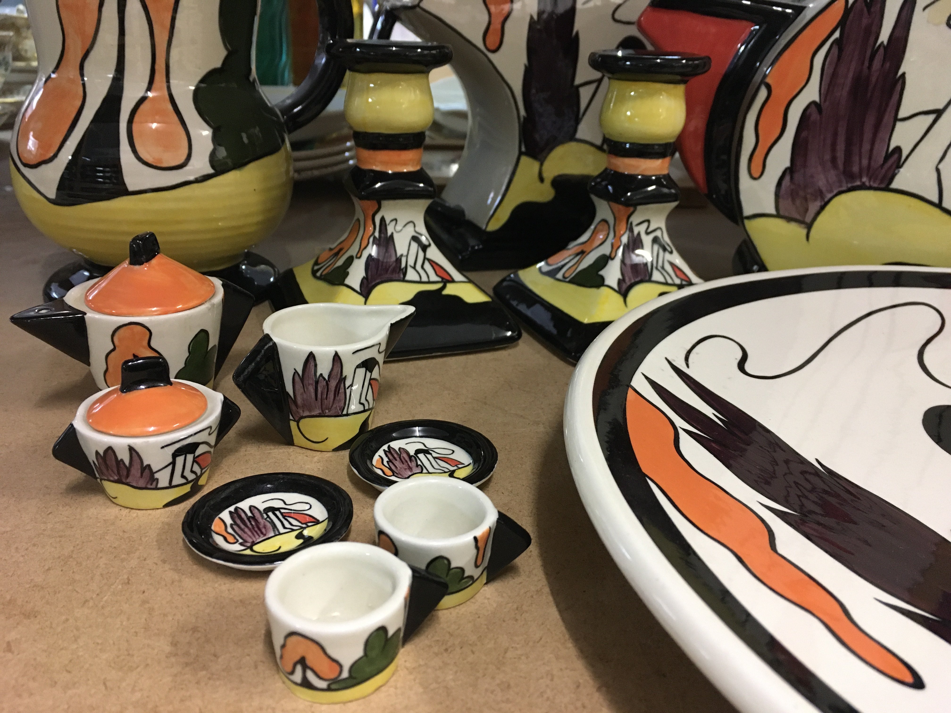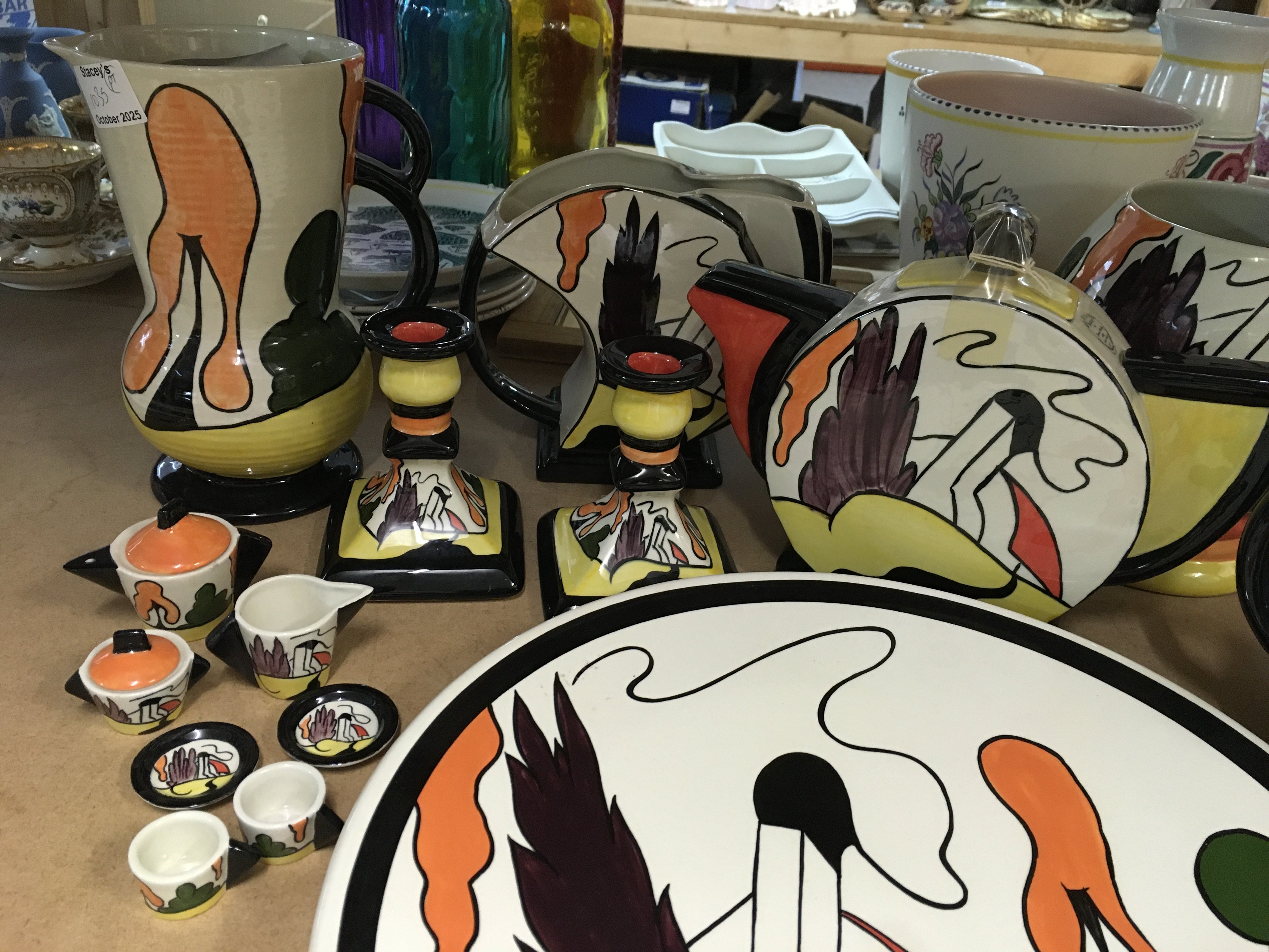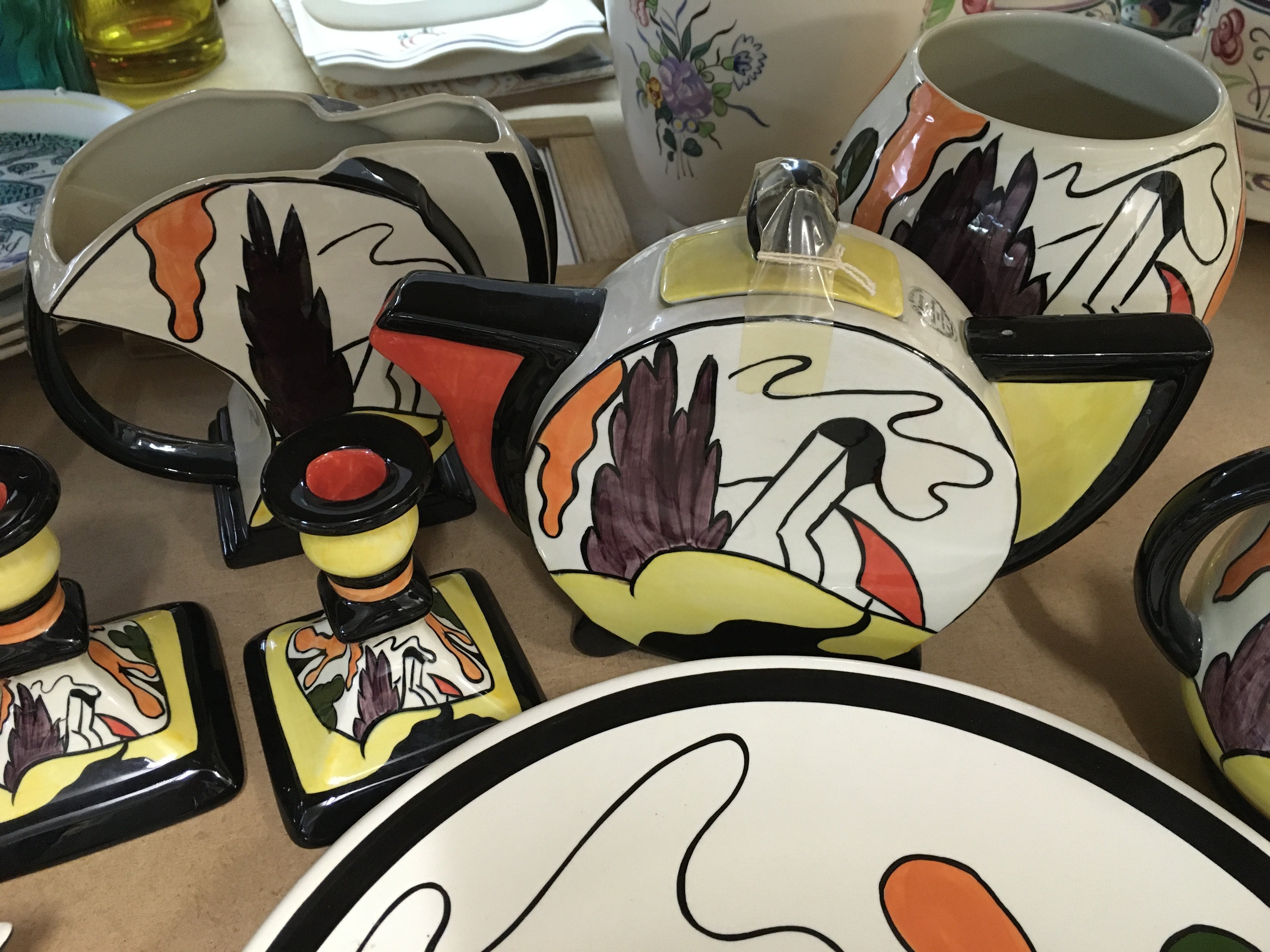 A collection of Lorna Bailey pottery in the "House and Path" range, to include charger, tea pot, two vases, two jugs, pair of candlesticks and a miniature tea set