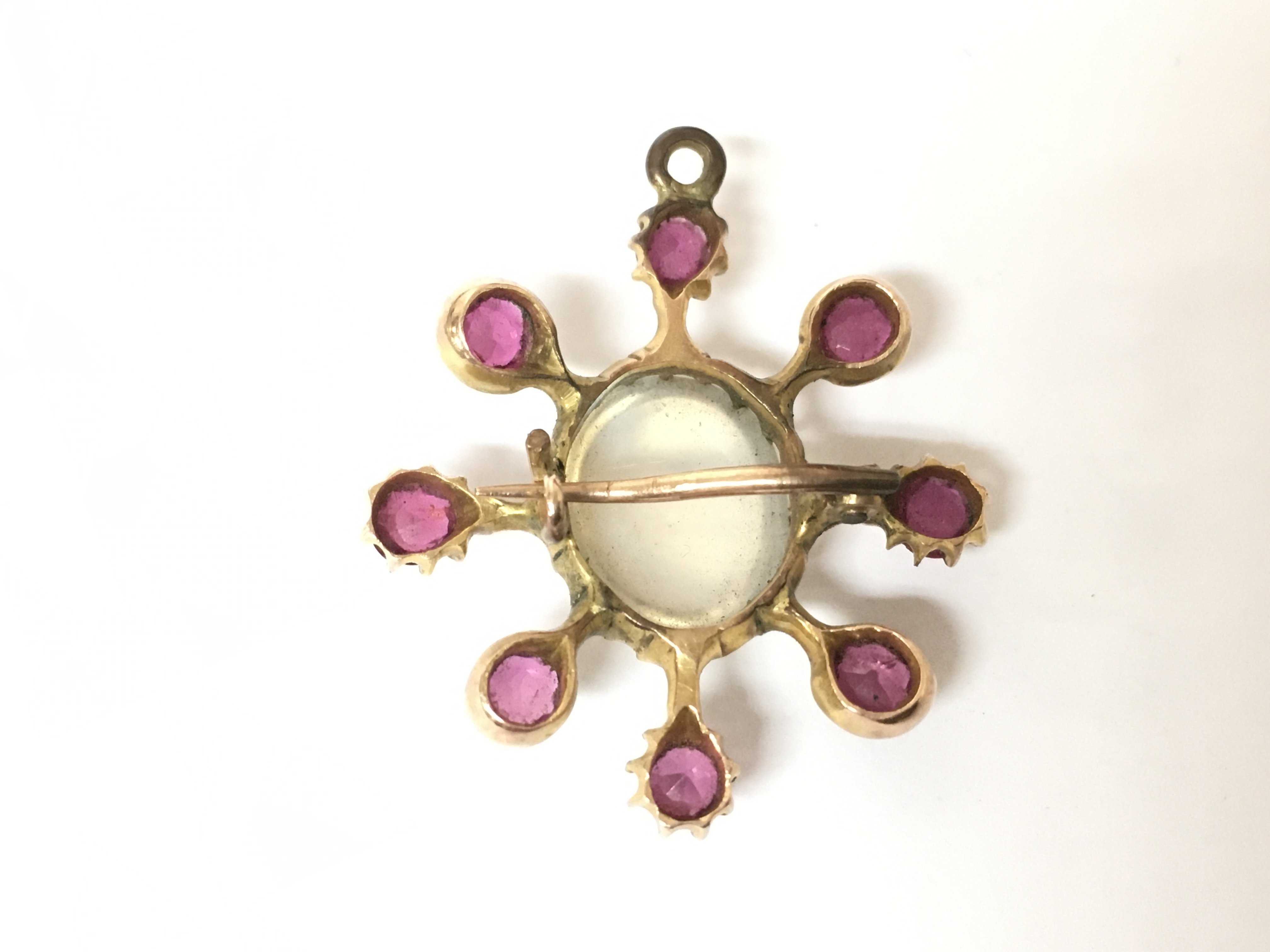 An unmarked yellow metal moonstone and ruby star brooch. 3.65g