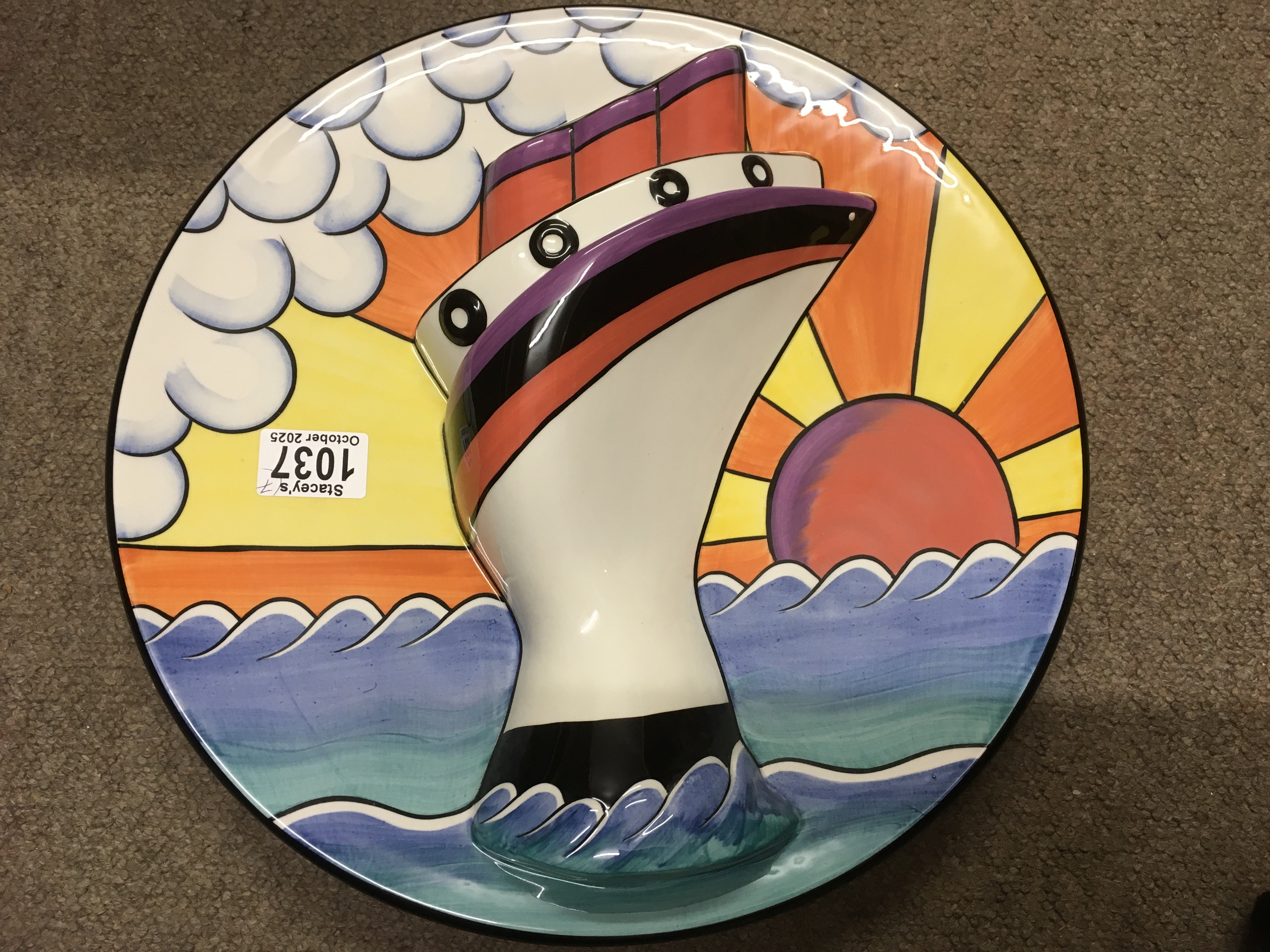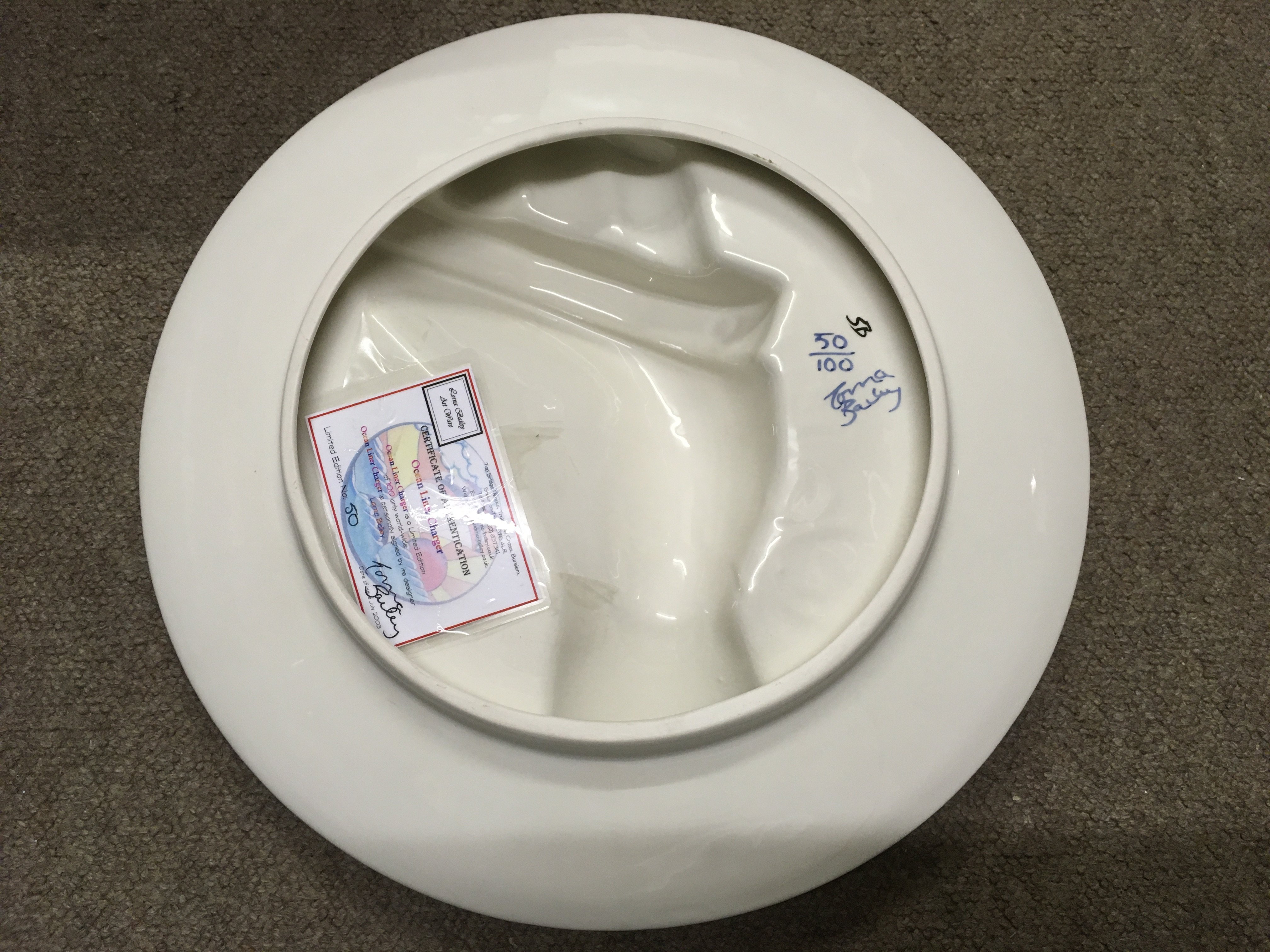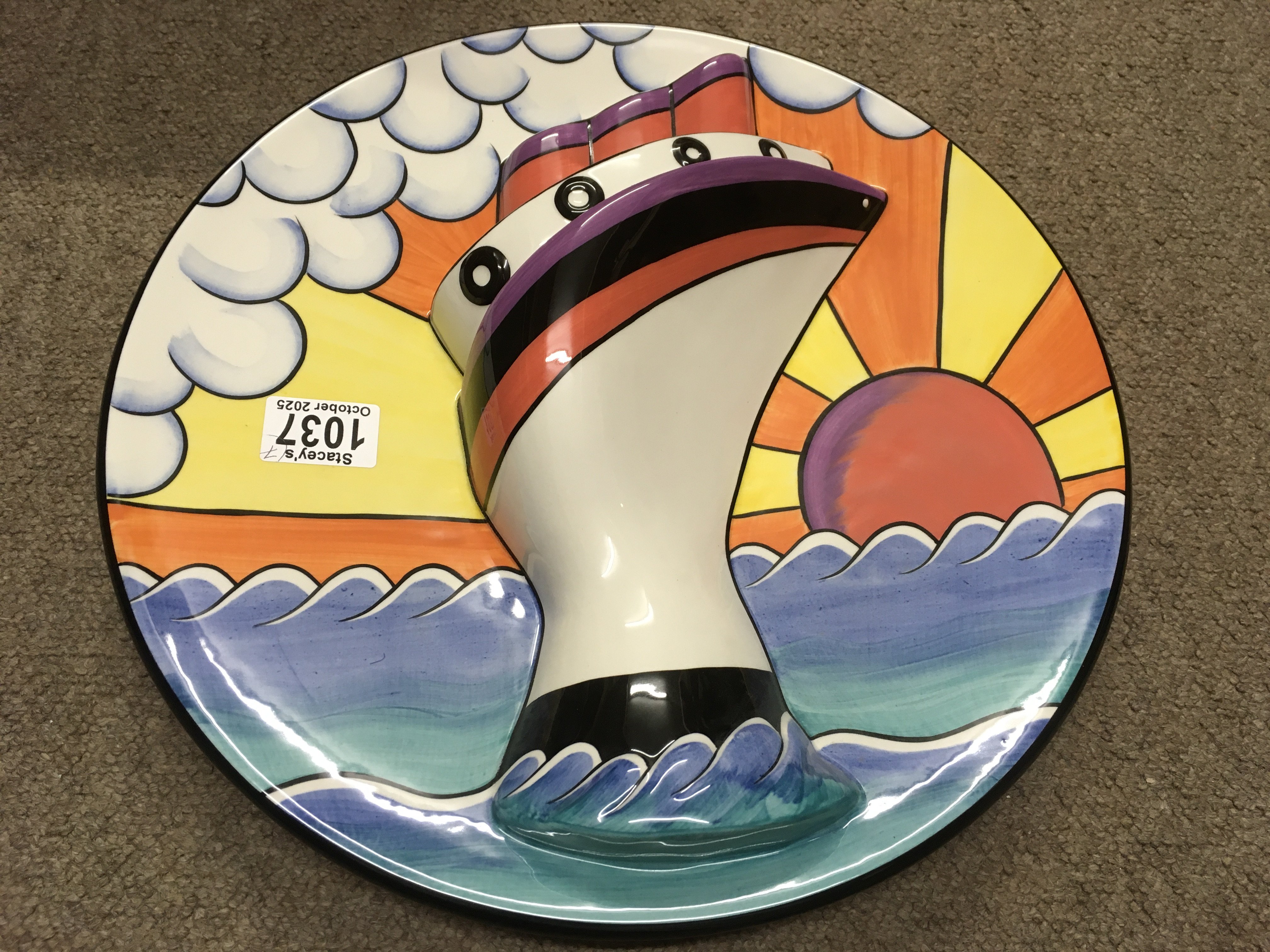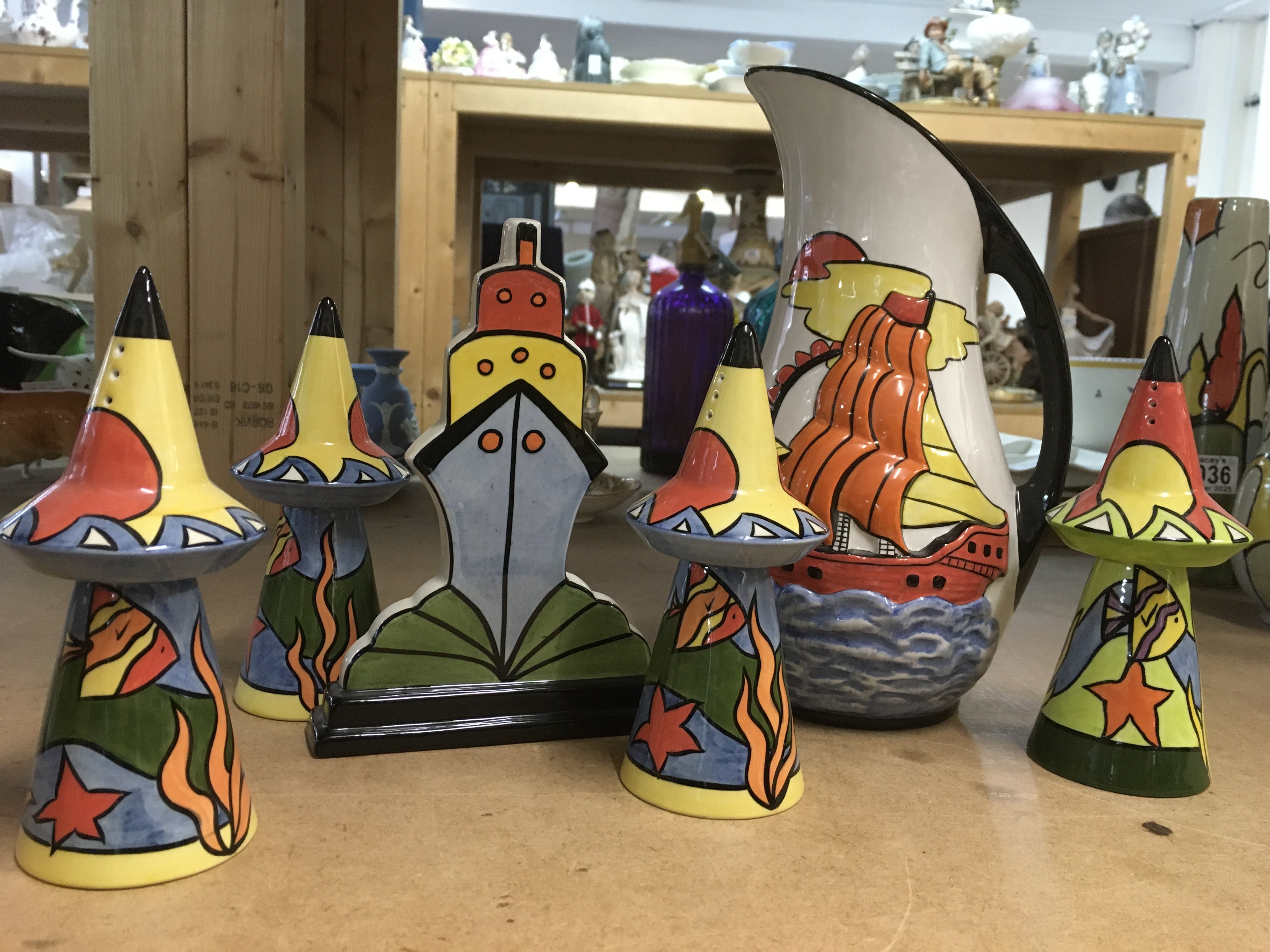 Seven Lorna Bailey pottery items including Limited Edition 50/100 Ocean Liner Charger (with certificate of authenticity), Limited Edition Flat-back 68/250 Ocean Liner, jug with raised design of a ship, and four sugar shakers depicting fish