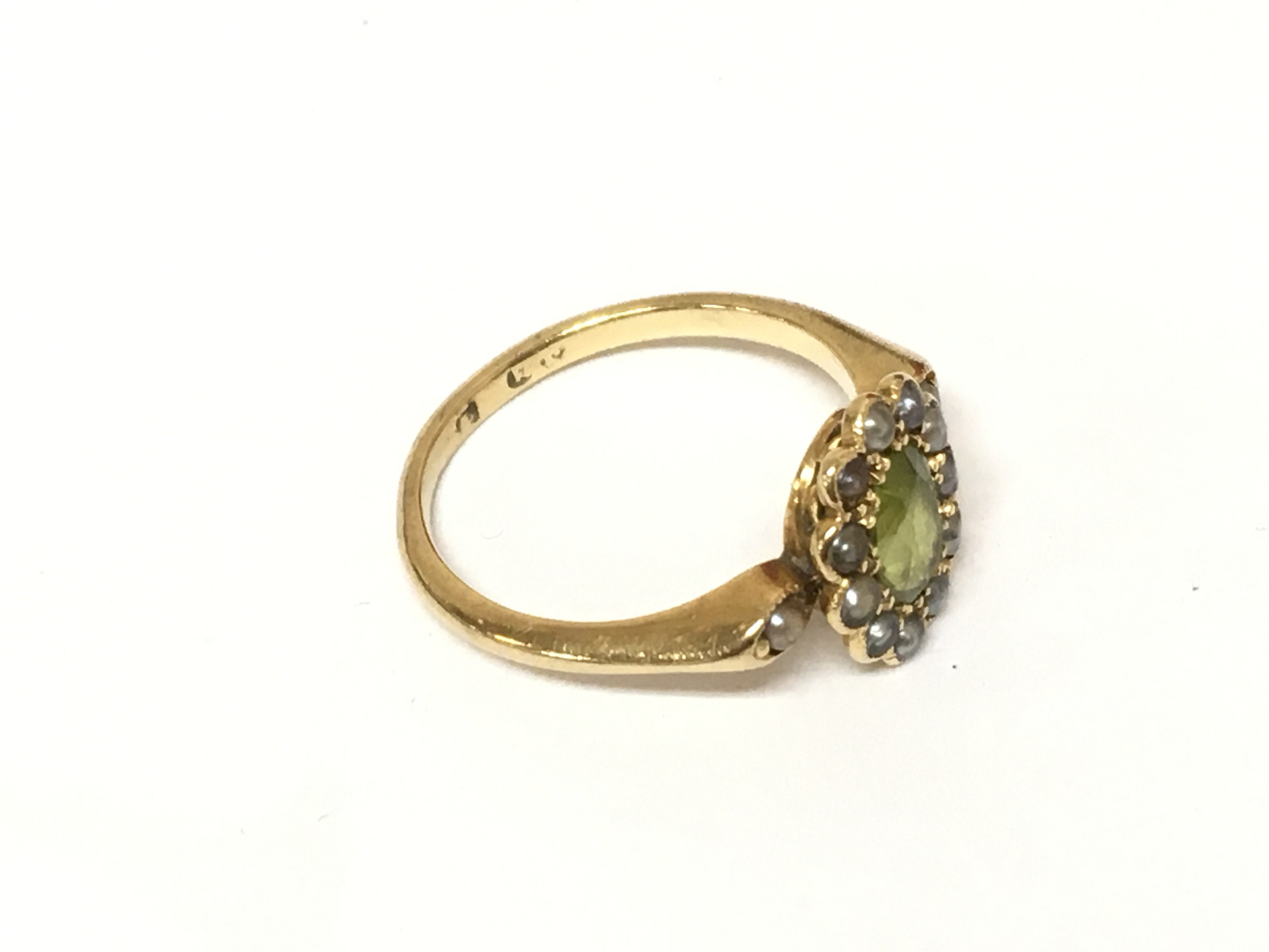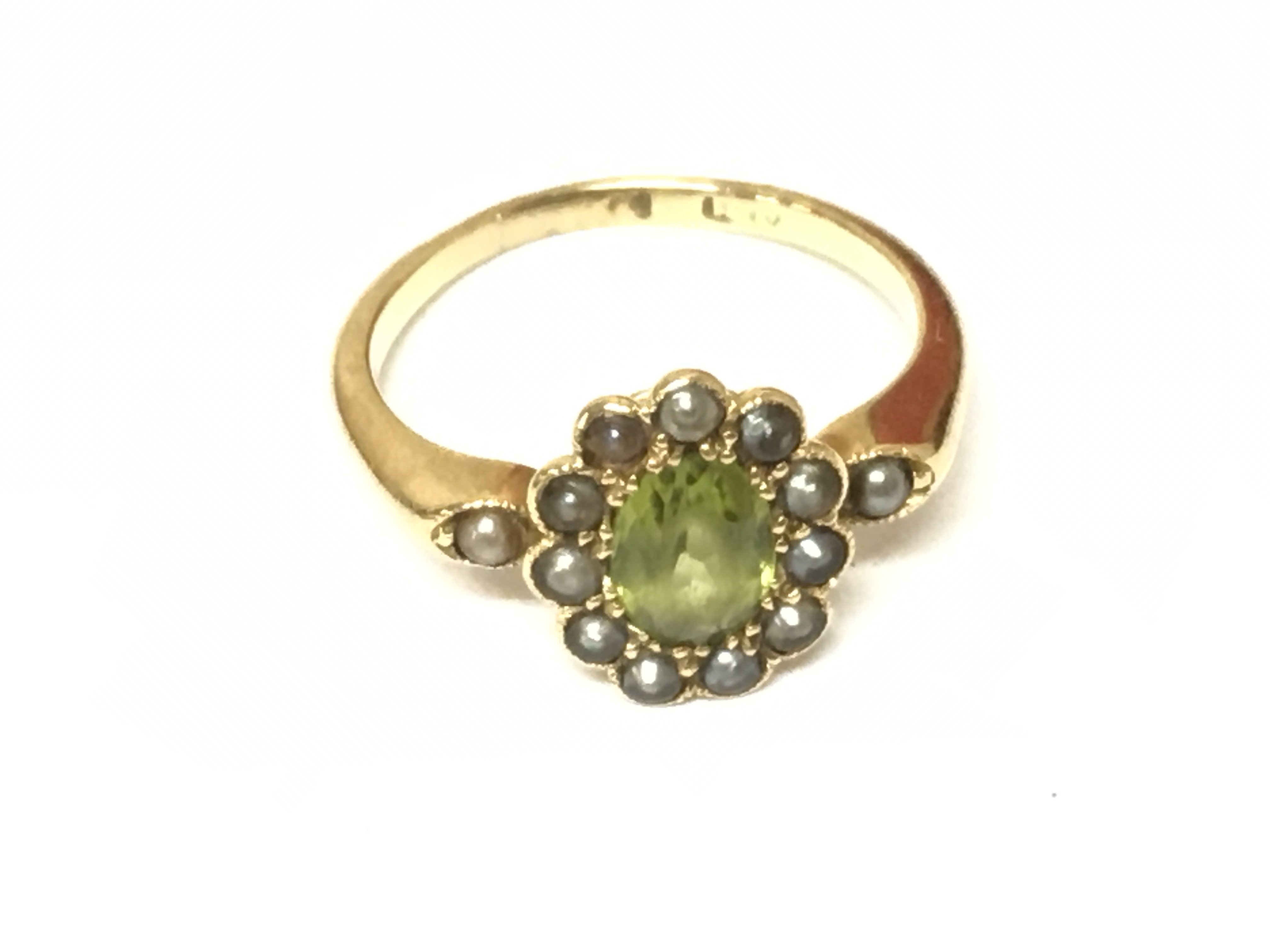 A 9ct gold Peridot and seed Pearl ring. Approximately 2.73g and size J 1/2