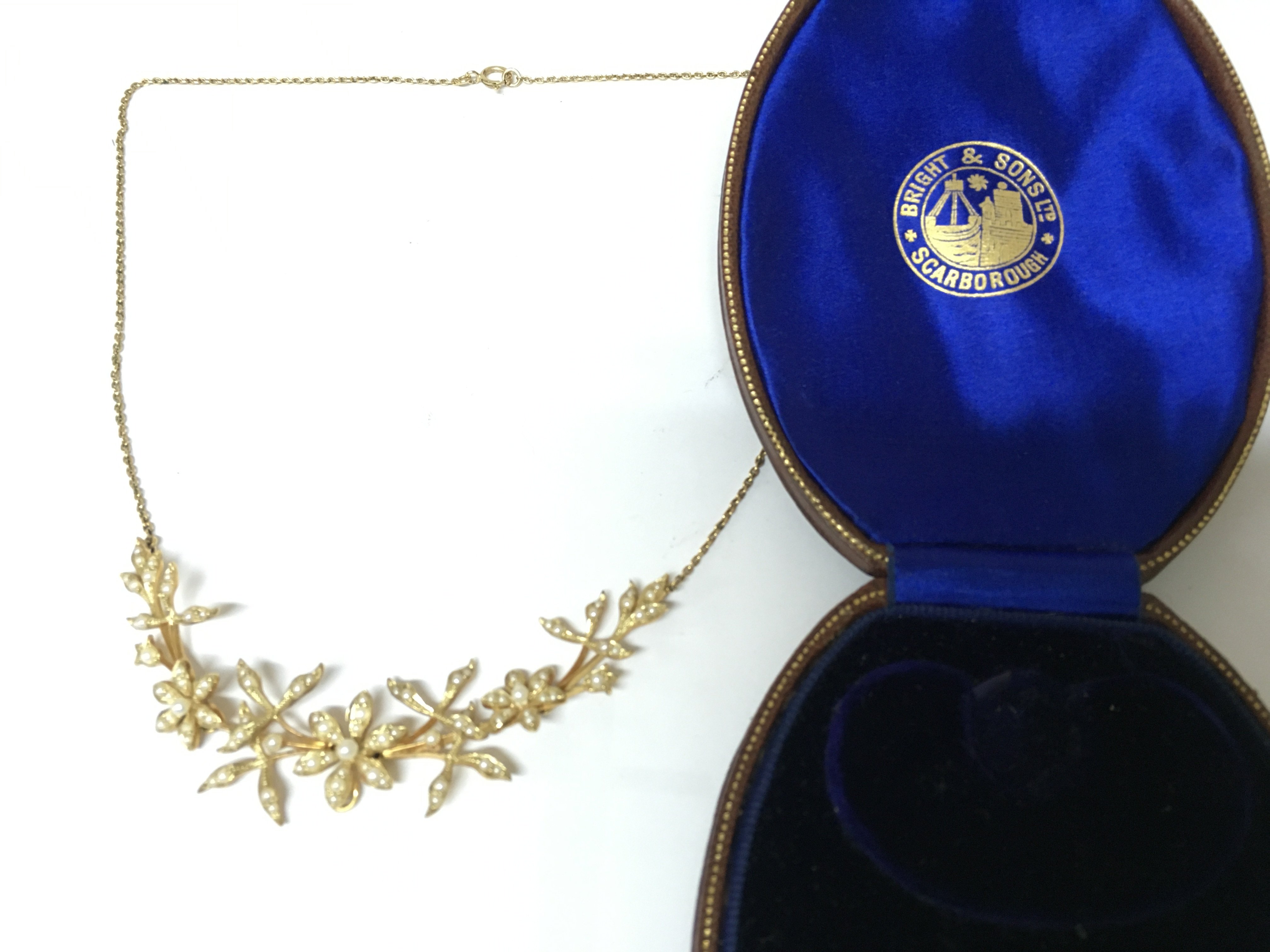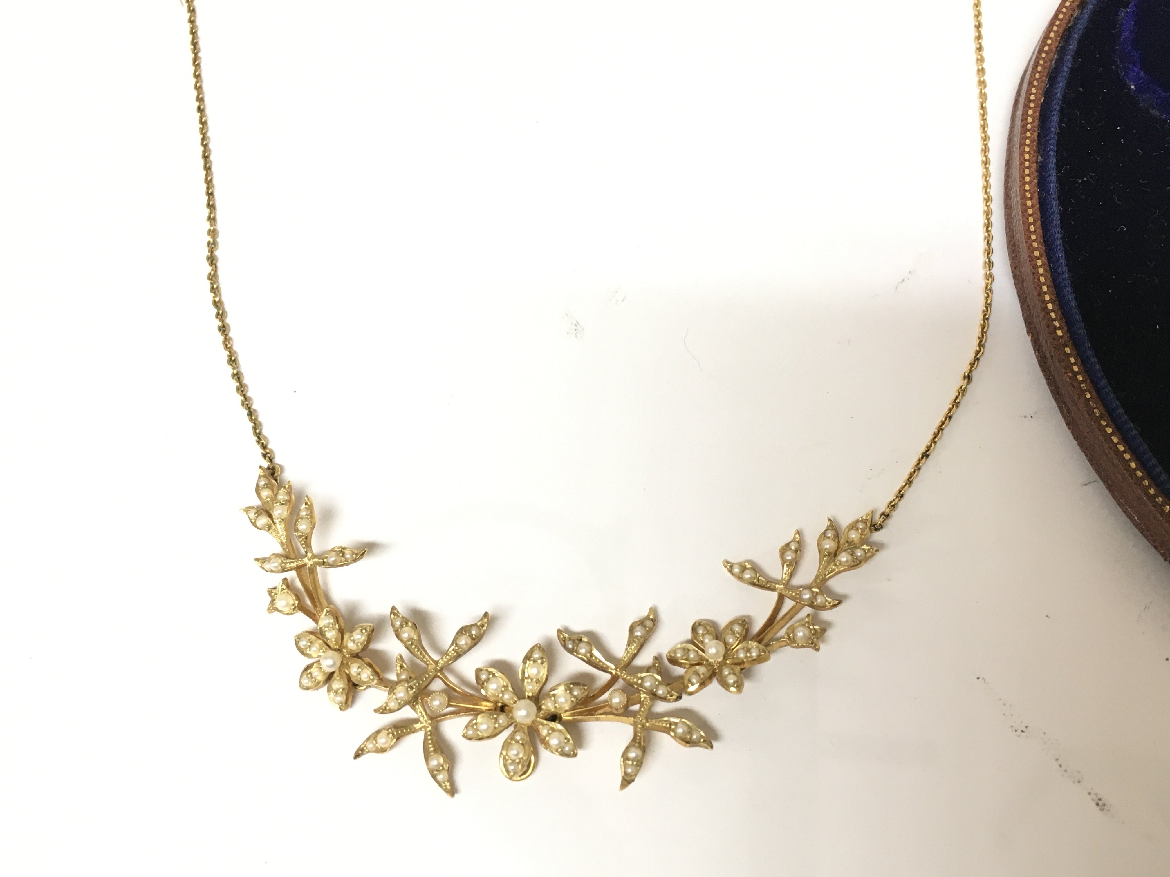 An Edwardian 15ct fiori design seed pearl necklace. 12g Postage B