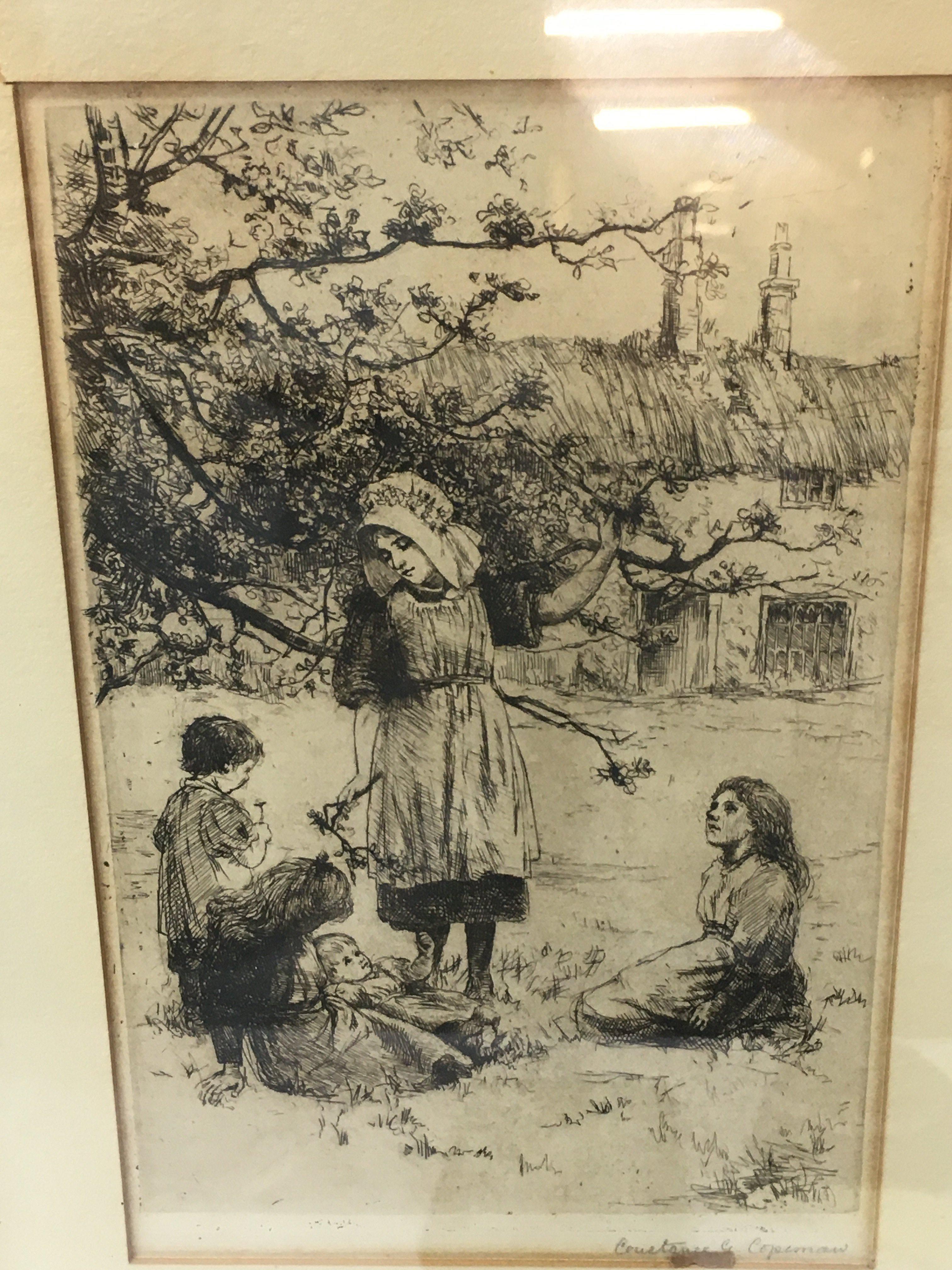 Two framed etchings by Constance G Coleman, one depicting a painter and the other a rural family scene. Frame sizes 29x39cm approximately