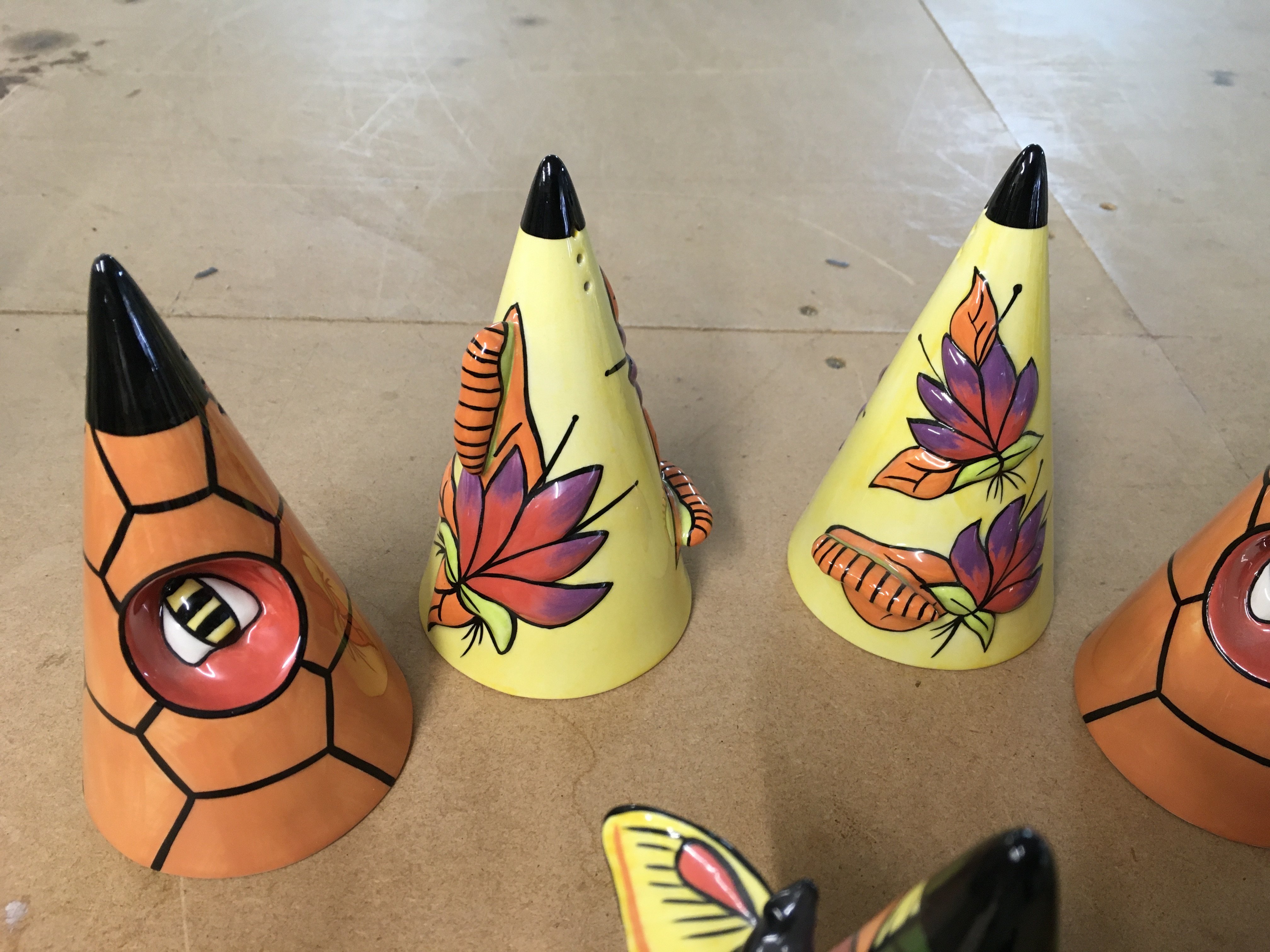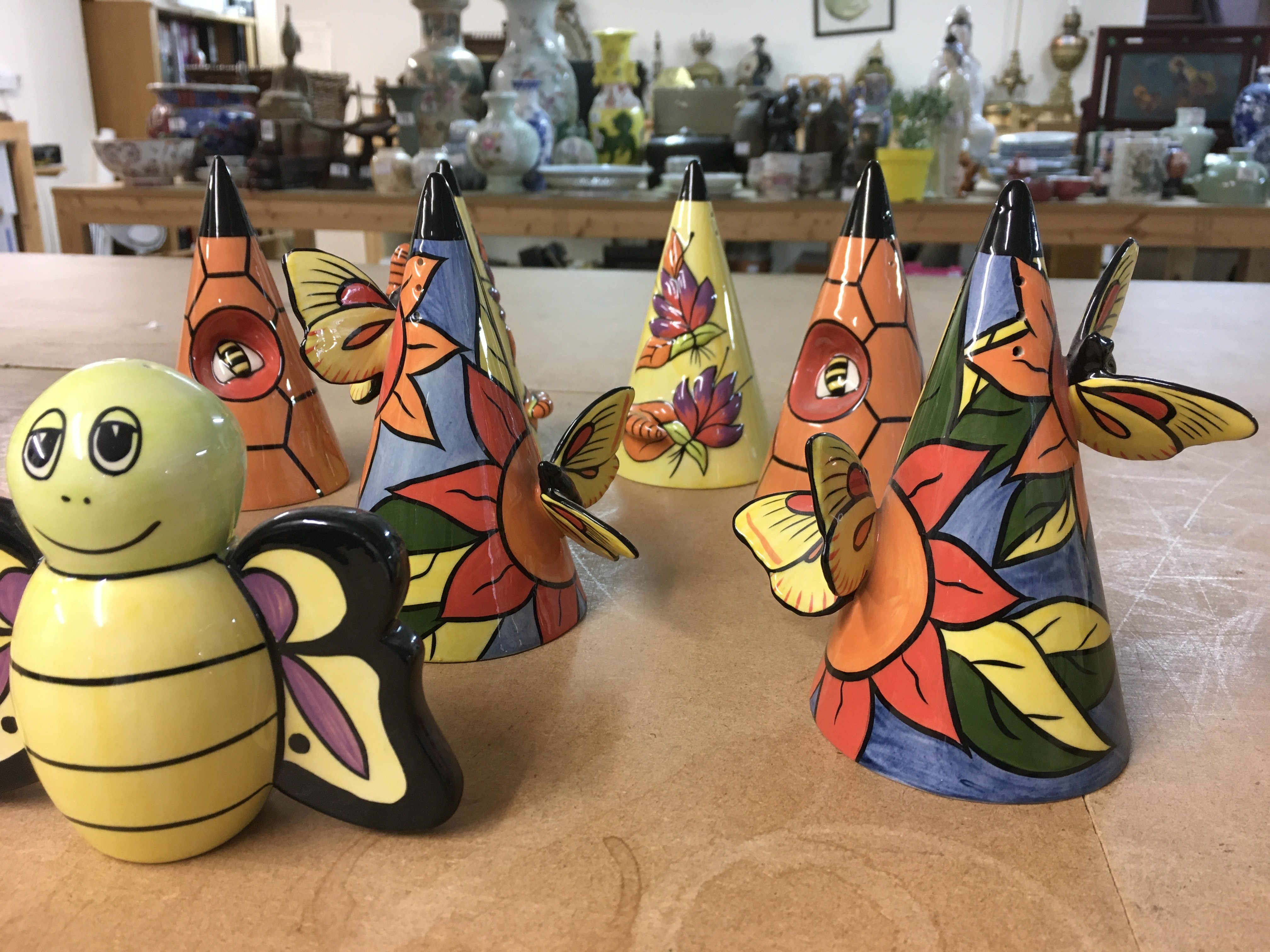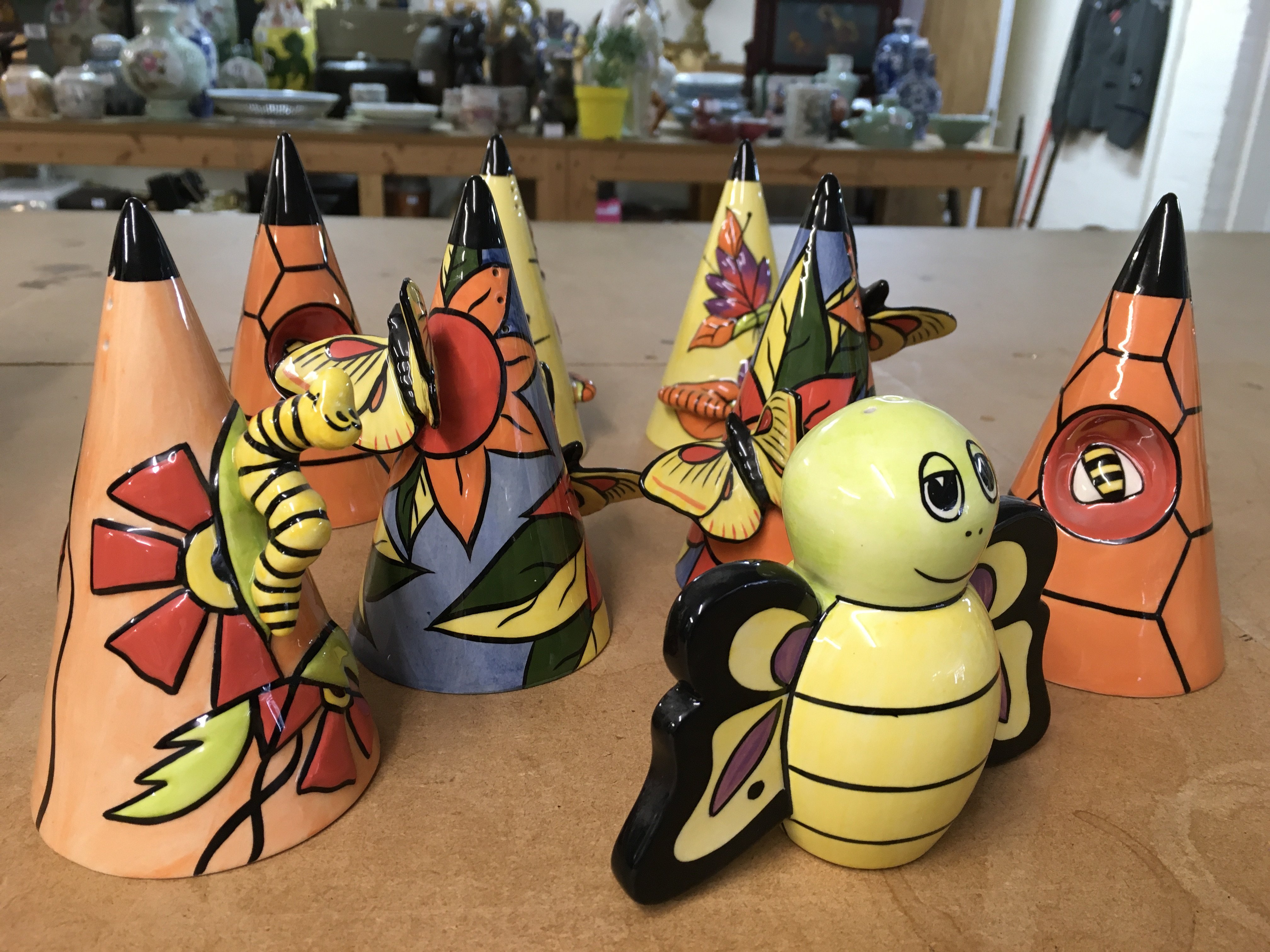 Six Lorna Bailey insect themed Sugar shakers, together with a Bee shaped one