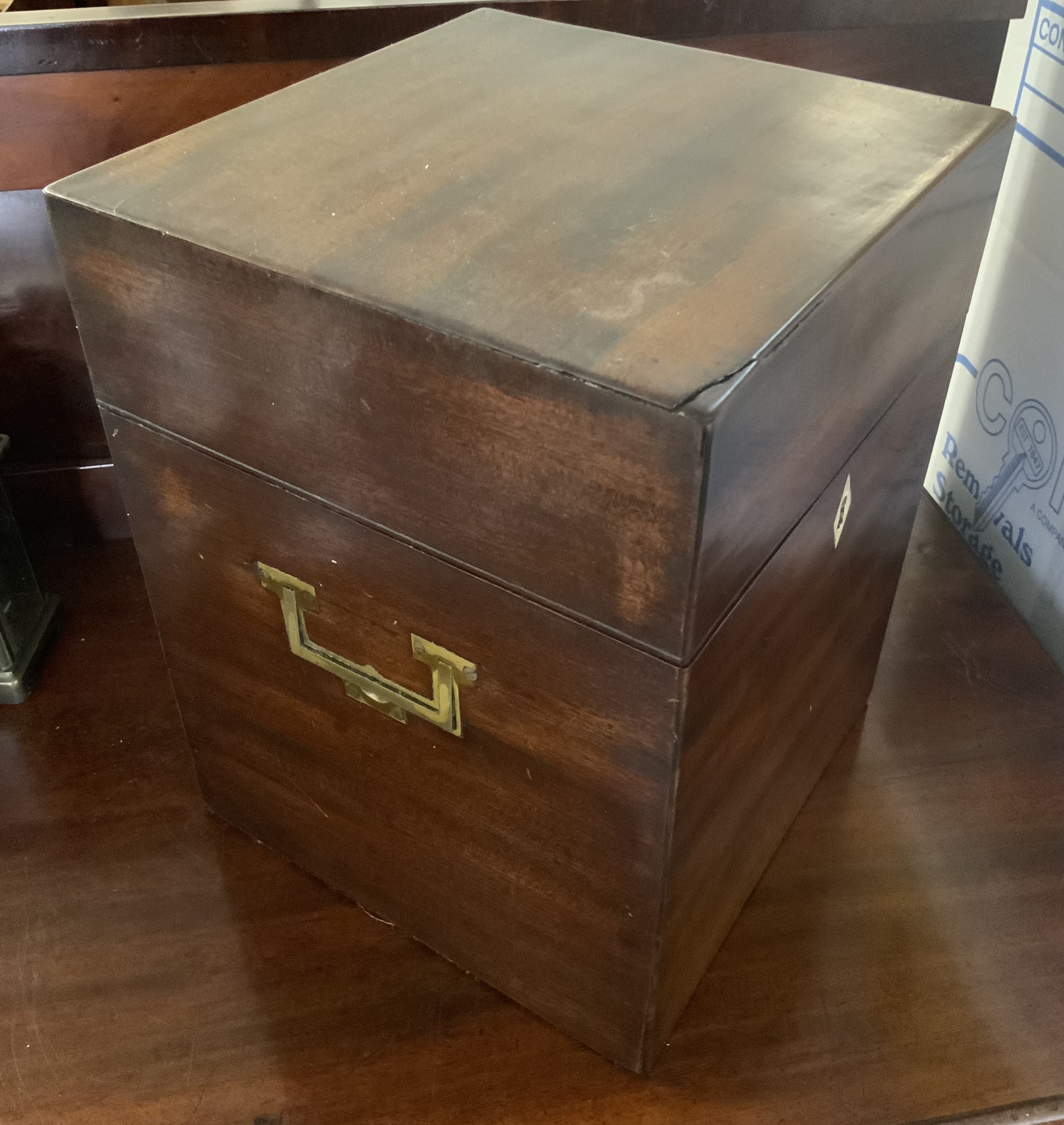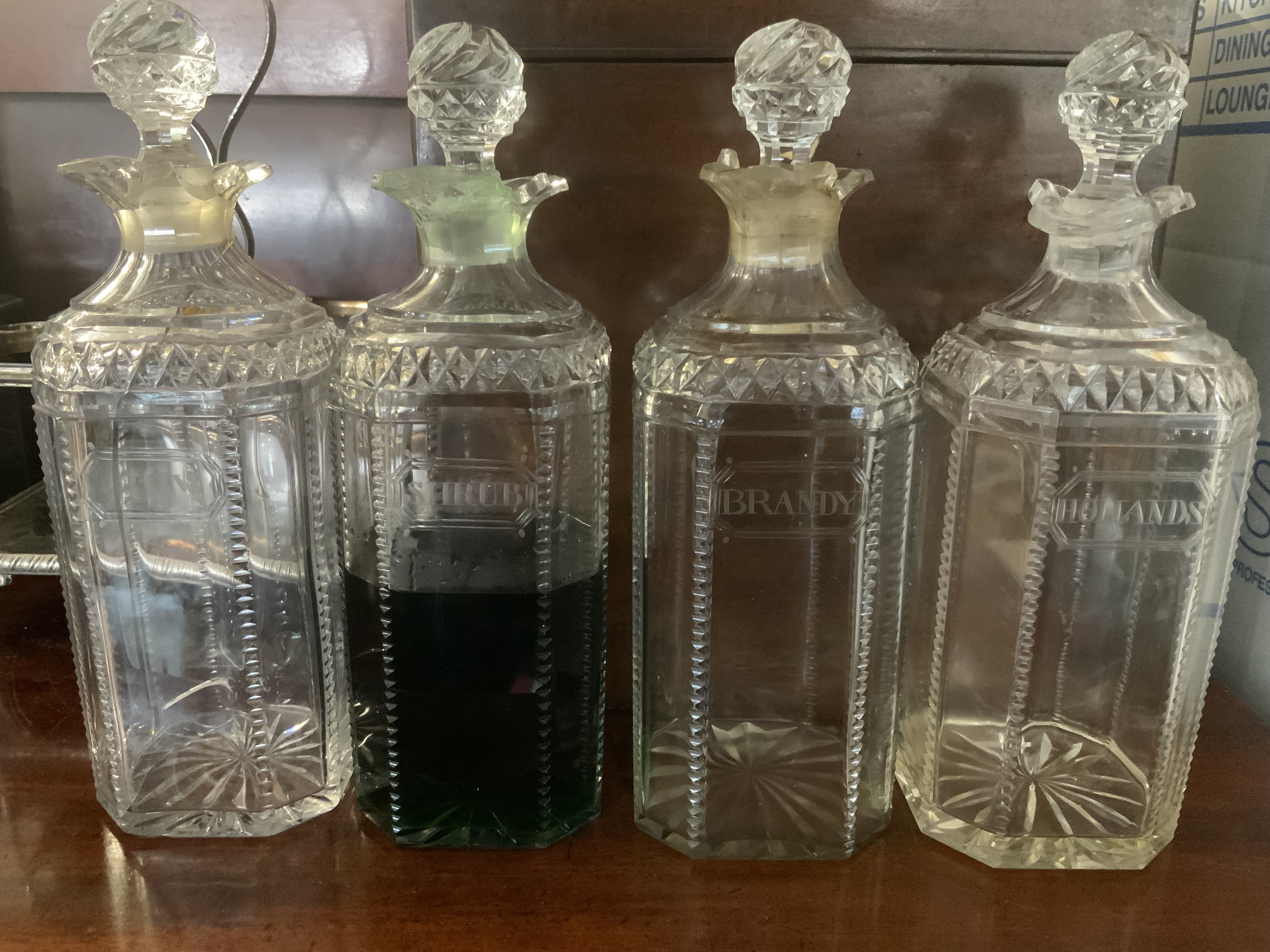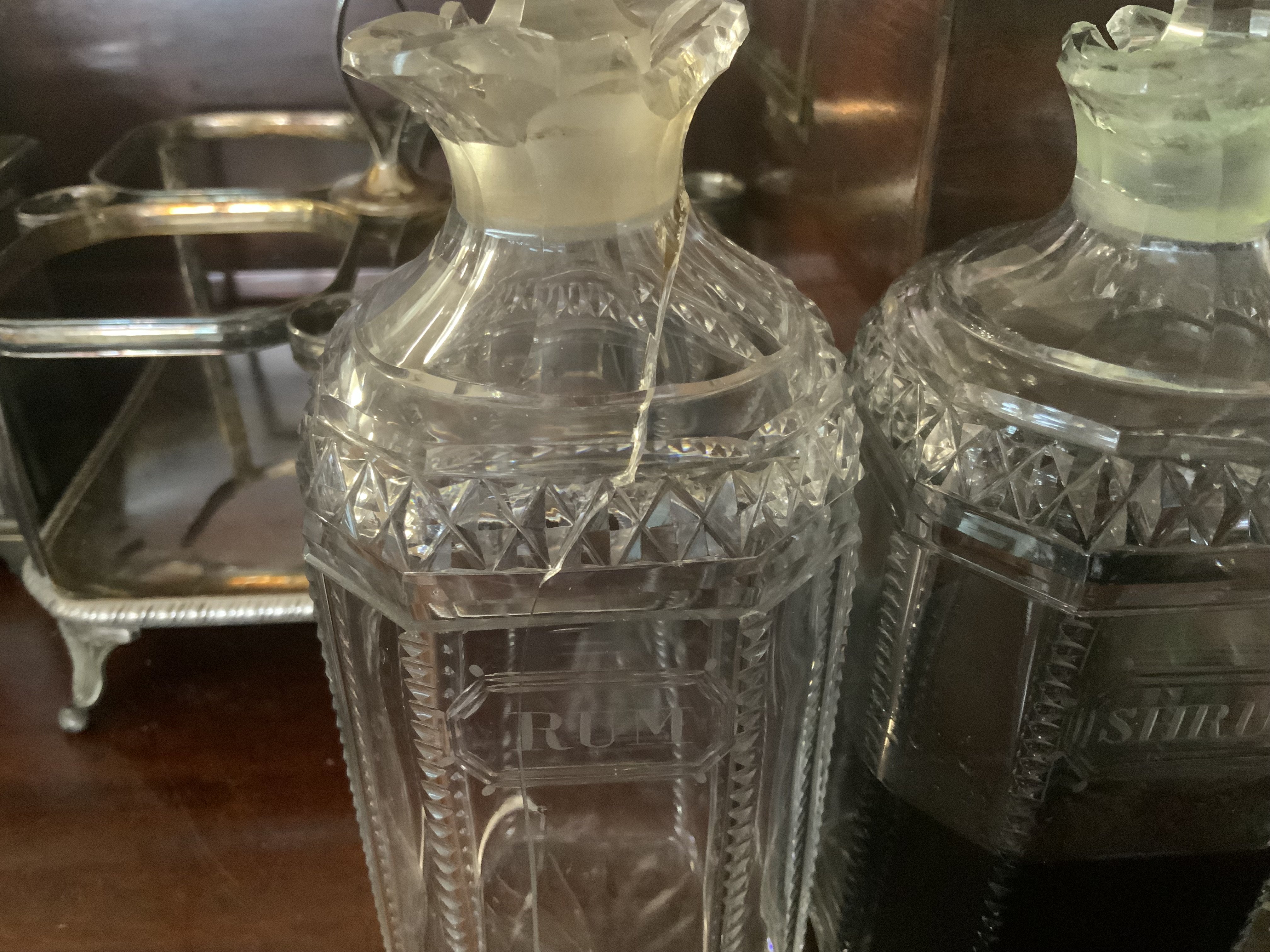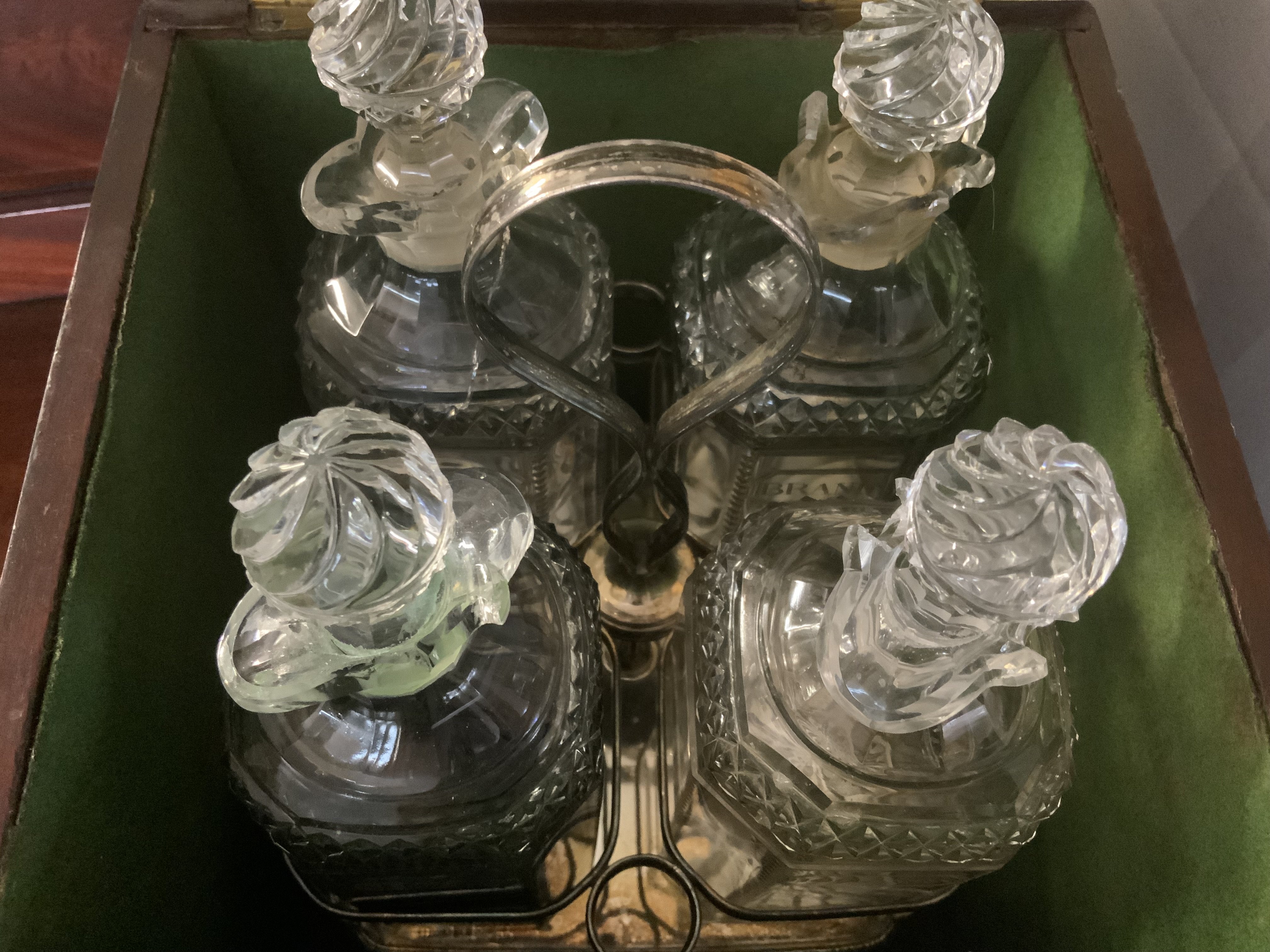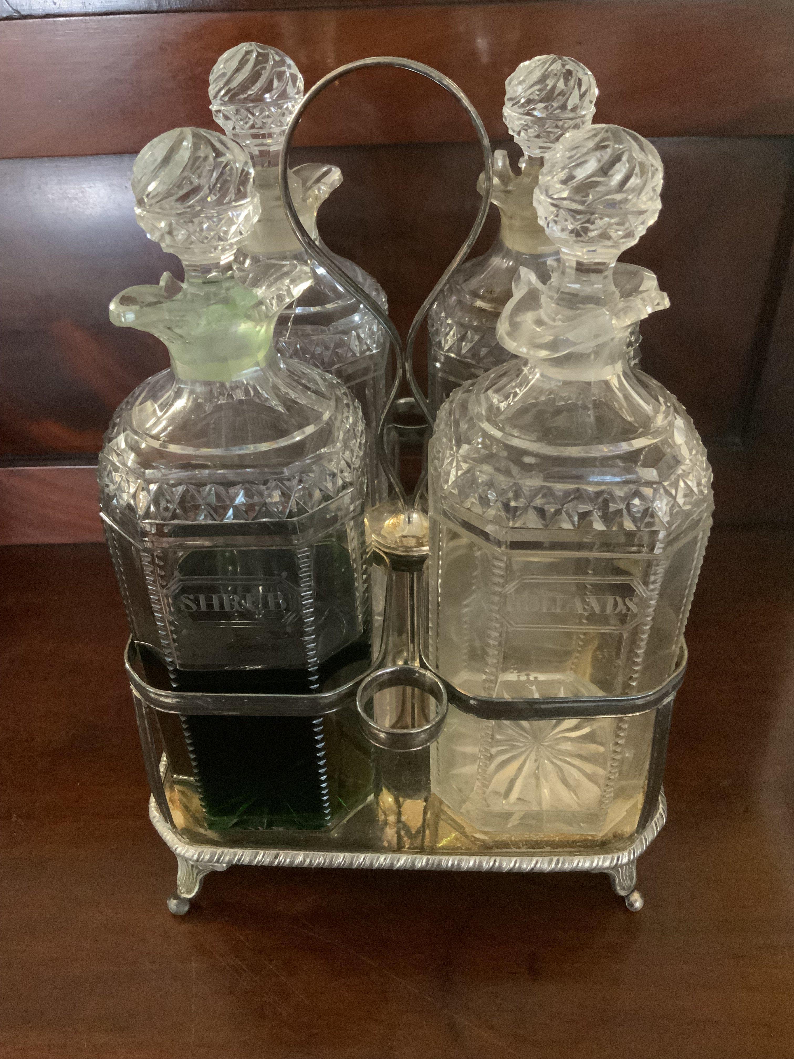 A Victorian silver plated mahiogany cased 4 bottle tantalus, Cut and engraved bottles glass bottles.