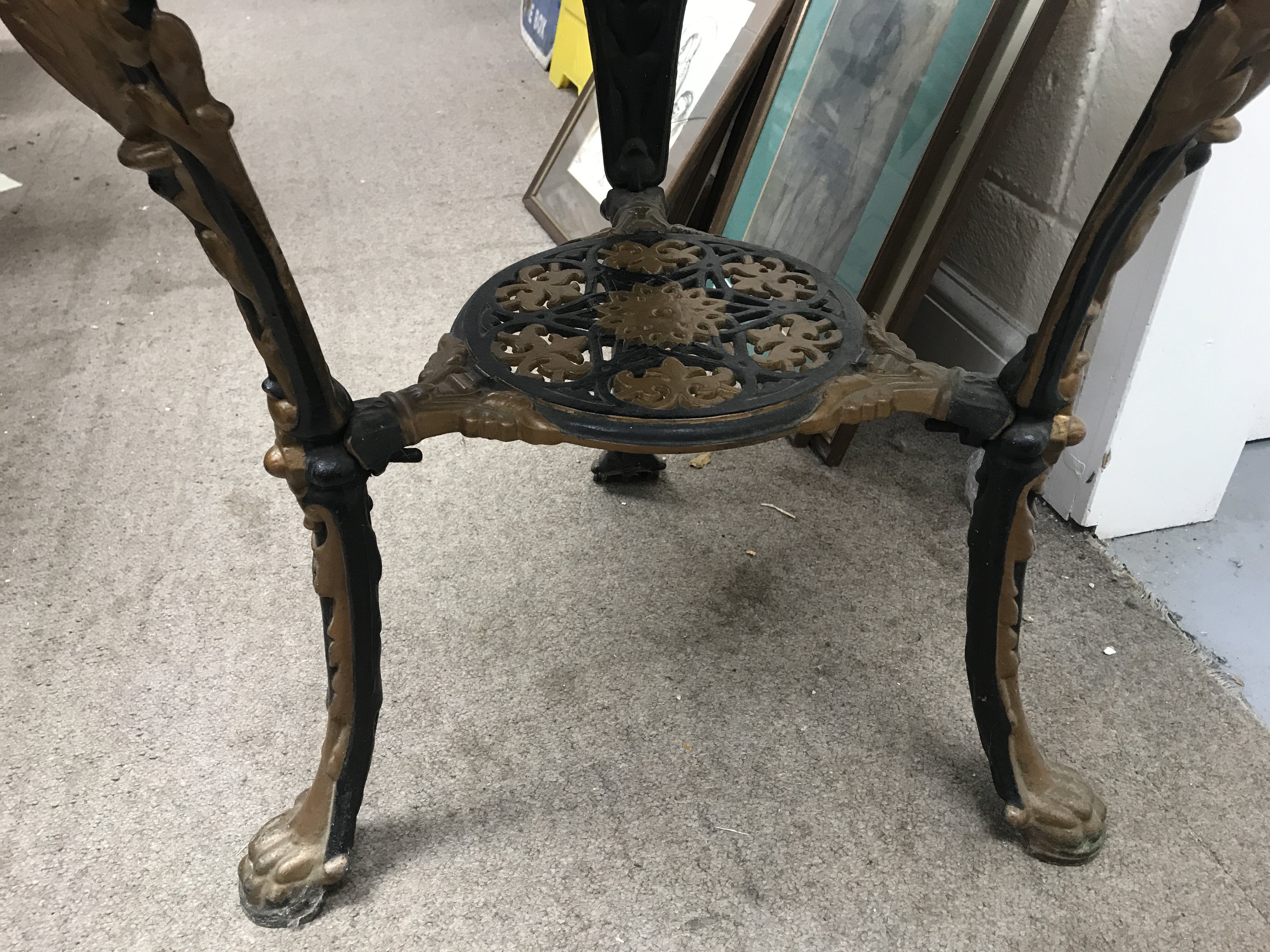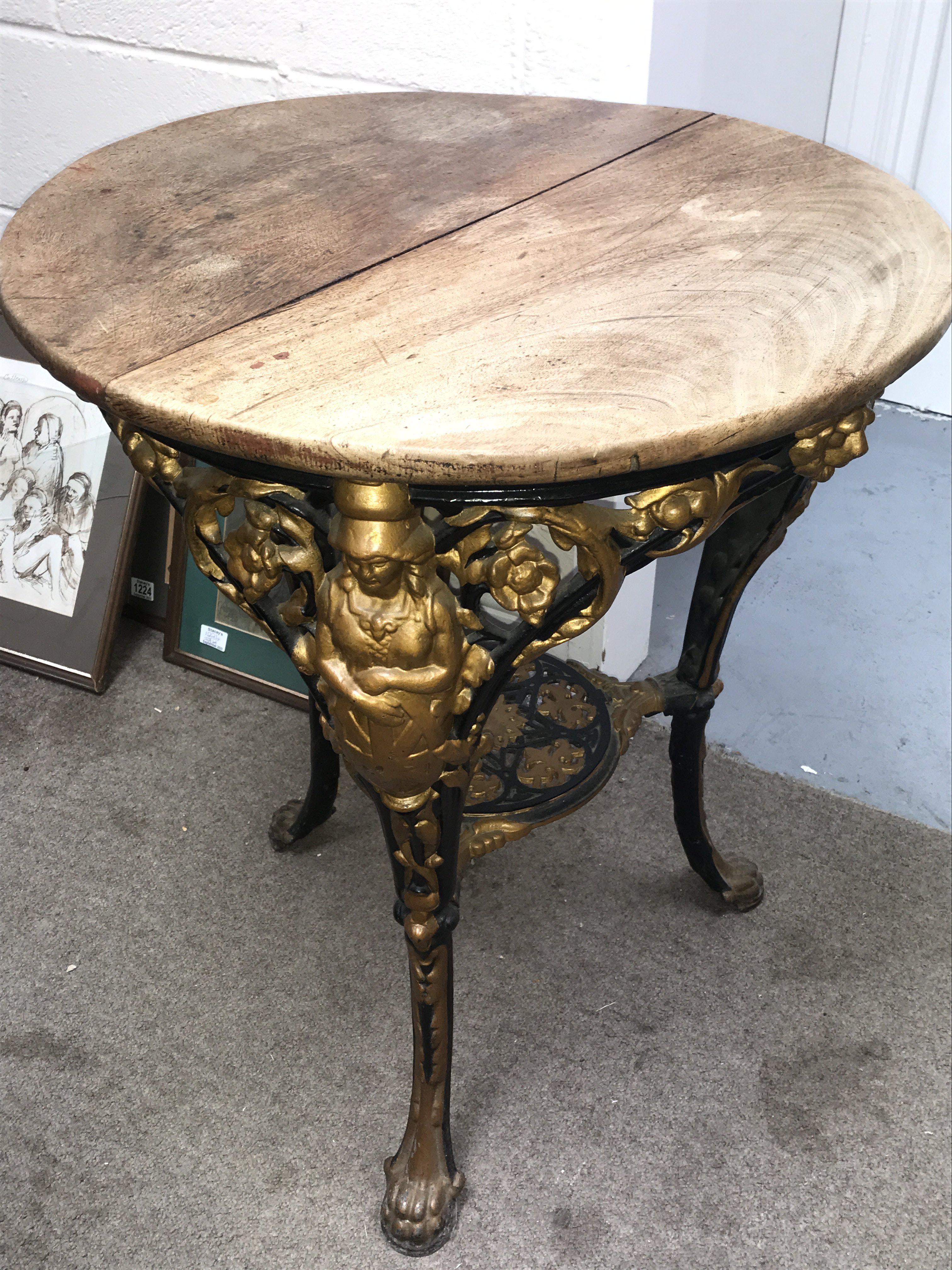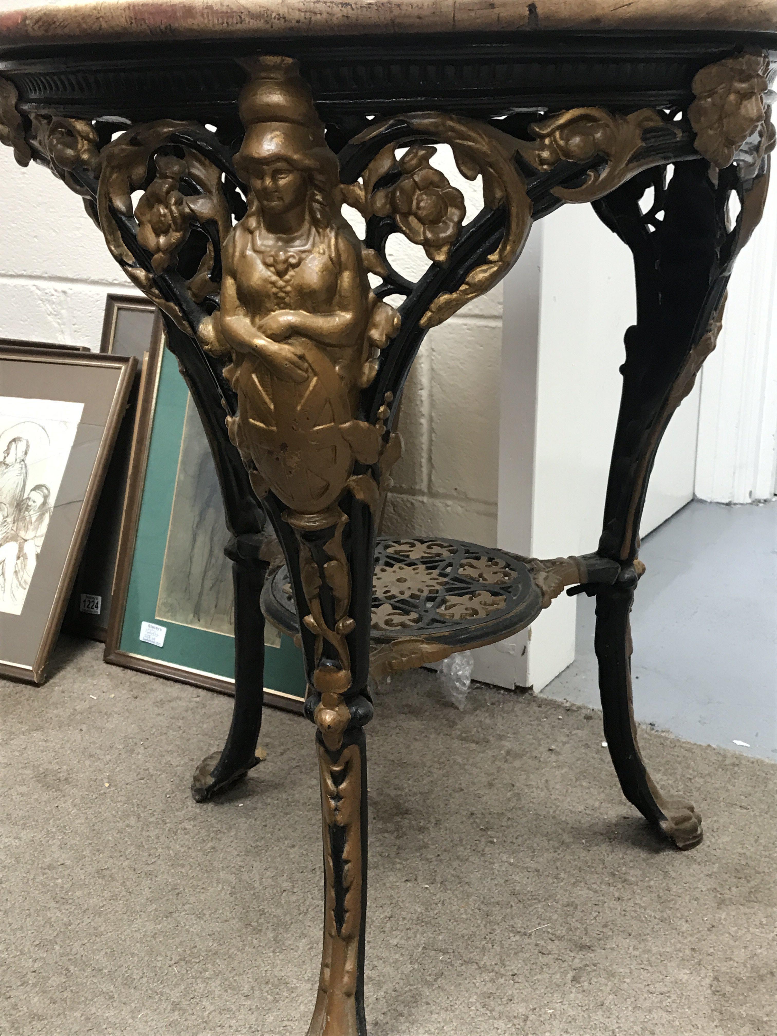 A Victorian cast iron pub table with lion paw feet, lion head, floral decoration and figures.