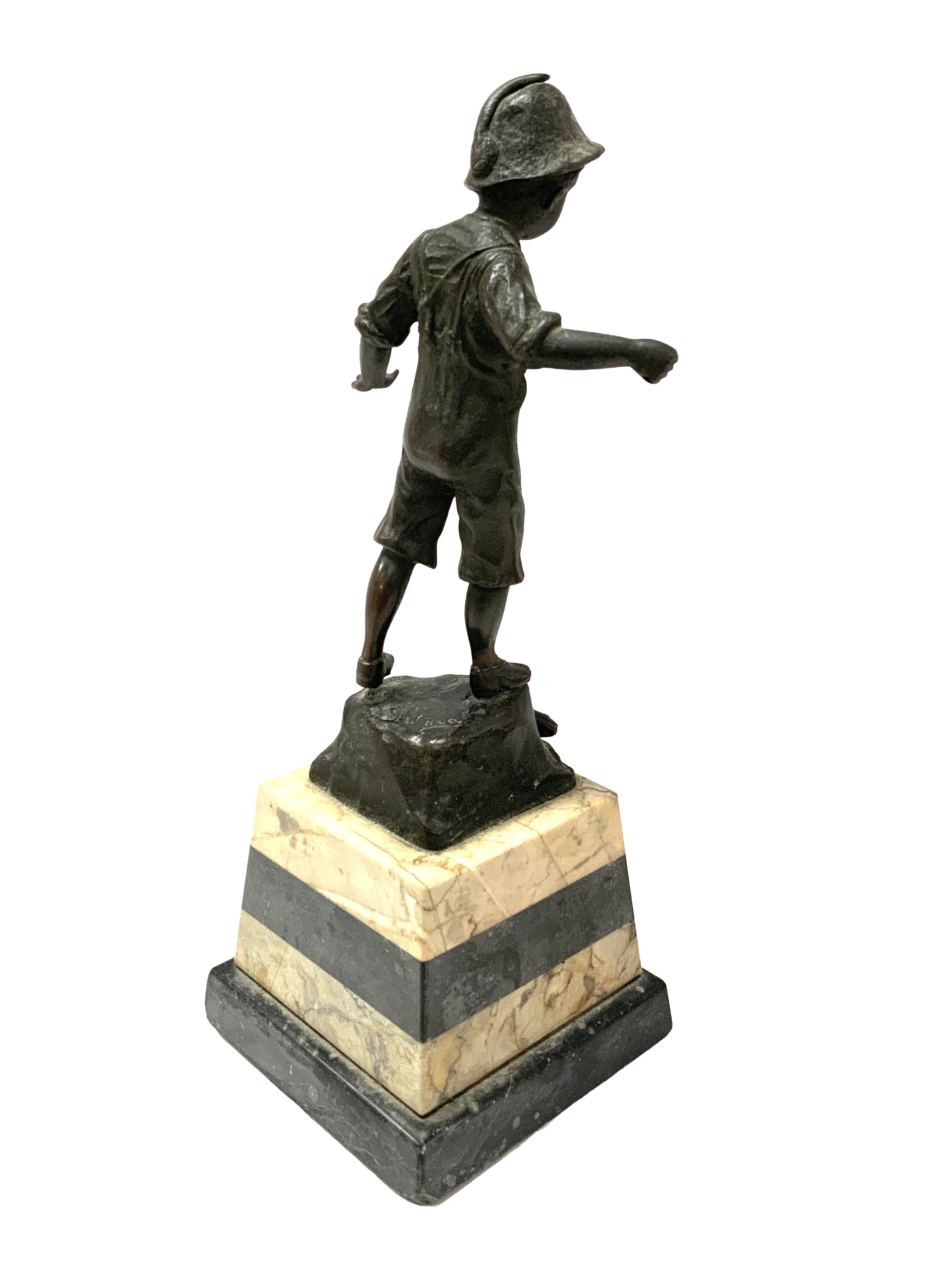 A small bronze figure of a fisher boy mounted on a marble base. 27cm.