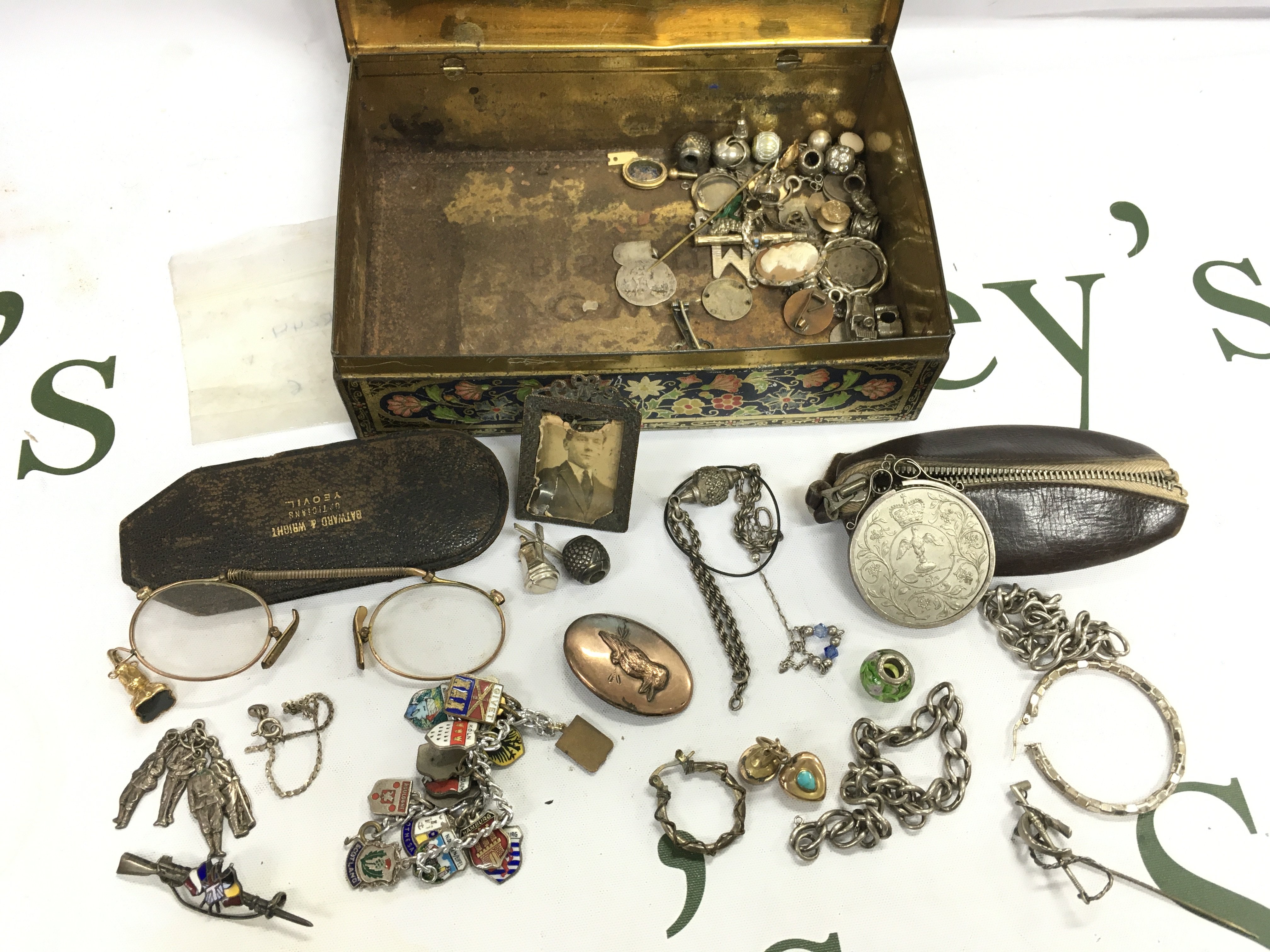 A tin of mixed silver odds, brooches , coins etc . Postage category B