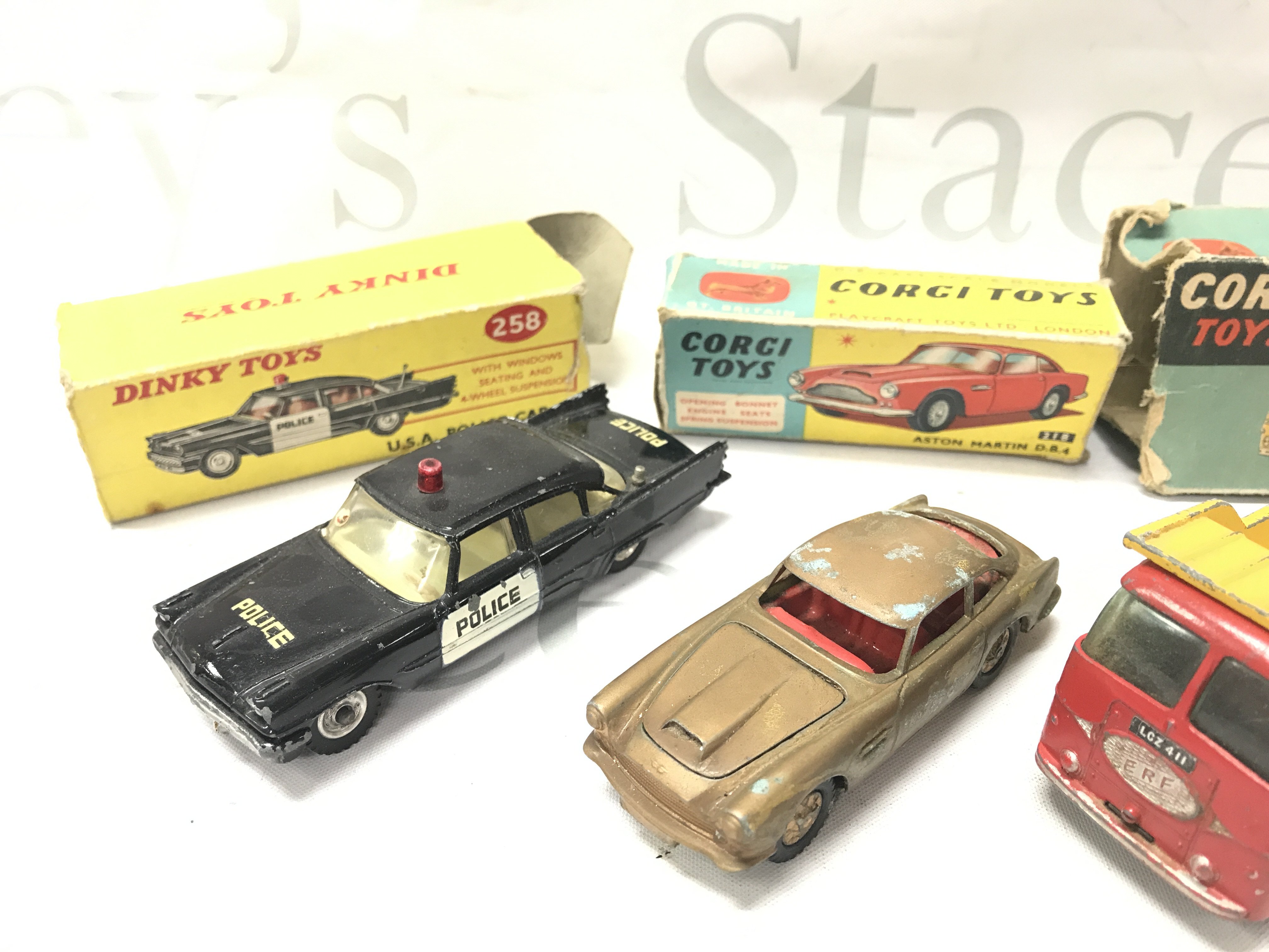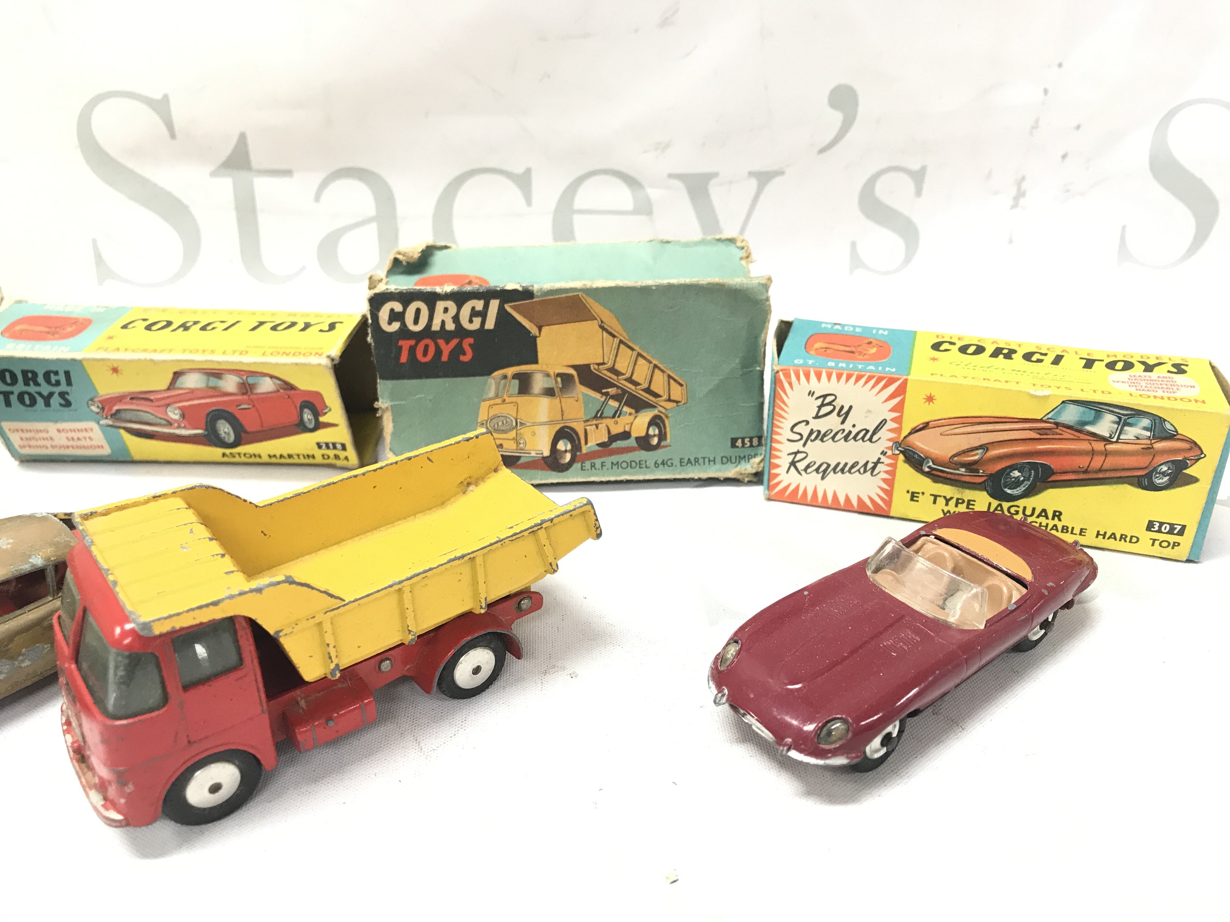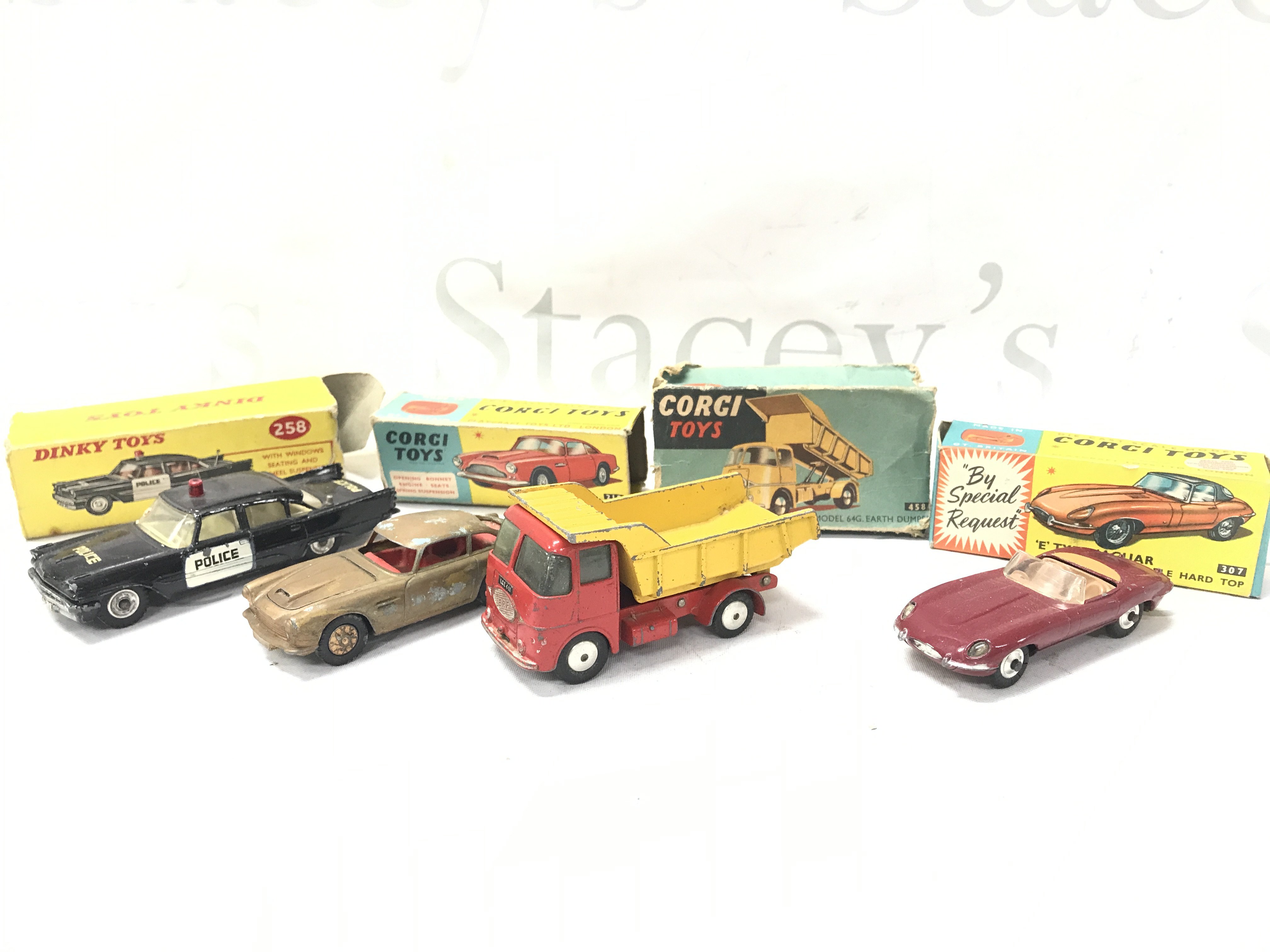 3 X Boxed Corgi And 1 X Dinky Boxed Diecast. All Playworn And Boxes Are Worn. Including A U.S.A Police Car #258. A Aston Martin DB4 #218. A ERF Model 64G Earth Dunper #458 And A E Type Jaguar #307 (Hard Top Missing). No Reserve.