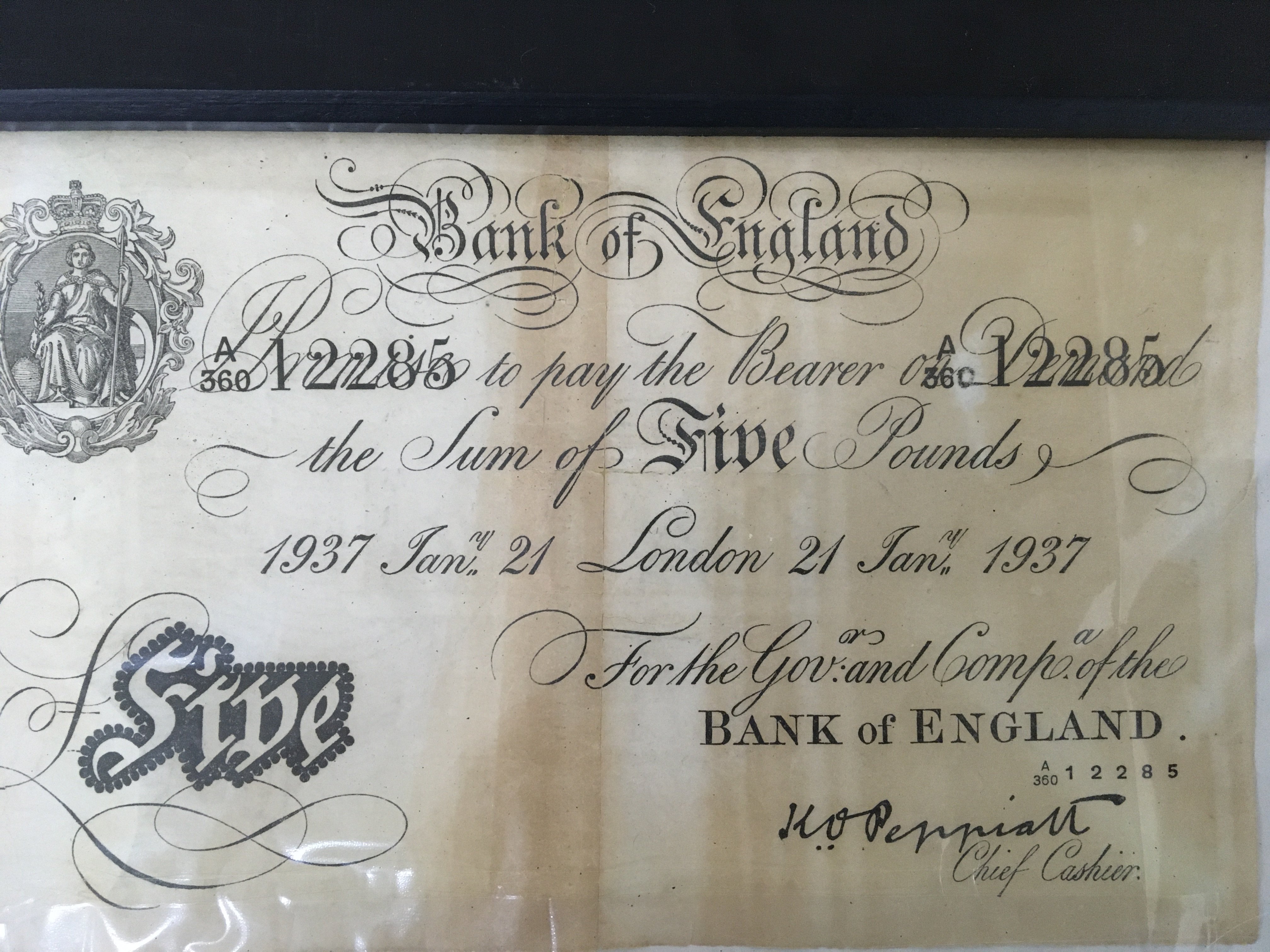 A collection of framed bank notes including a 1937 white five pound note 21 Jan 1937.