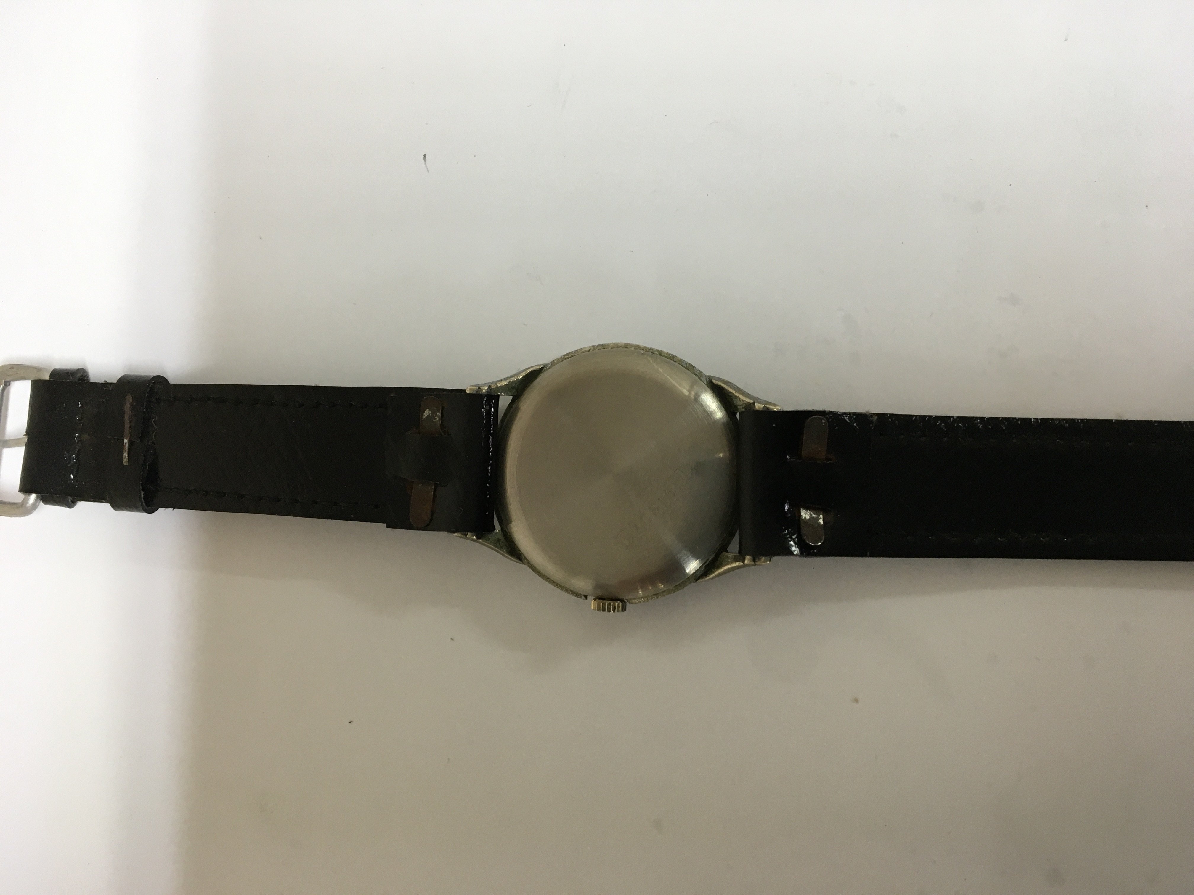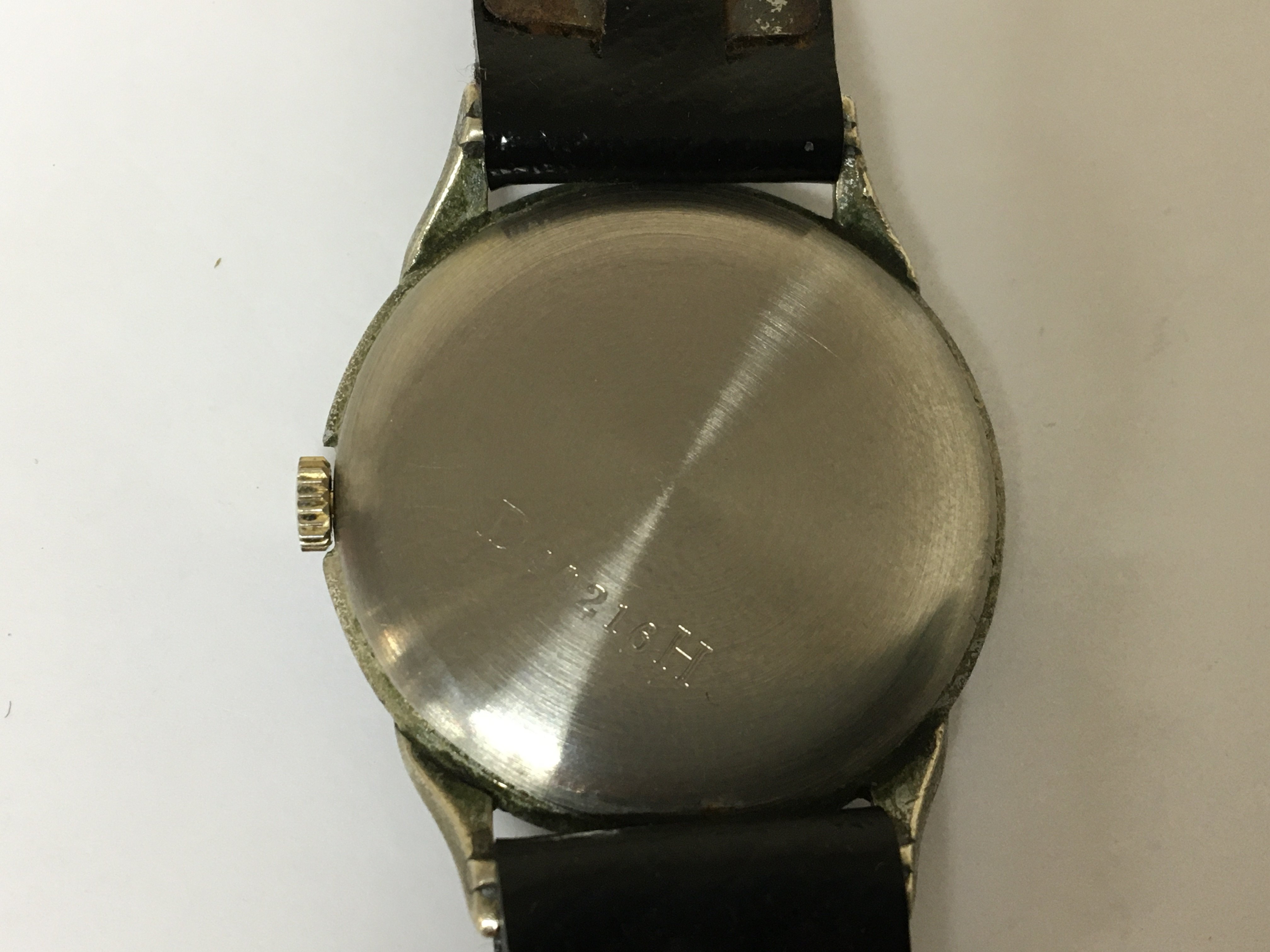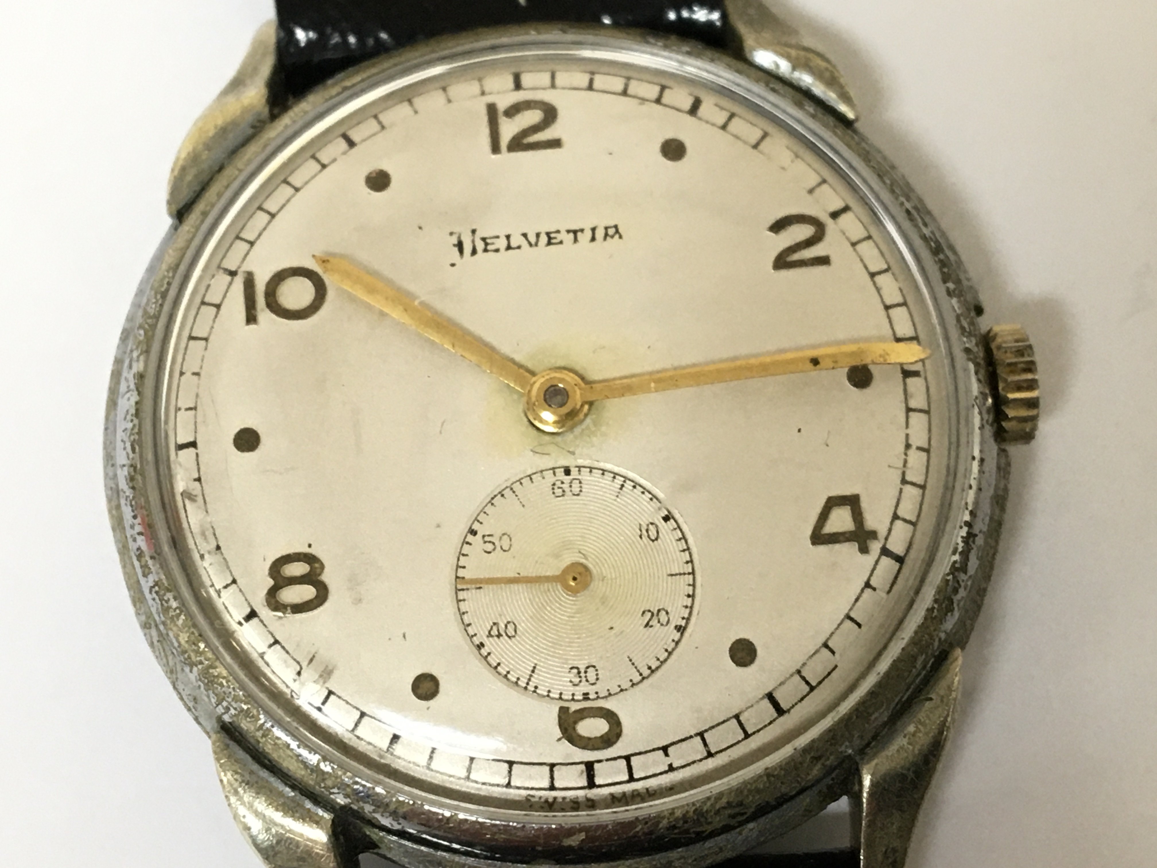 A German Third Reich Military watch maker Helvetia the dial with dot and even number markers second subsidiary dial the case with serial number D40216H watch seen working.