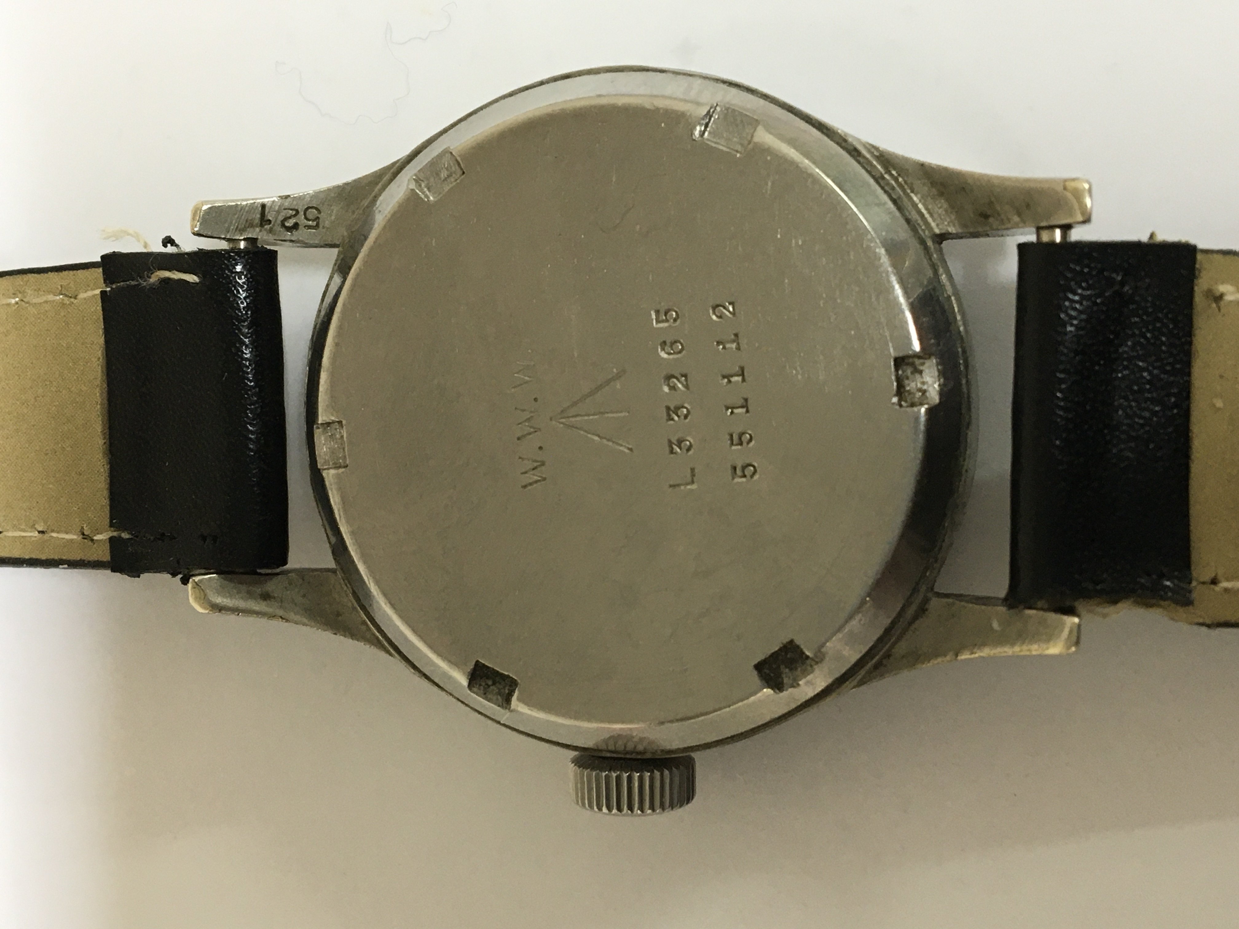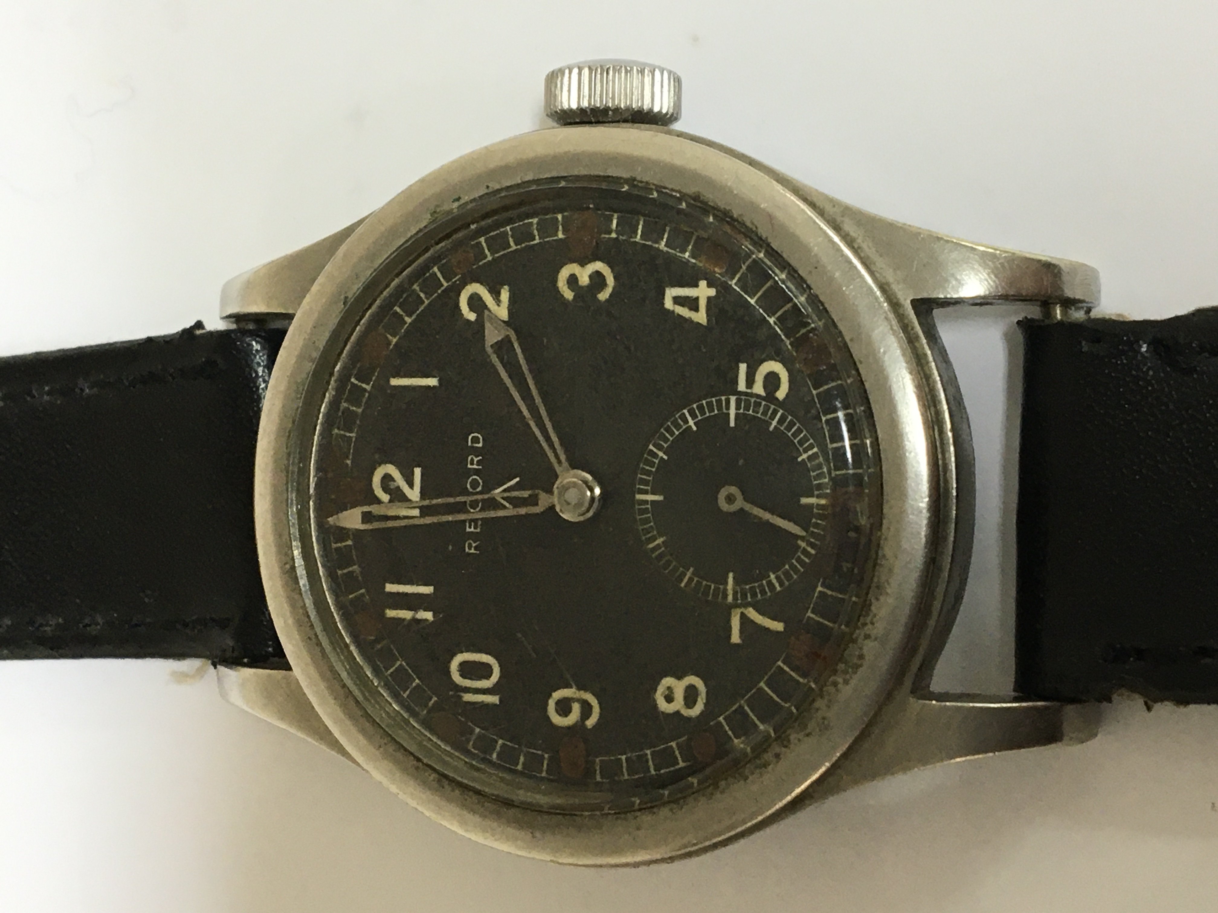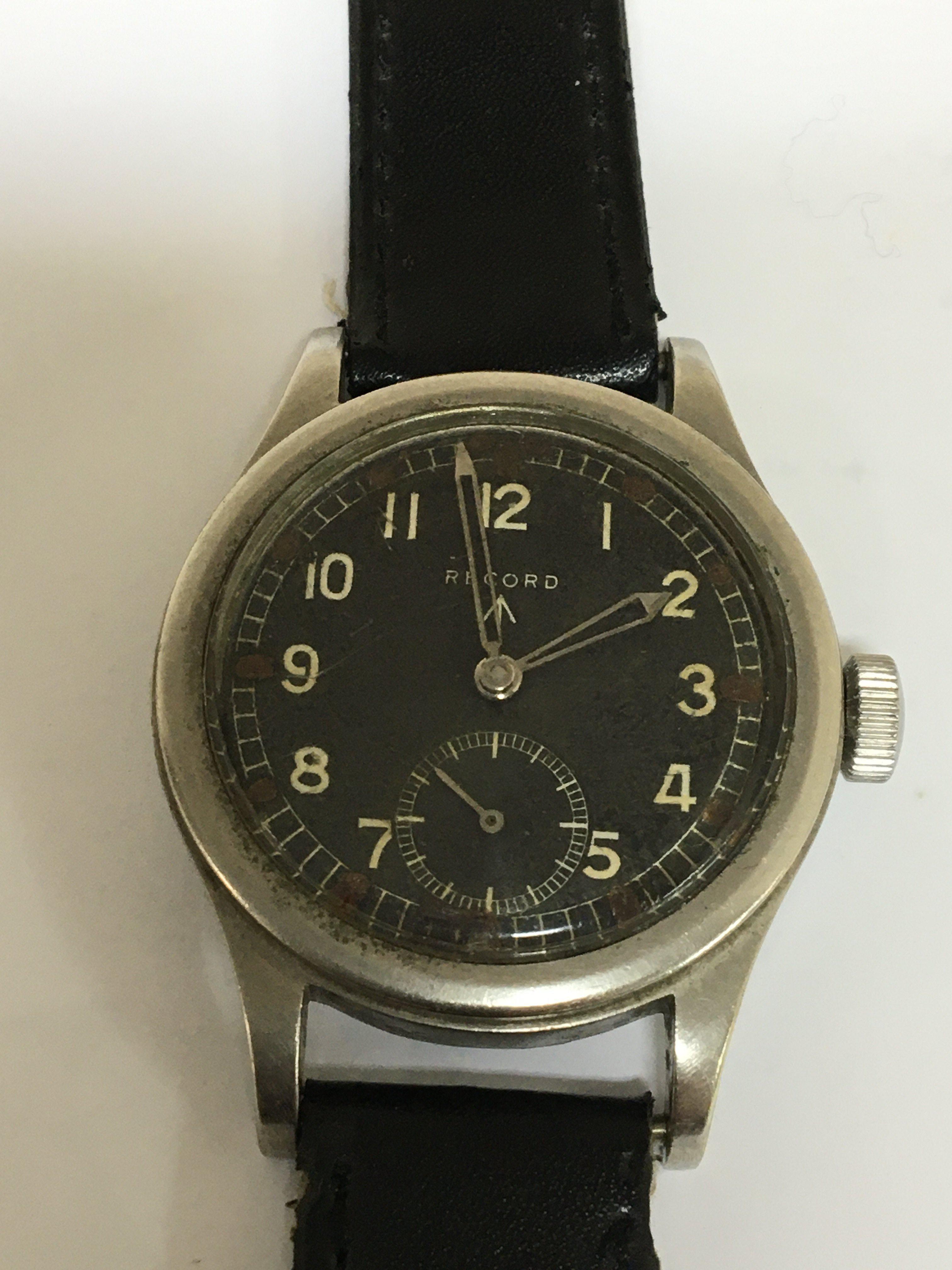 A Good Example of II world war British Military issue watch known as The Dirty Dozen maker Record the black dial with illuminated batons military symbol and second subsidiary dial seen working. The reverse with model and serial numbers L33265 551112.