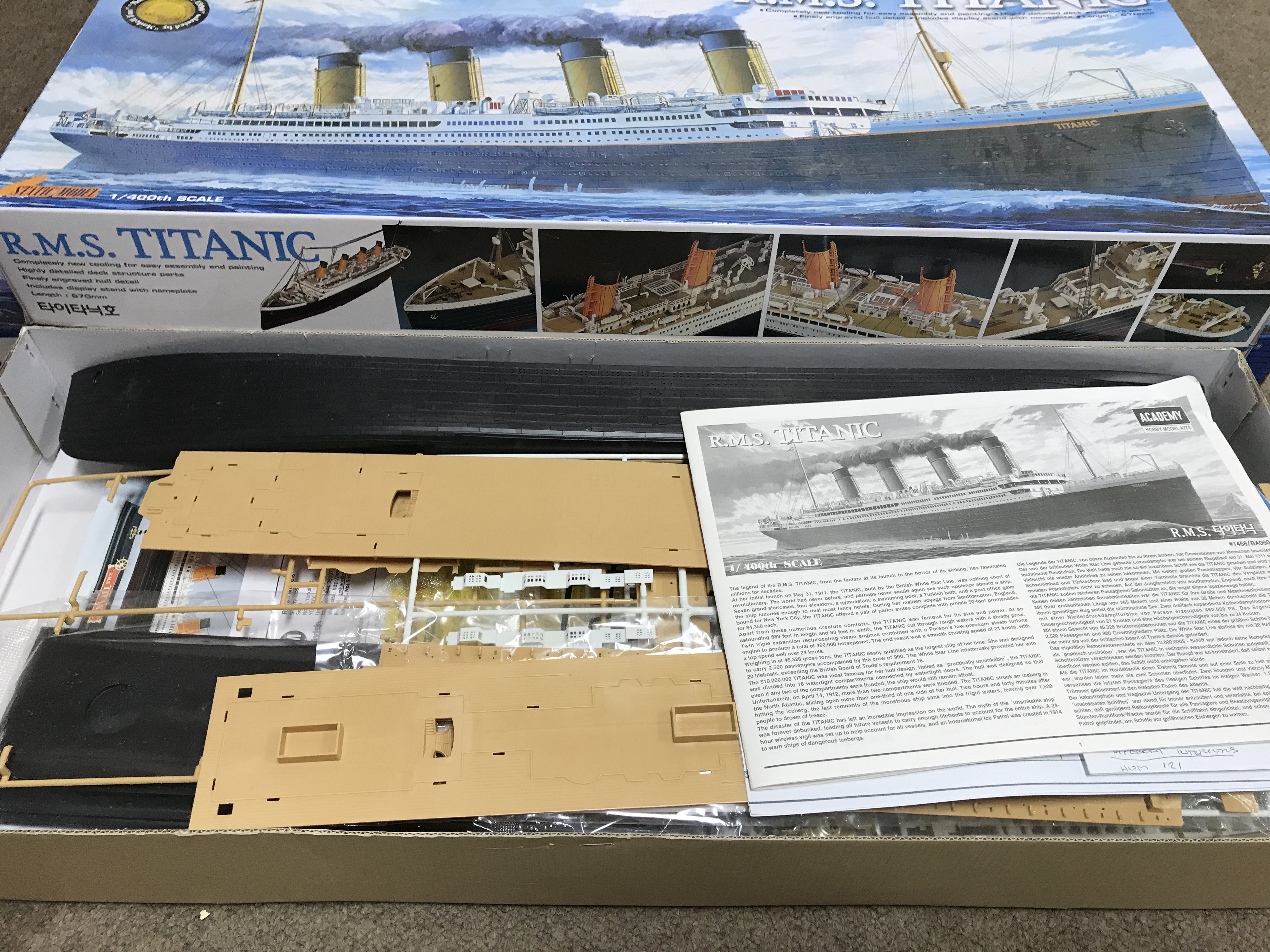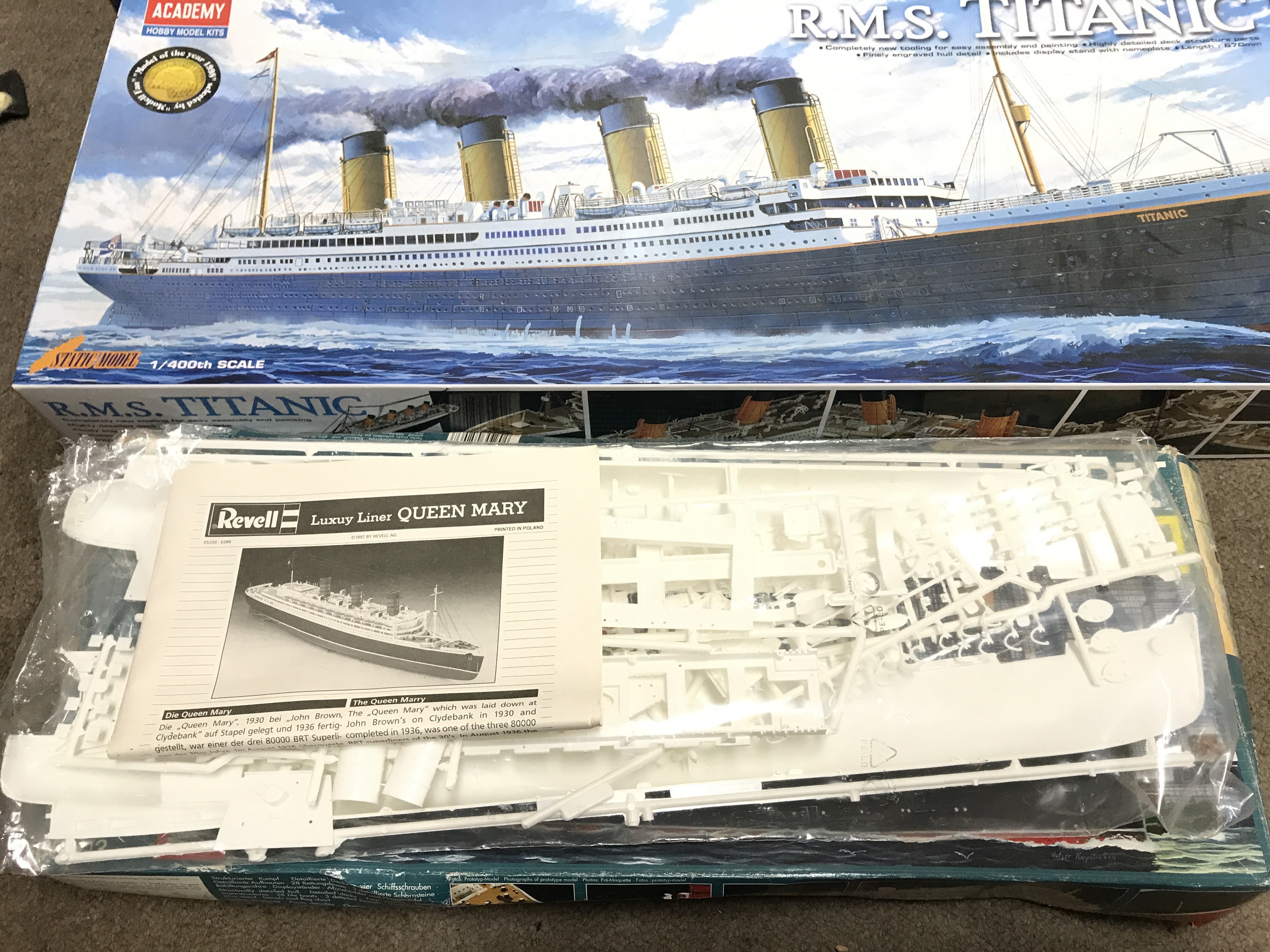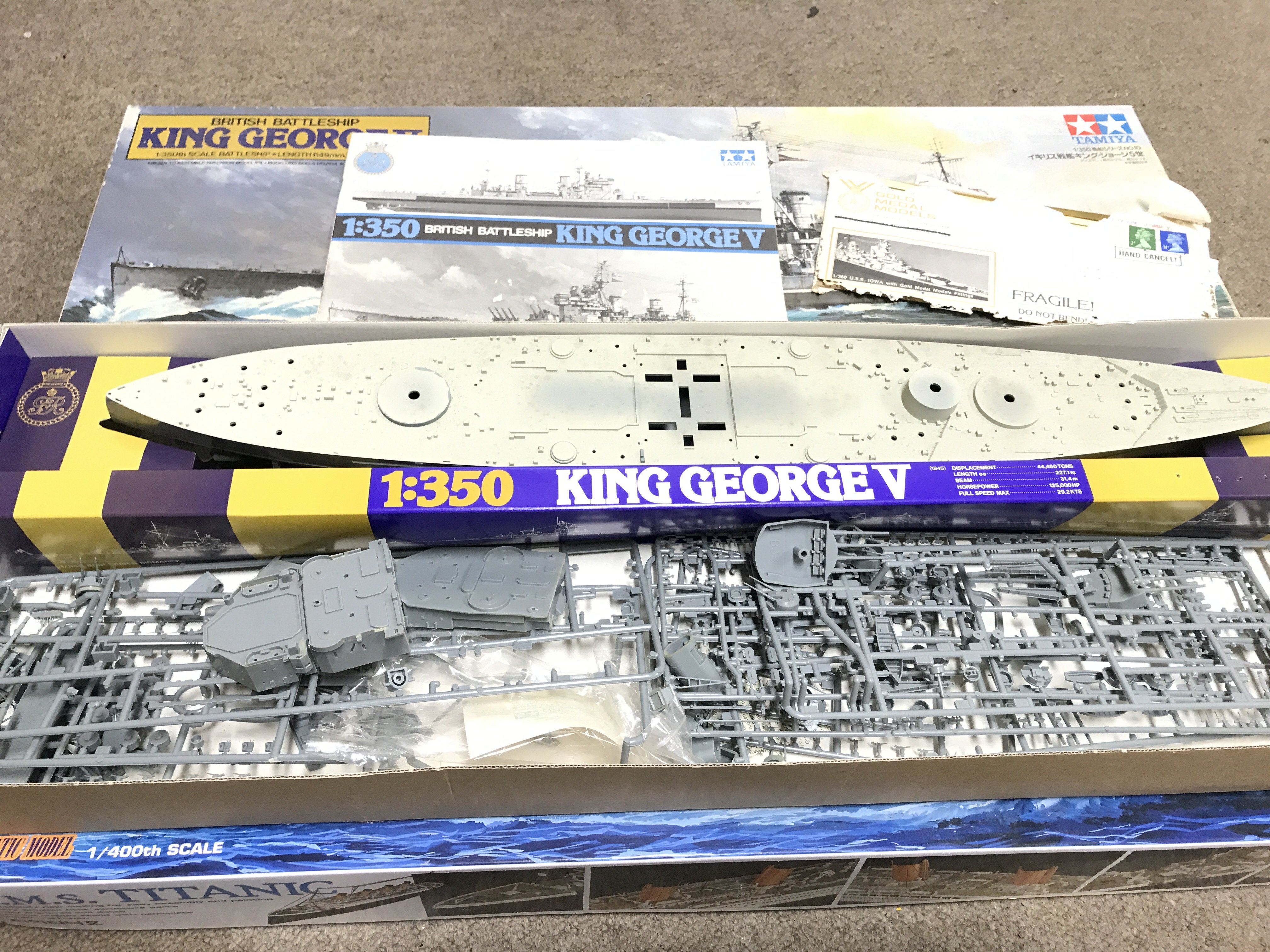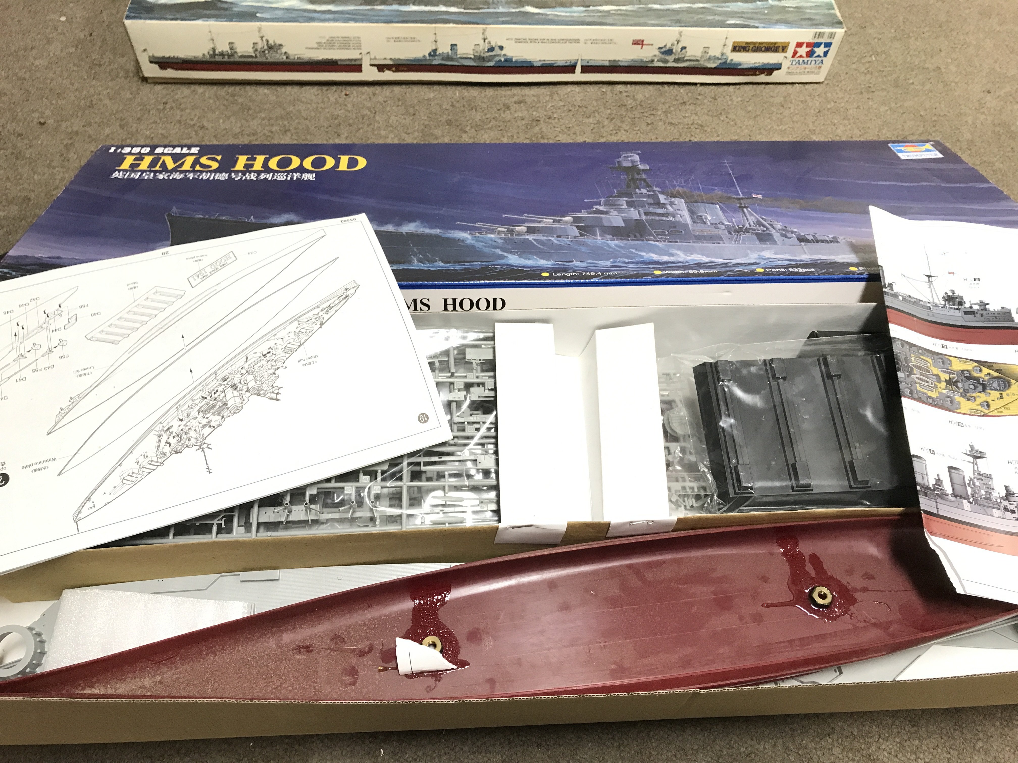 4 X Boxed Model Kits. A Trumpeter HMS Hood 1/350 Scale. A Academy RMS Titanic 1/400 Scale. A Revell Queen Mary 1/570 Scale (Parts Missing) And A Part Built Tamiya King George V1/350 Scale. No Reserve. (4).