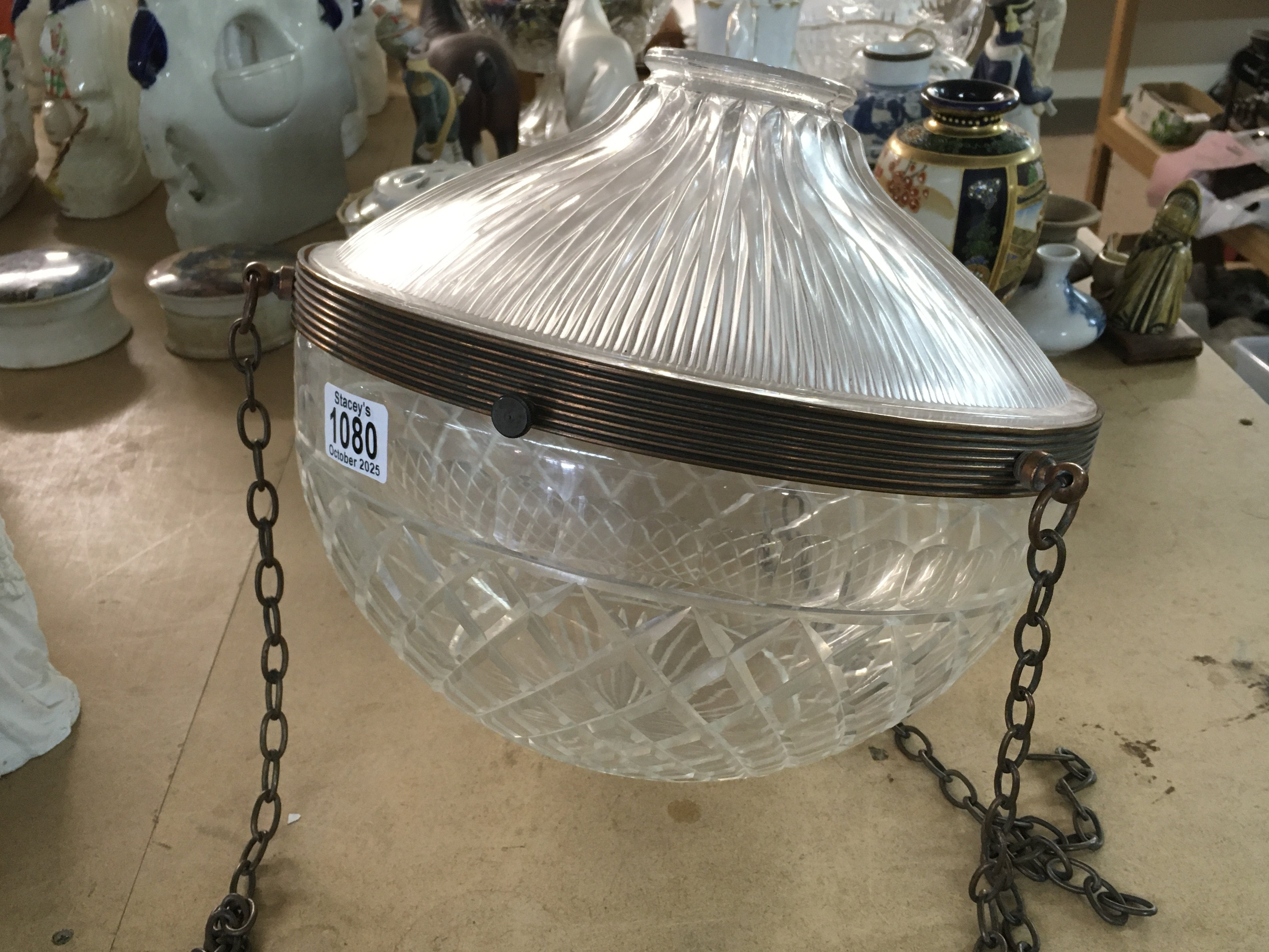 A 1940s cut glass lamp shade with copper finished mounts and chains with additional homophone pressed glass cover. 32cm diameter x 34cm depth. Slight rim chips.