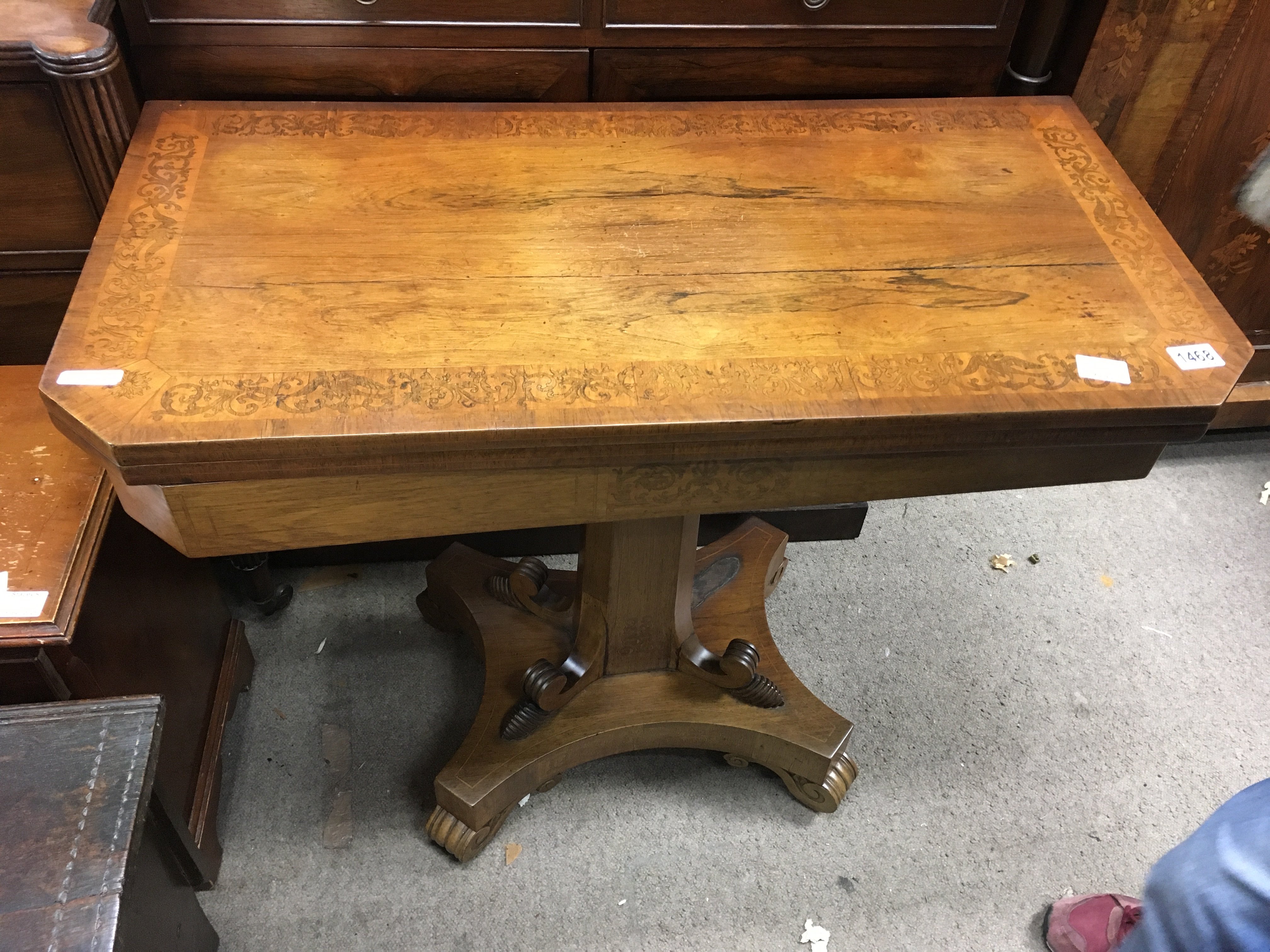 A Victorian walnut card table, the inlaid twin flat top above a shaped colour non a plinth base