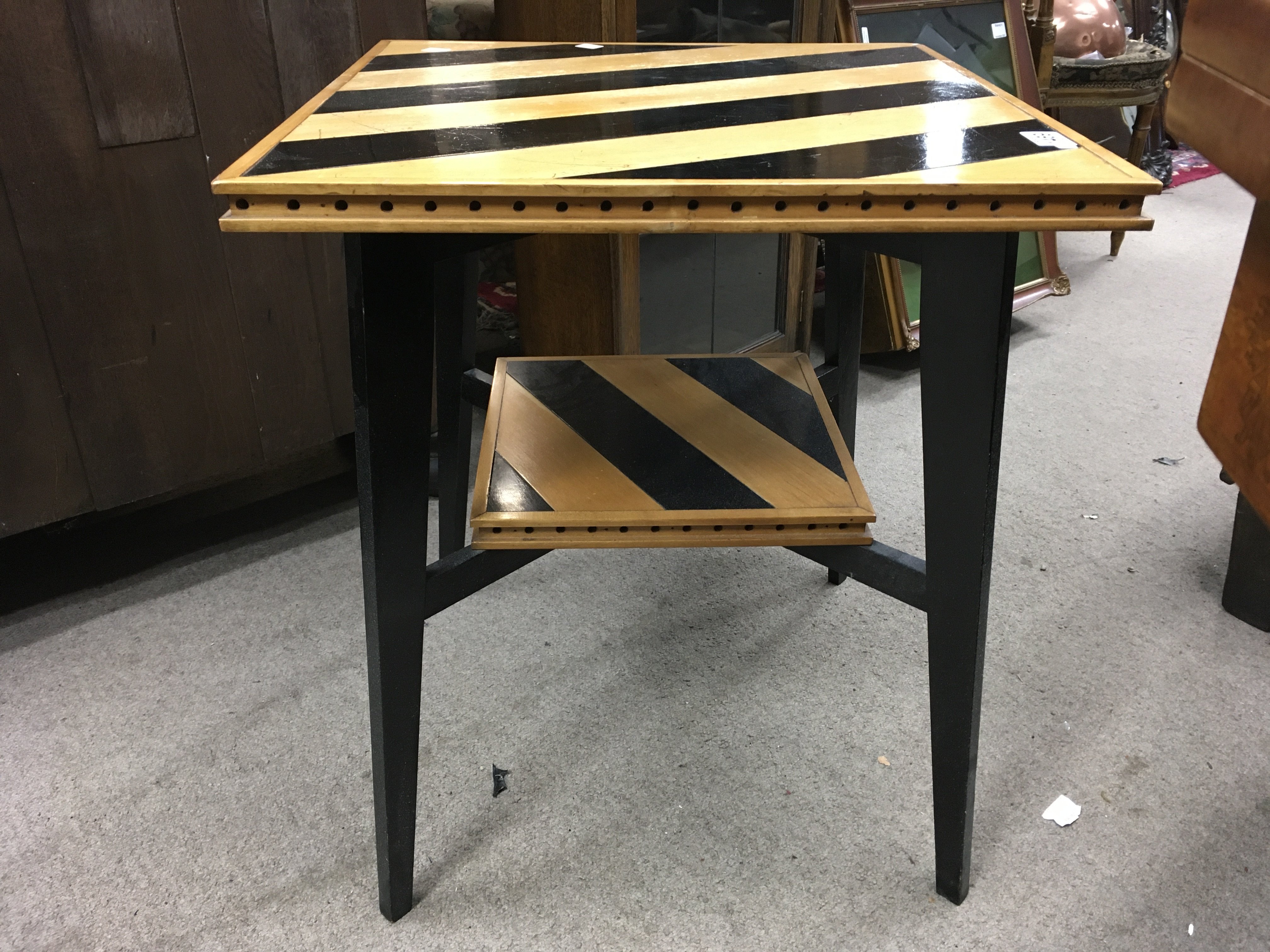 An Art Deco occasional table, the rectangular striped top above square tapering legs, United by an under tier. Attributed to Charles Dudouyt. 62cm x 53cm