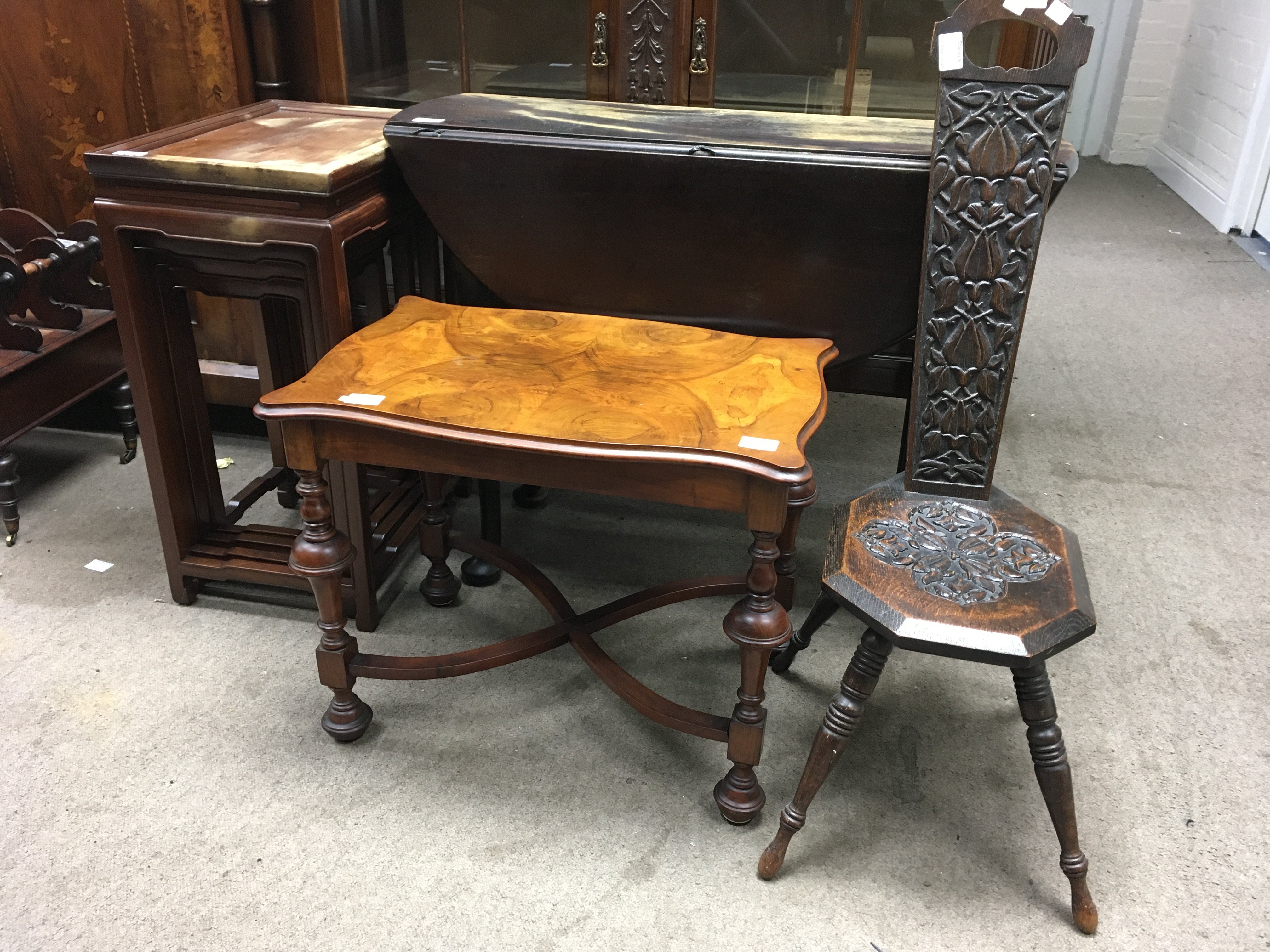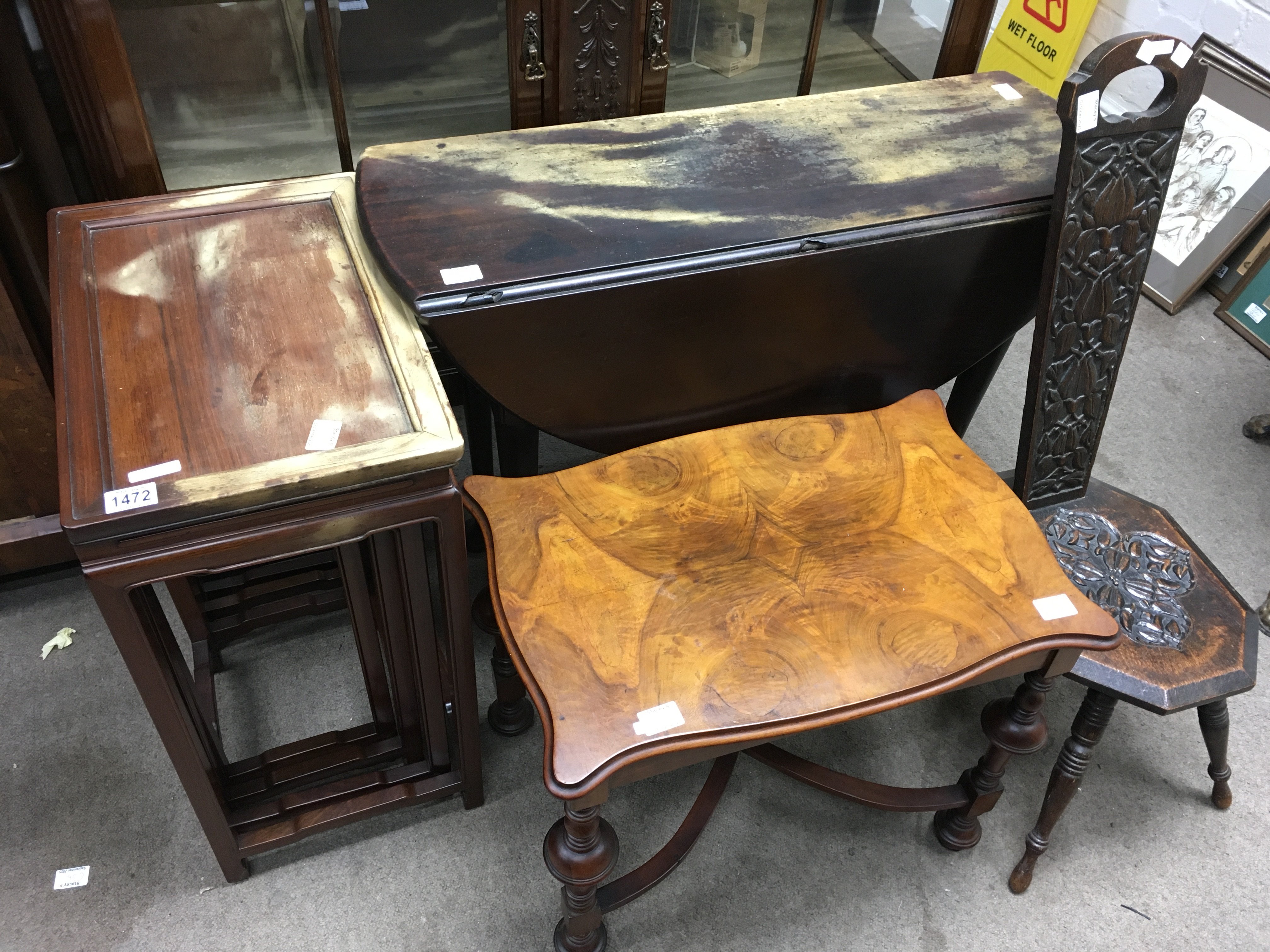 A Collection of furniture comprising a low walnut occasional table, Georgian drop leaf table, a spinning chair and a nest of three oriental tables