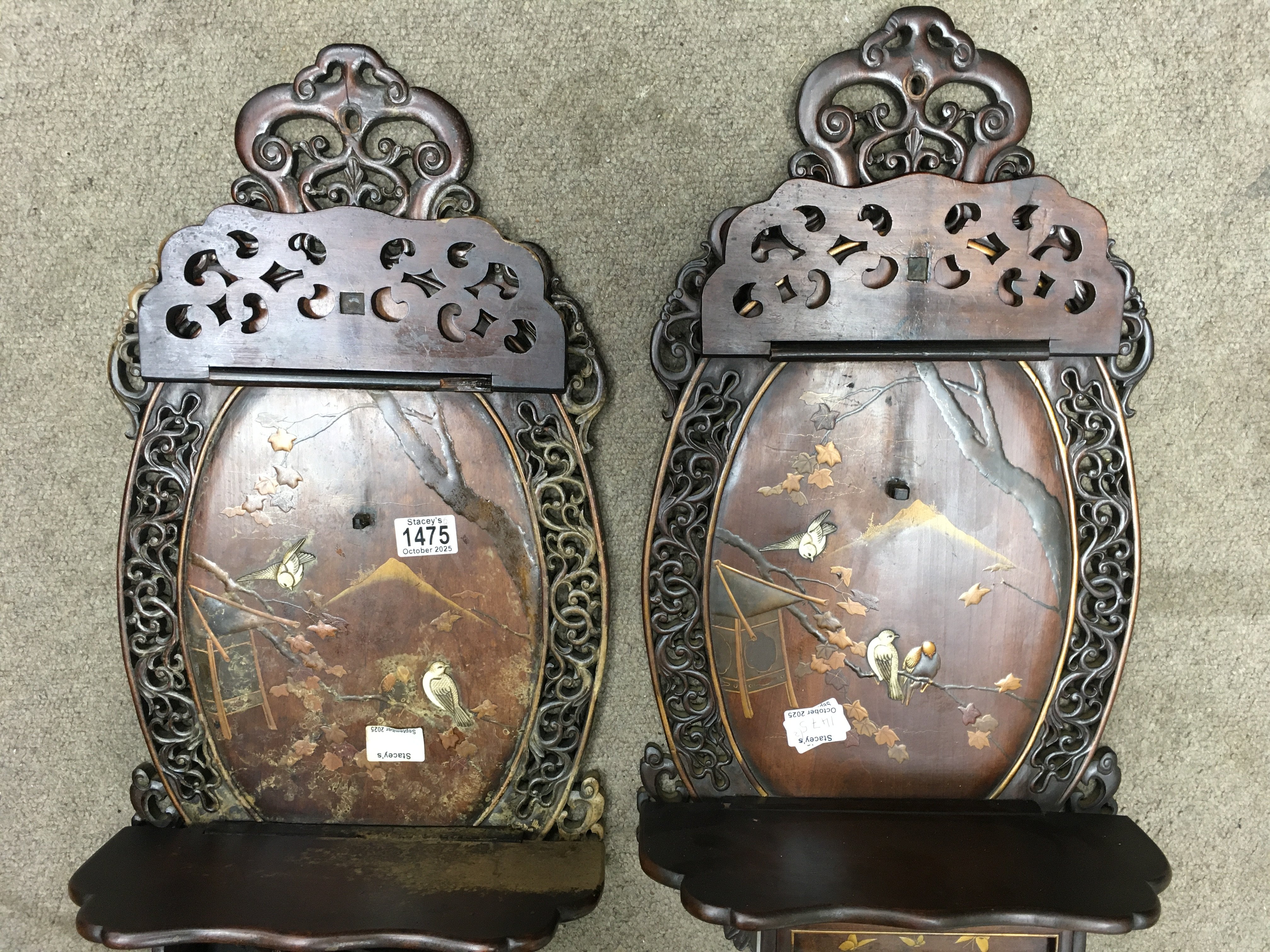 A pair of Victorian mahogany wall brackets inlaid with oriental scenes, with single shelf. 70cm x 32cm