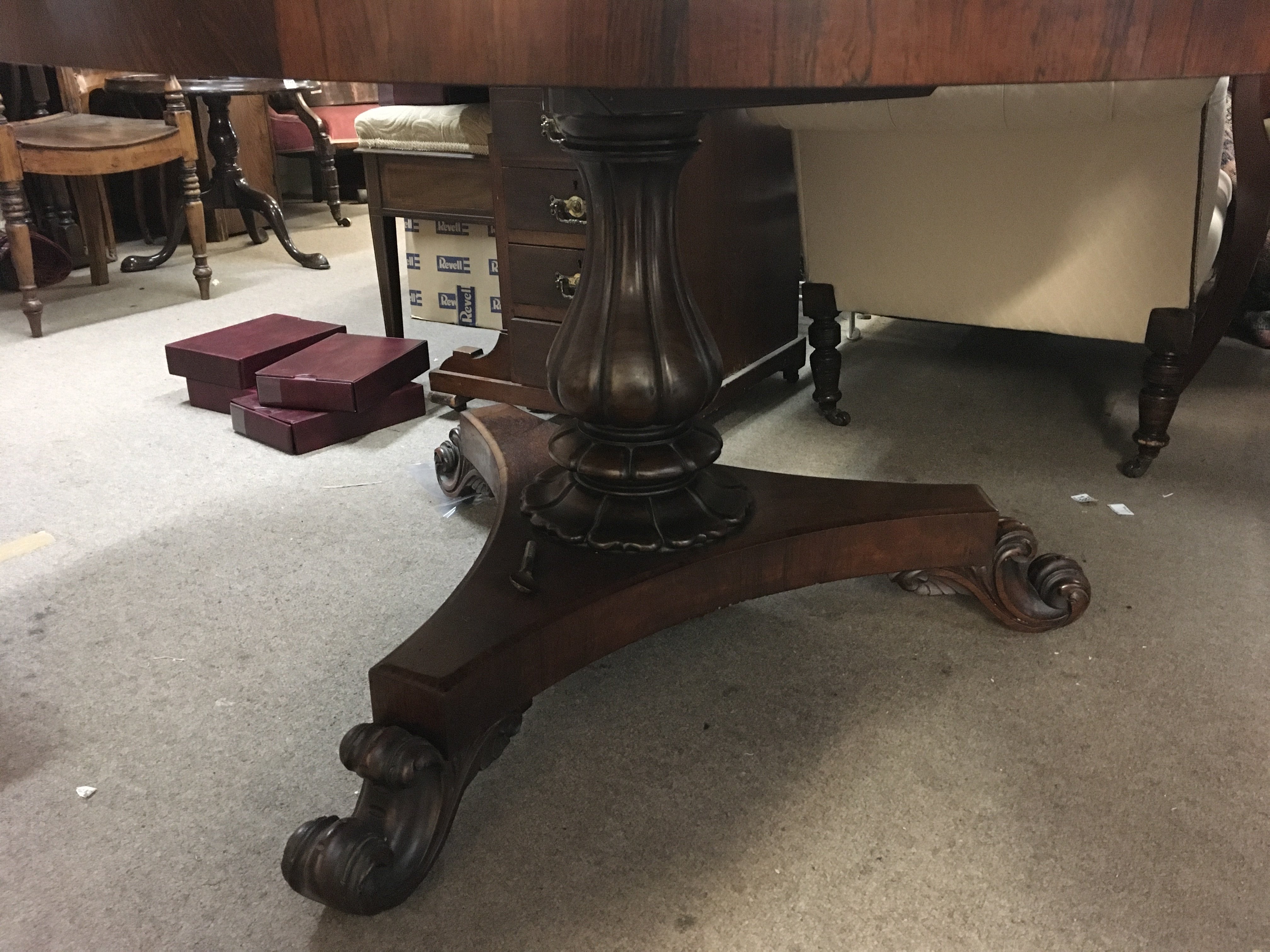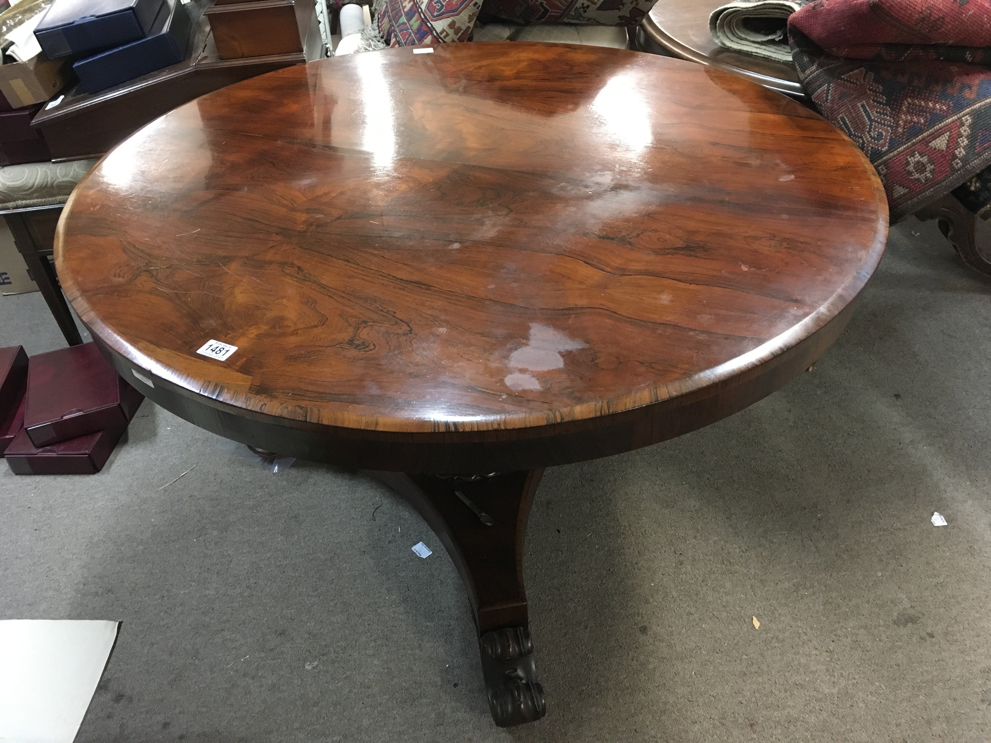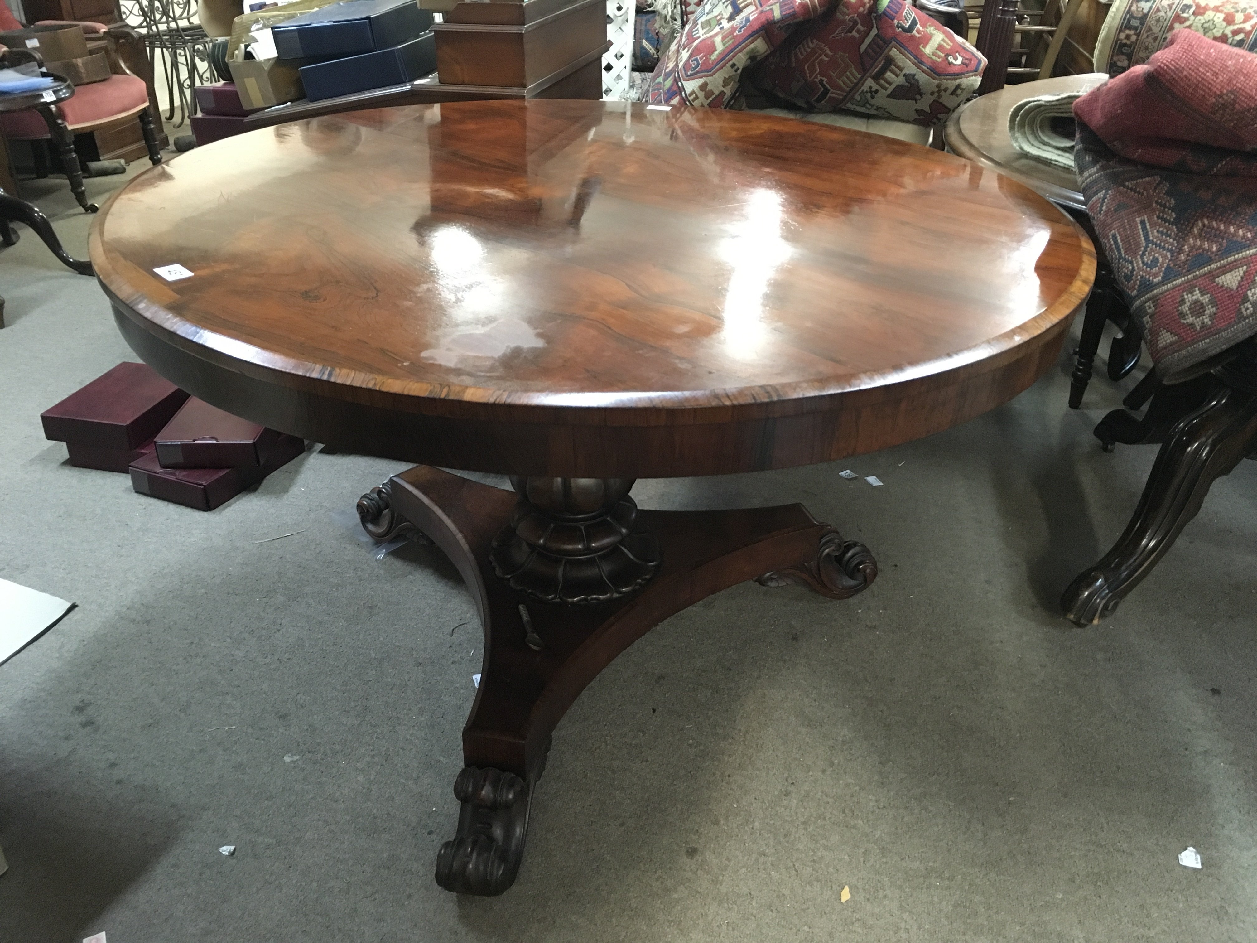 A Victorian rosewood dining table, the circular top above a turned column on shaped base