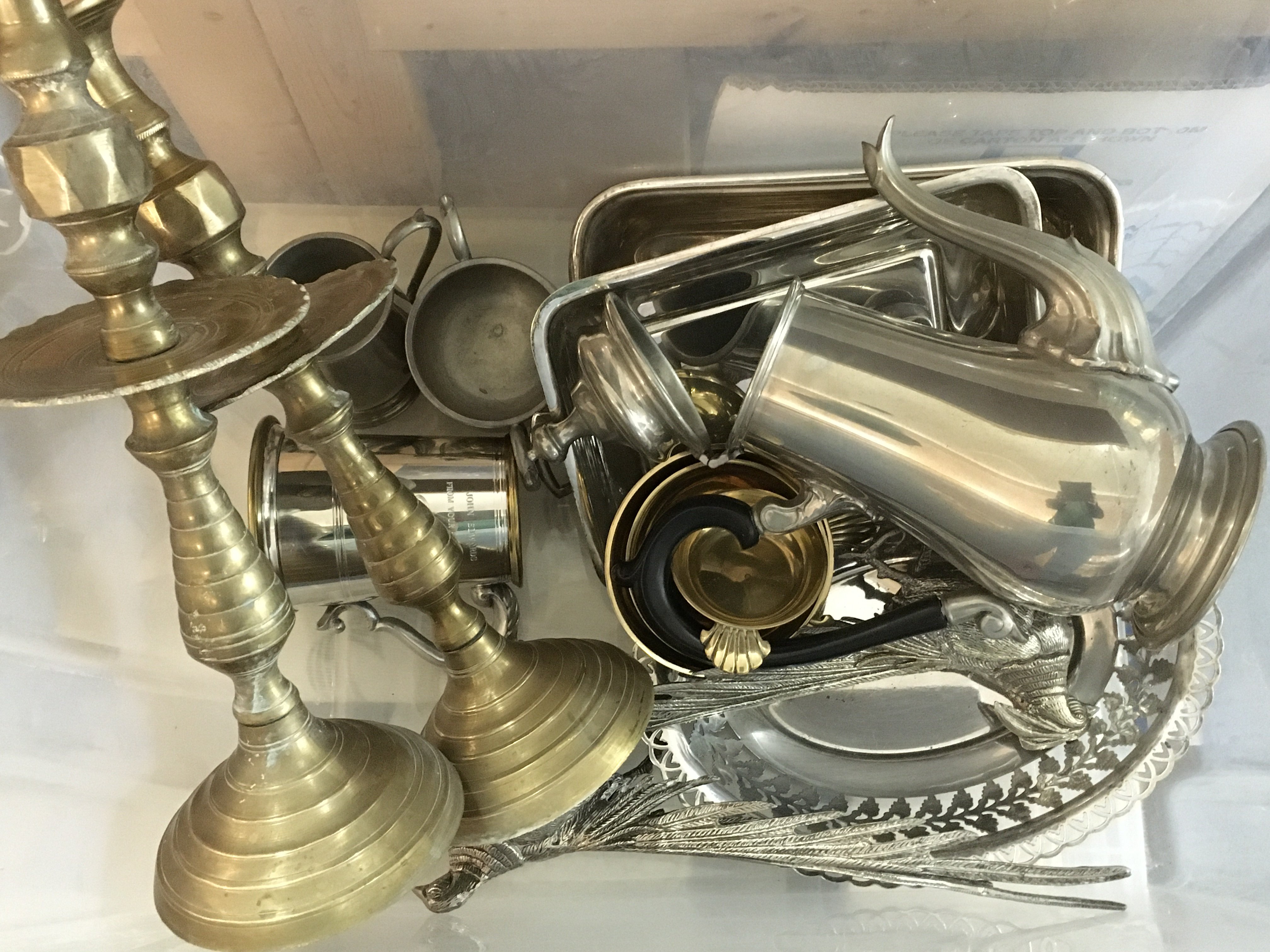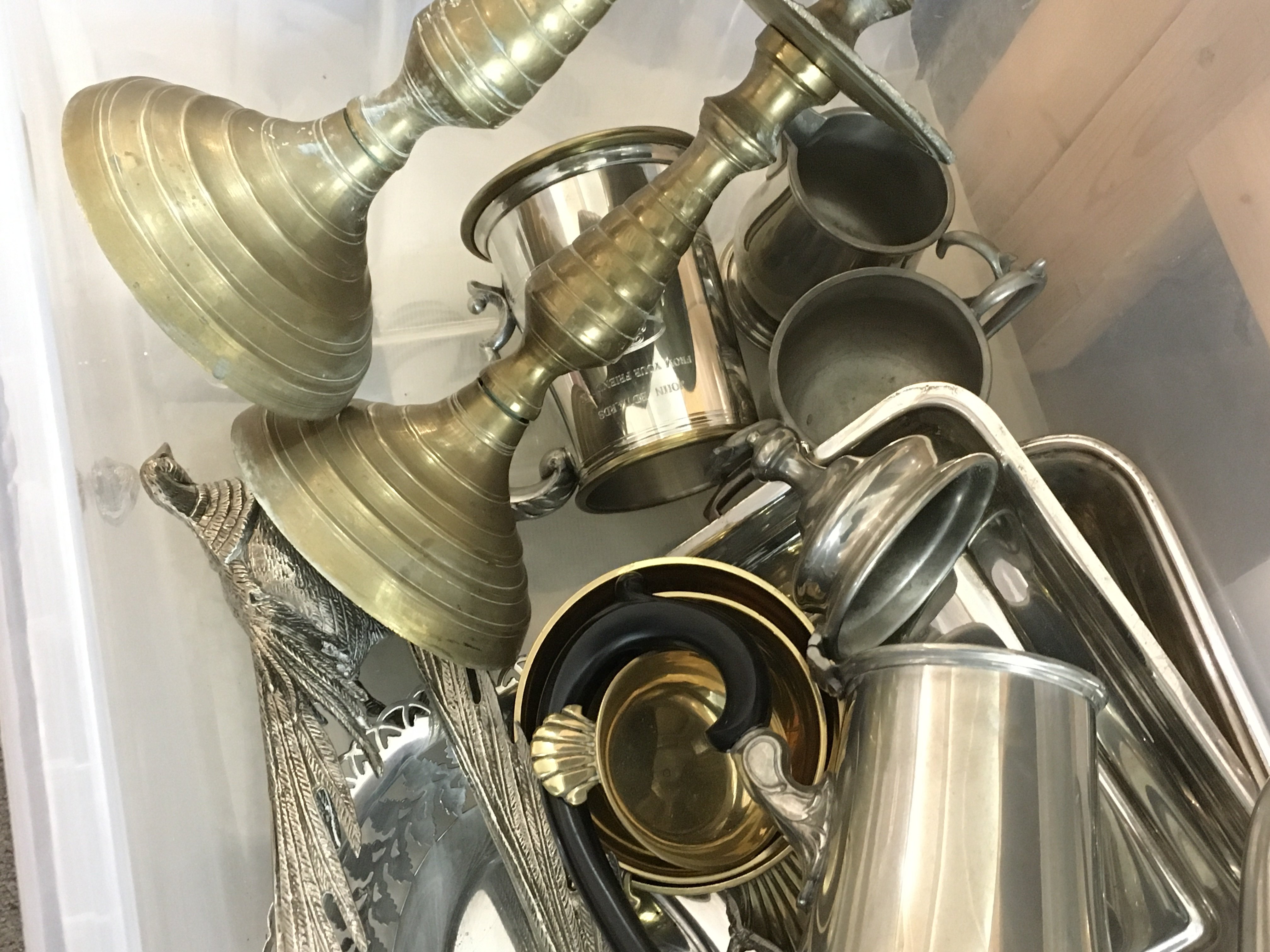 A collection of assorted silver plate and other items including tankards and candle stick holders. Postage C