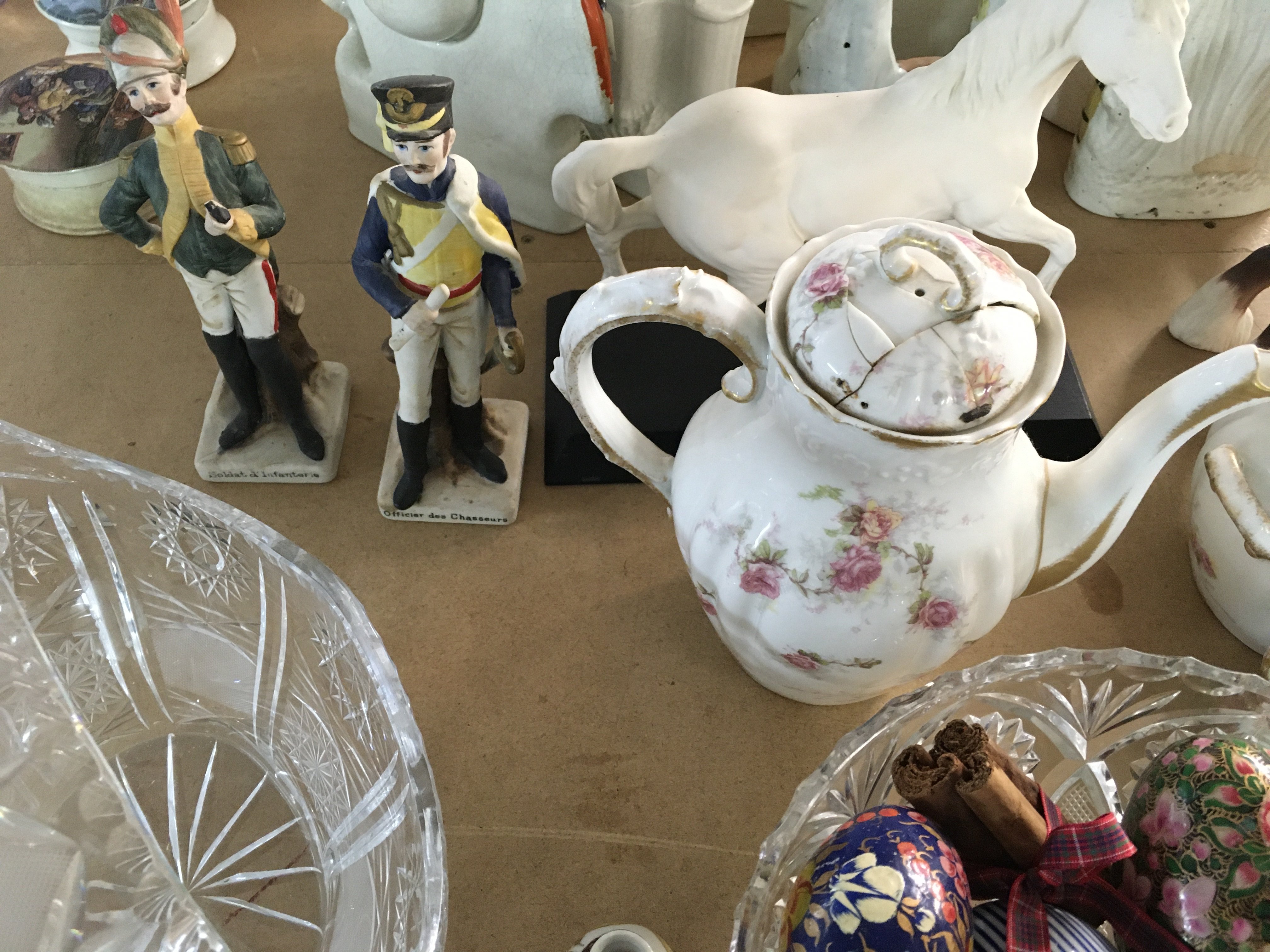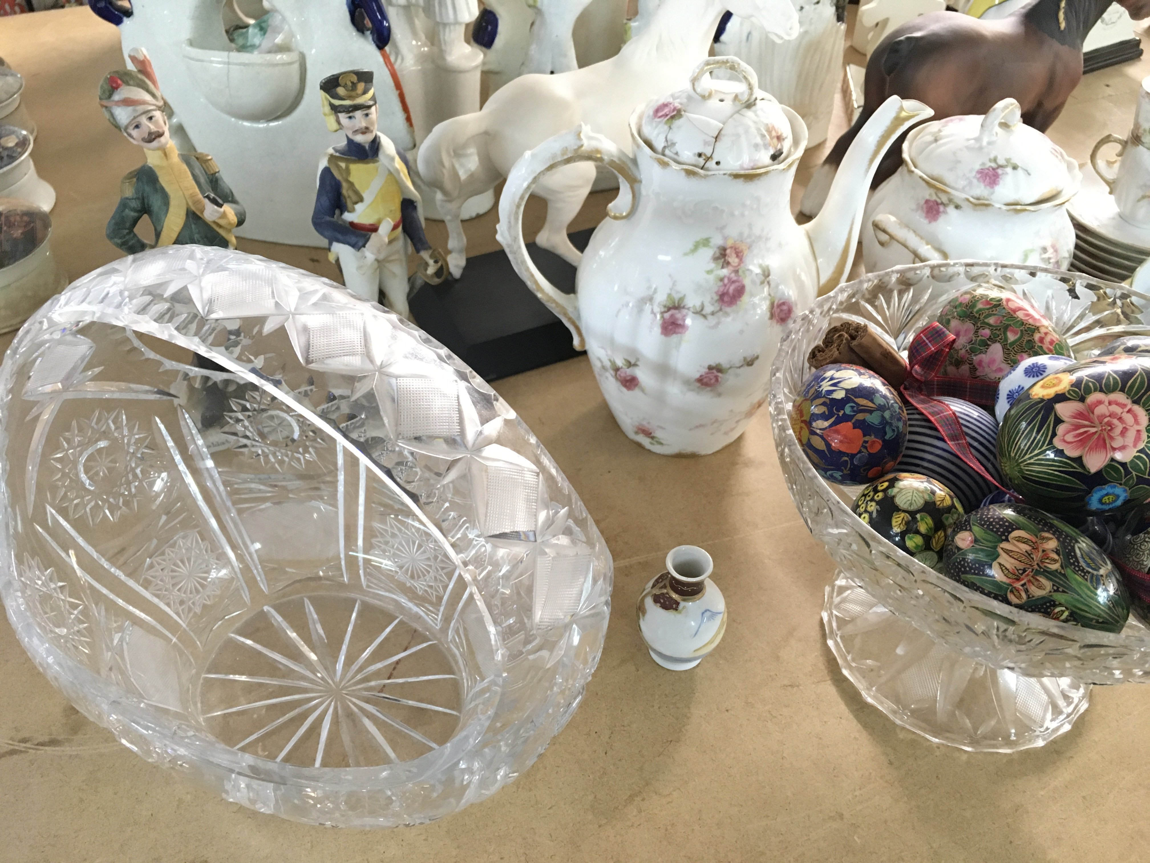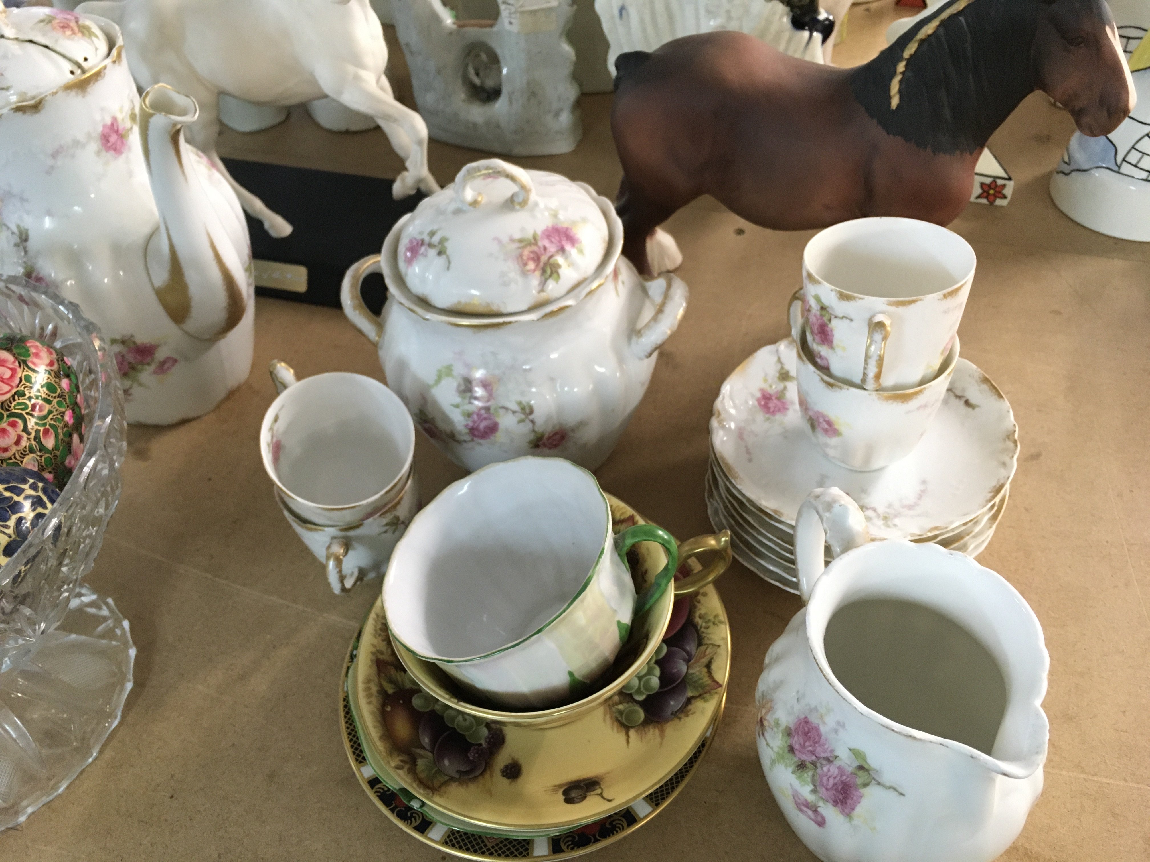 A collection of assorted ceramics and cut glass including cups and saucers horse figurines etc.
