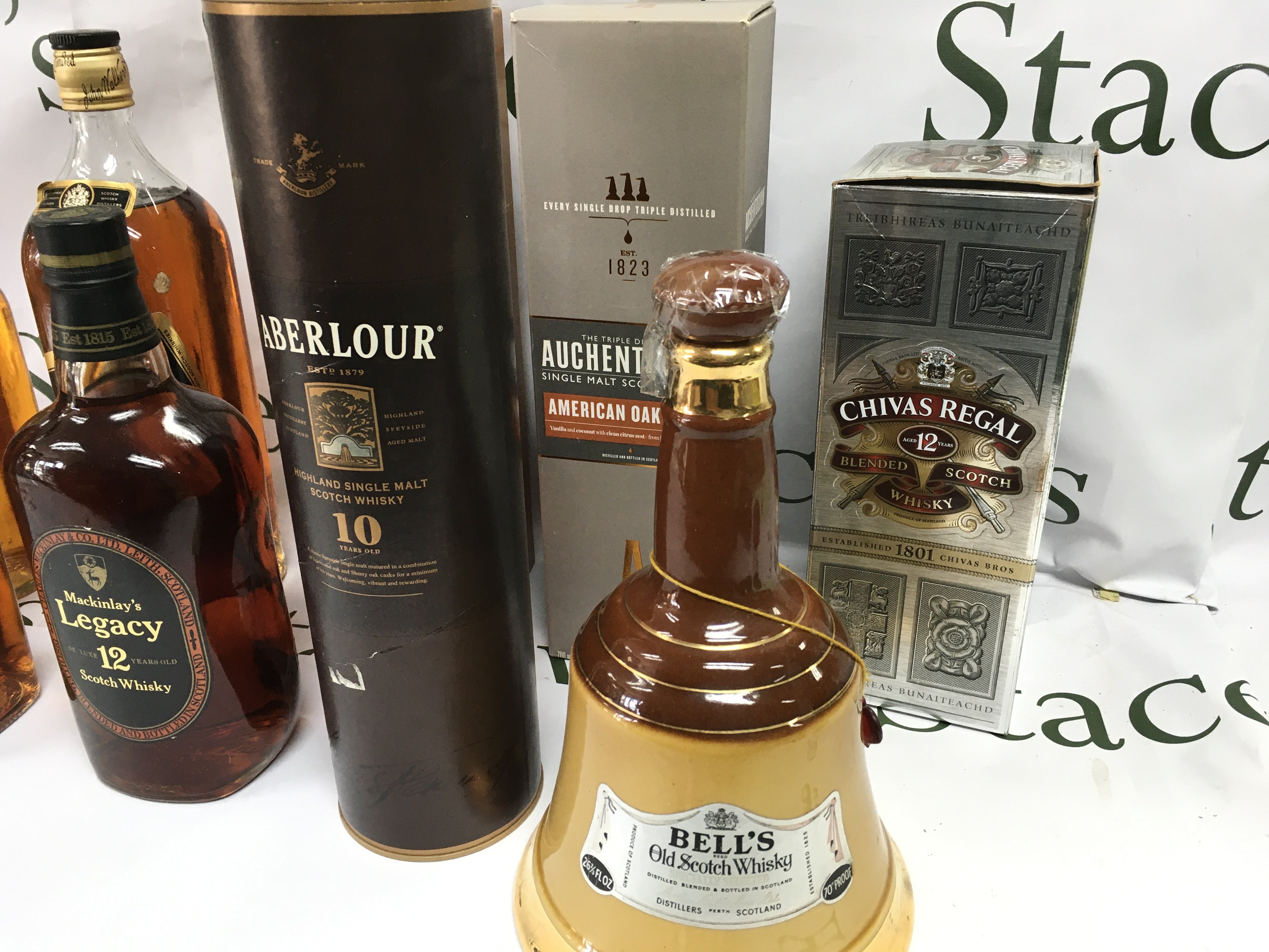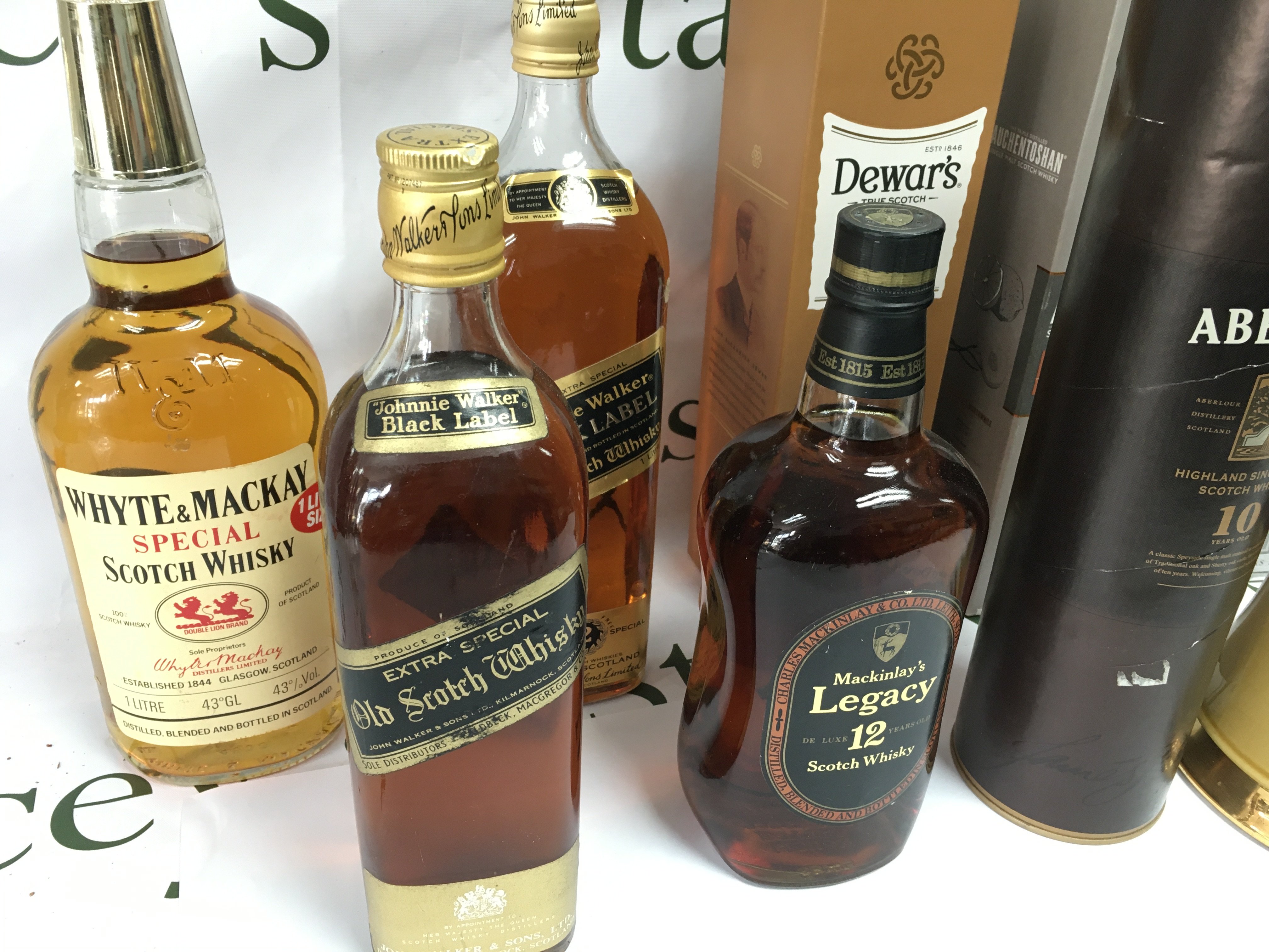A collection of 9 bottles of various whiskey including Dewars Johnnie Walker bells etc